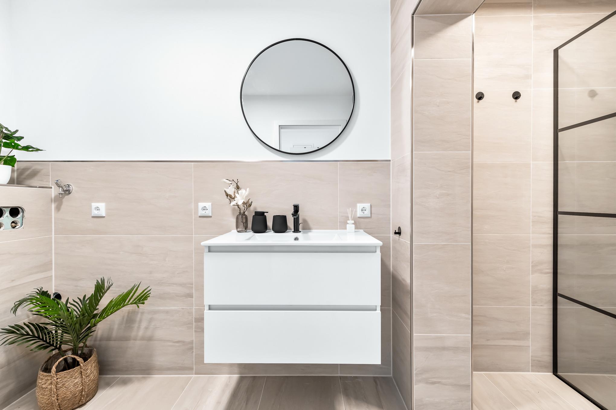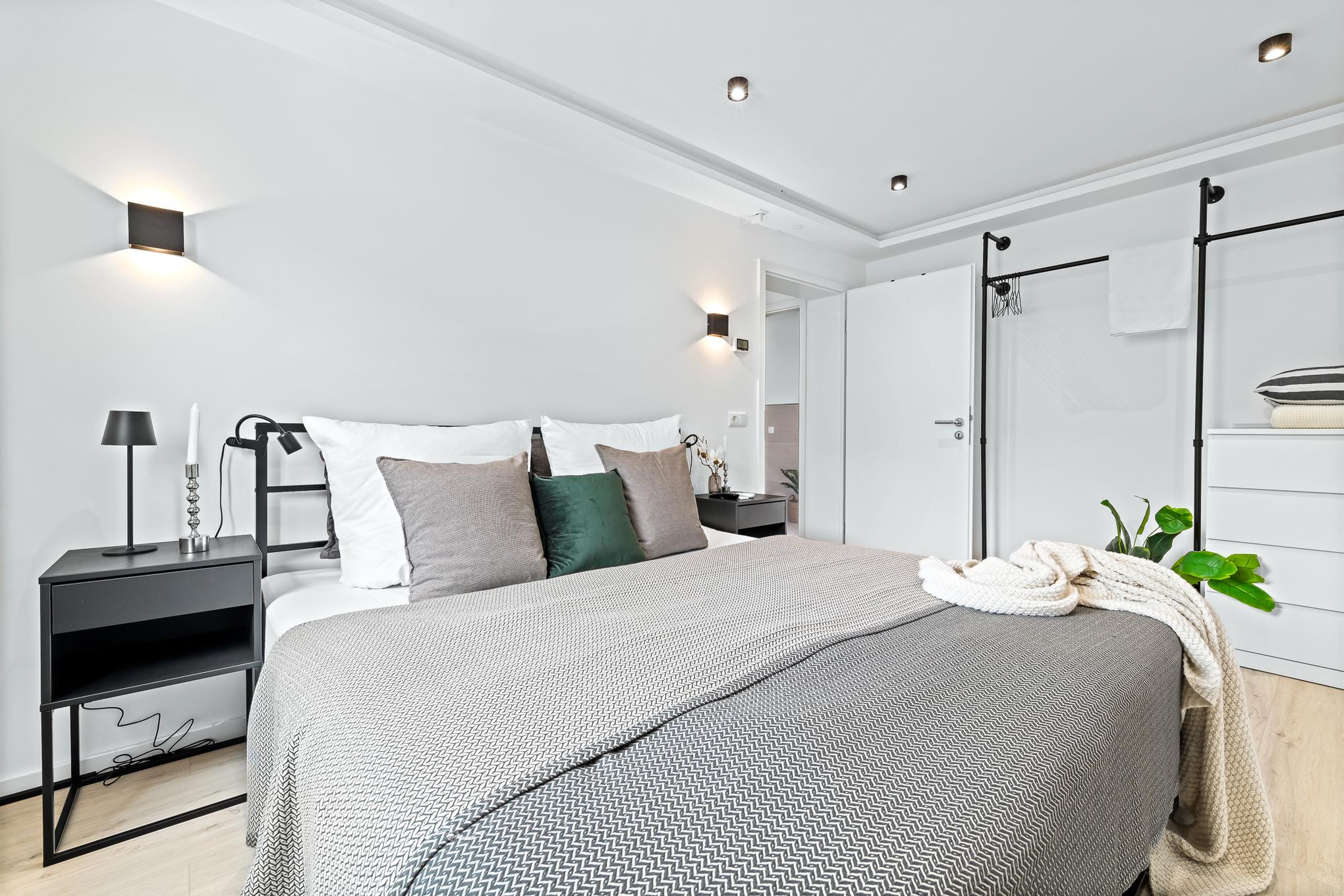 Das gut geschnittene, moderne Duschbad direkt neben dem Schlafzimmer sorgt für weitere Bequemlichkeit. Die ebenerdige Dusche, WC, Waschbecken, Spiegel und ein Handtuchwärmer runden den Raum ab. Für wohlige Stimmung können Sie auch das Licht farblich steuern.