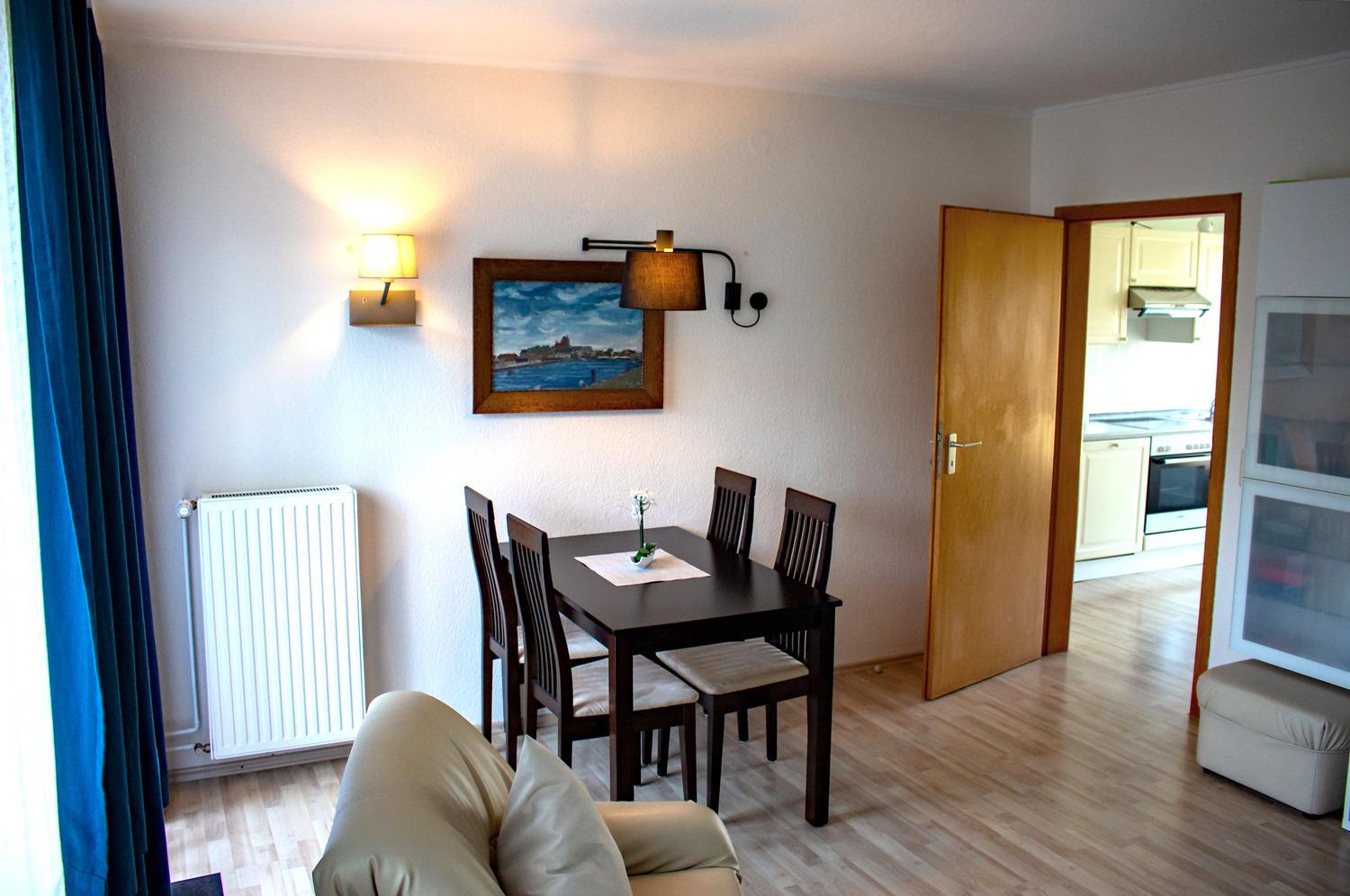 Herzstück der Wohnung ist der freundlich gestaltete Wohnbereich, der mit einer gemütlichen Couch, einem Esstisch sowie einem Fernseher ausgestattet ist. Hier können Sie entspannte Stunden verbringen, den Tag ausklingen lassen oder gemeinsame Mahlzeiten genießen. Die Wohnung besticht insgesamt durch ihr individuelles Flair, das sofort ein Gefühl von Ankommen und Wohlfühlen vermittelt.