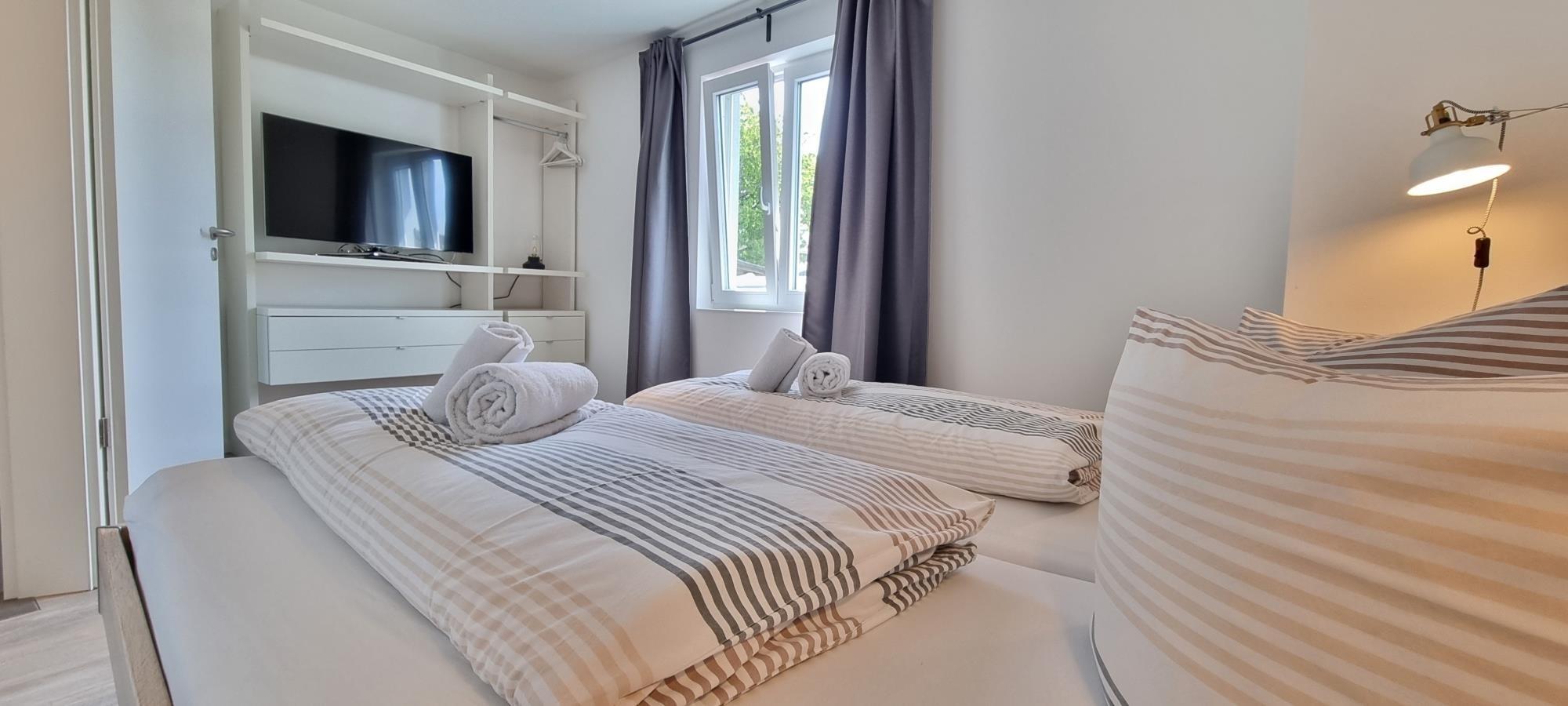 Das Haus verfügt über drei separate Schlafzimmer mit insgesamt zwei komfortablen Doppelbetten (1,80 x 2,00 m) sowie zwei Einzelbetten (0,90 x 2,00 m). Hochwertige Matratzen sorgen für erholsamen Schlaf und machen das Haus zu einem perfekten Rückzugsort nach aktiven Urlaubstagen.