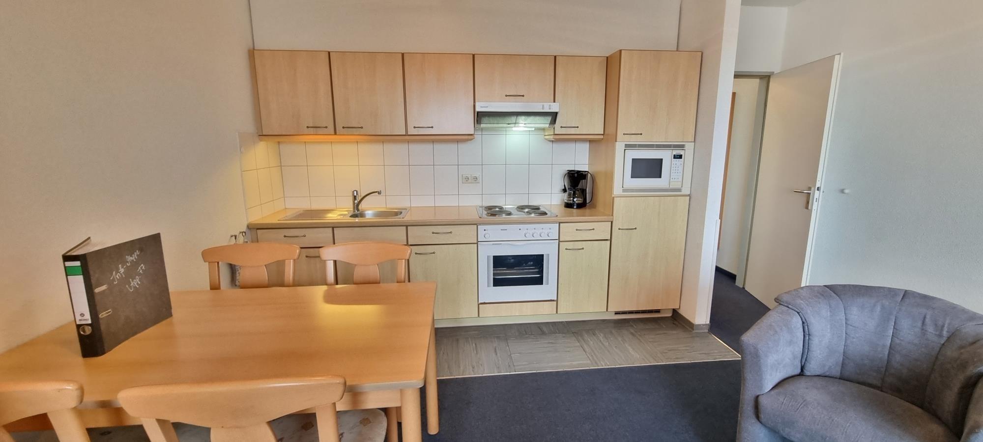 Die offene Küchenzeile mit Essbereich bietet alles, was Sie für entspannte Urlaubstage benötigen – ideal für Selbstversorger. Das moderne Duschbad rundet die funktionale Ausstattung ab.