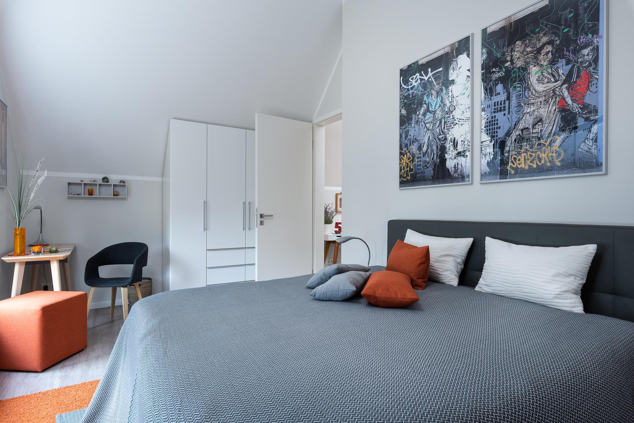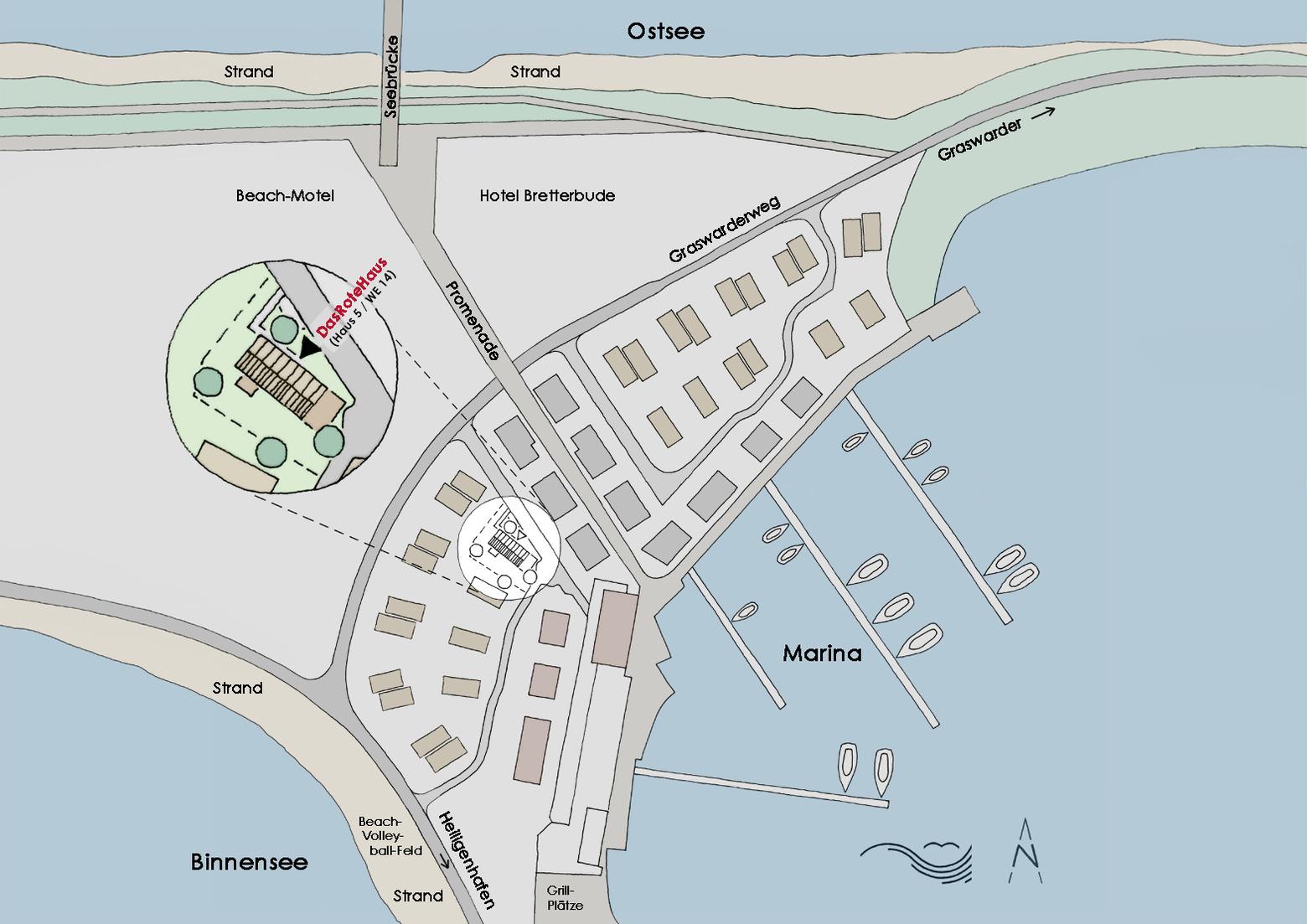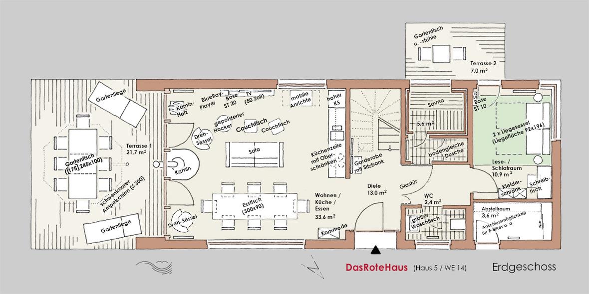 Schon von weitem leuchtet Ihnen das freistehende rote Einzelhaus in zentraler Lage entgegen. Zwei Terrassen sind in einen eigenen, einer Dünenlandschaft nachempfundenen, Garten eingebettet. Innen erwartet Sie auf zwei Etagen eine helle, großzügige Wohnung mit hochwertiger moderner Ausstattung.