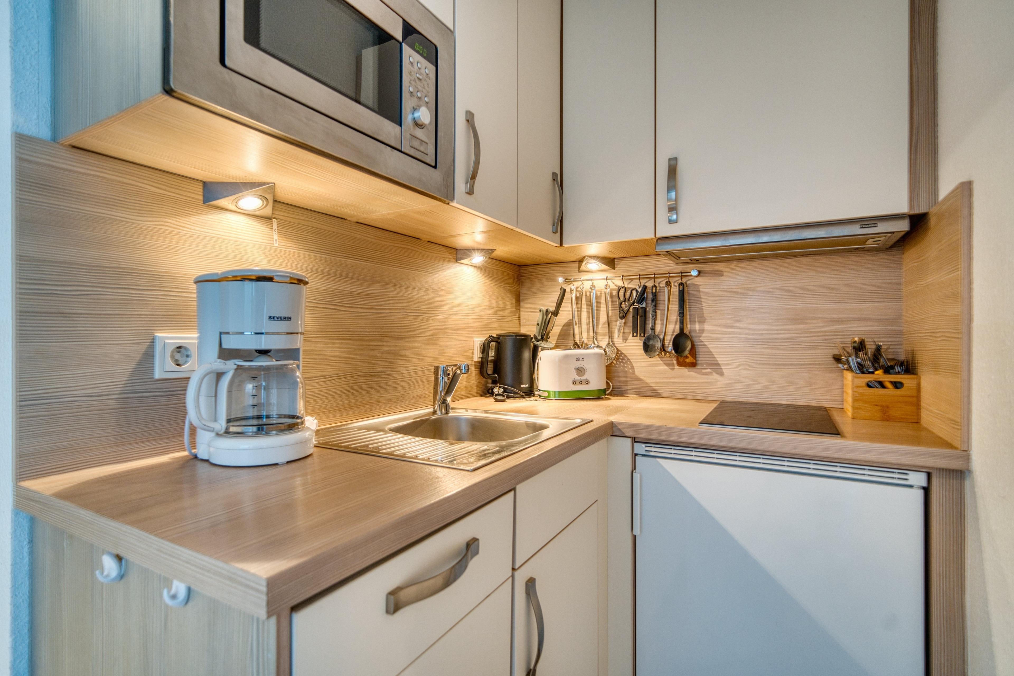 Küche mit Ceranherd, Geschirrspüler, Mikrowelle, Kühlschrank mit Gefrierfach, Toaster [&] Wasserkocher