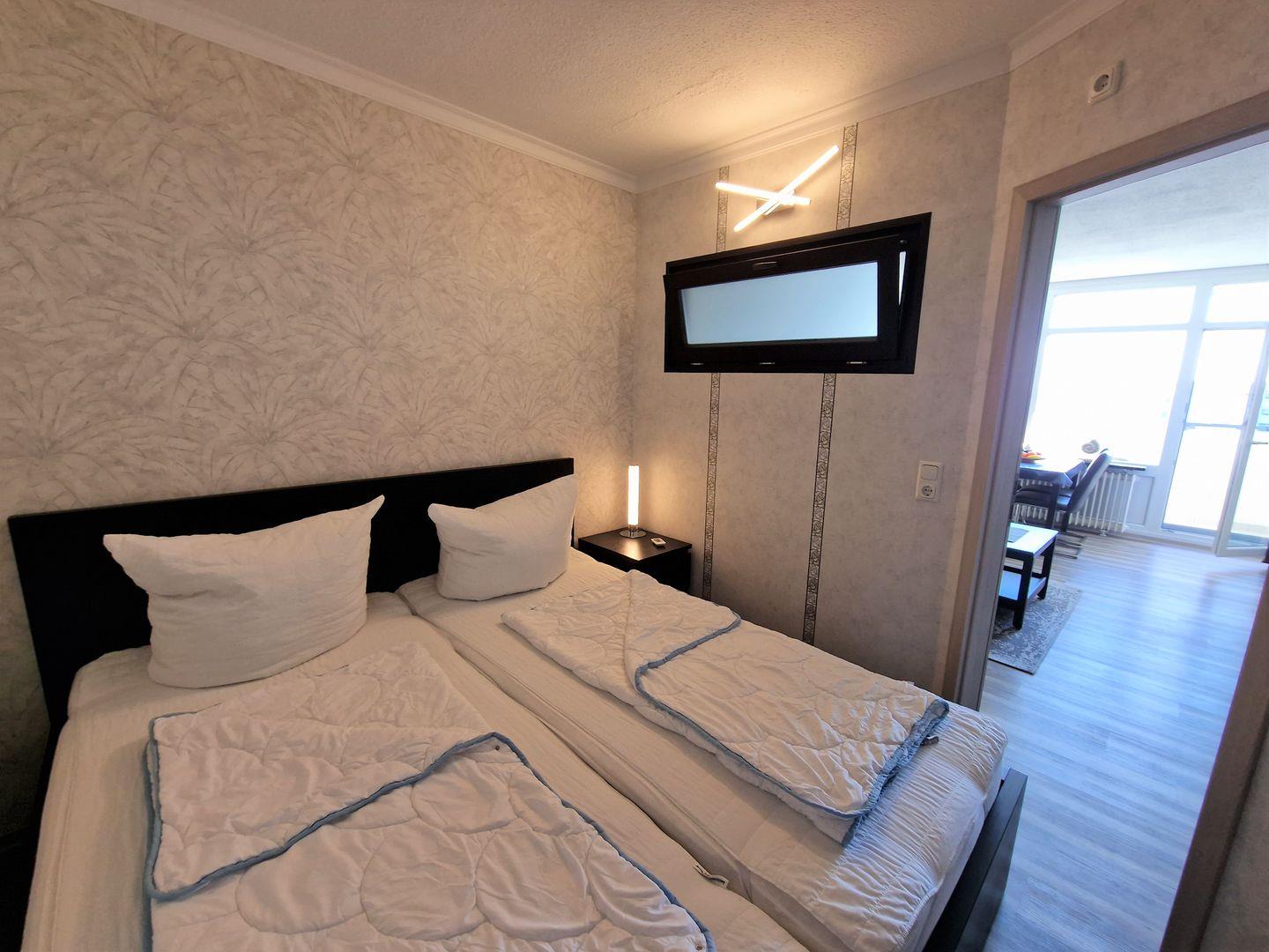 Das Schlafzimmer beherbergt ein 180 cm Doppeltbett. Die Betten sind alle mit Matratzenschutzauflagen ausgestattet, Ersatz gibt es im 2m großen Schlafzimmerschrank.