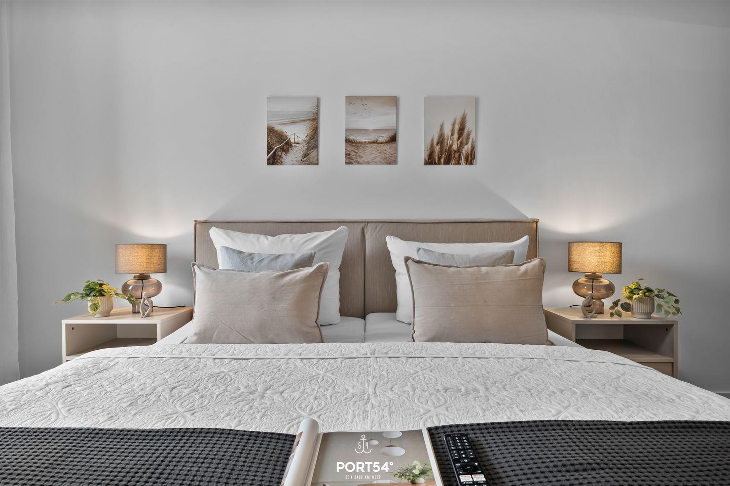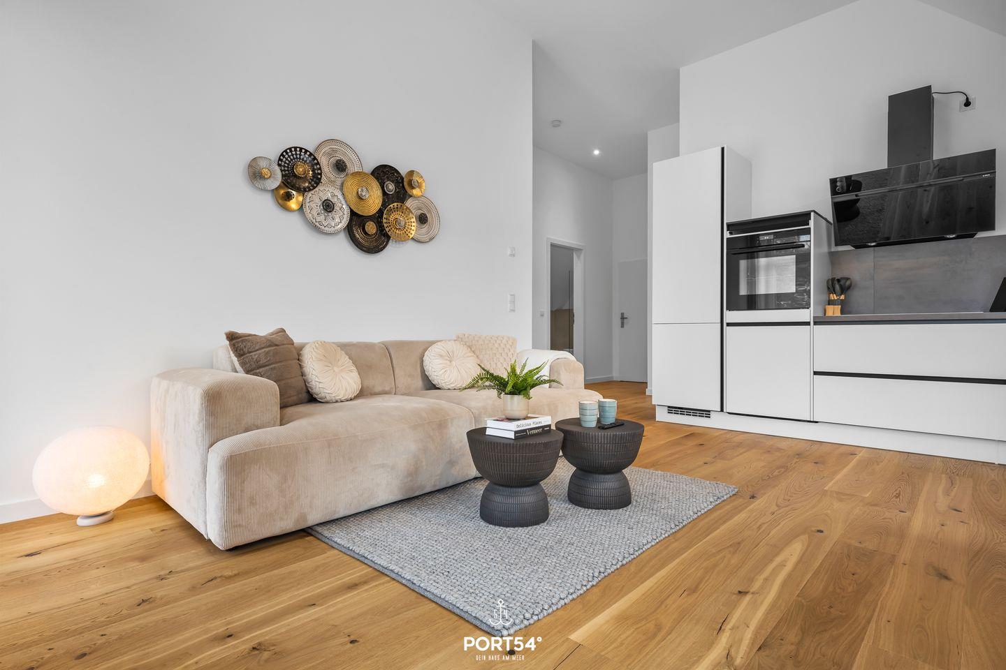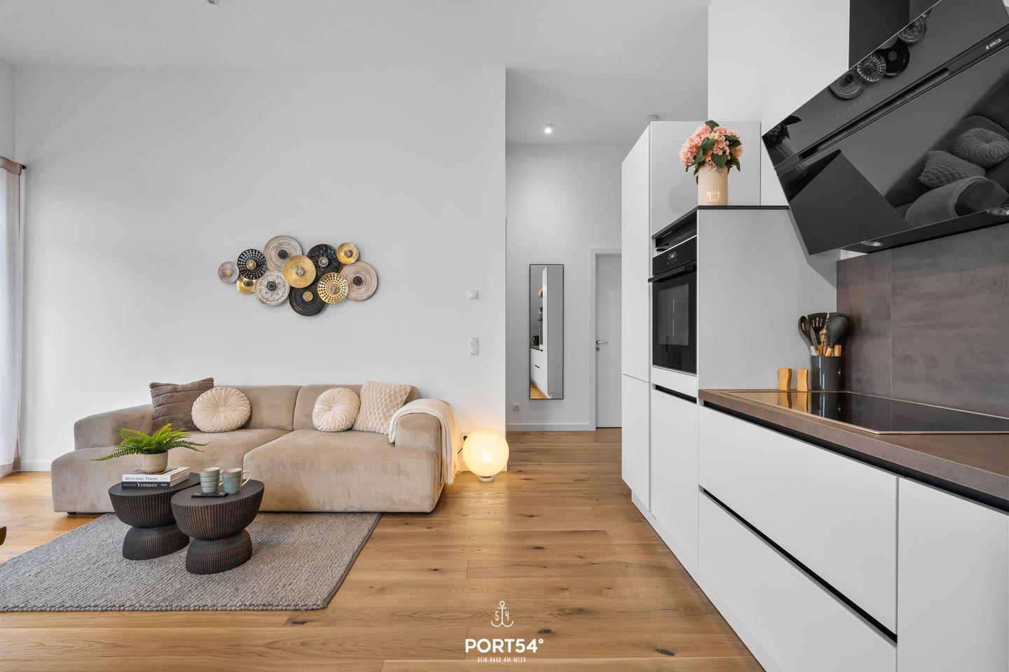 Die Wohnung verfügt über zwei gemütliche Schlafzimmer mit hochwertigen Parkettböden, die für eine erholsame Nachtruhe sorgen. Das geräumige Wohnzimmer besticht durch modernes Design und eine komfortable Couch, auf der du nach einem Tag am Strand entspannt einen Filmabend genießen kannst. Der offene Wohn- und Essbereich lädt zu gemeinsamen Mahlzeiten ein, während die voll ausgestattete Küche vom Induktionskochfeld über Backofen bis zur Spülmaschine alles bietet, um das Kochen zum Vergnügen zu machen.