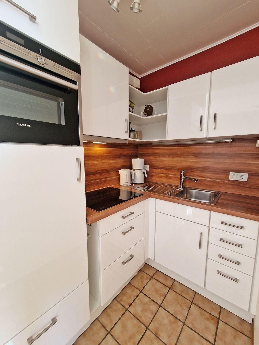 Die neue, moderne Markenküche mit Induktionsfeld, Backofen mit Mikrowellenfunktion und Kühlschrank ist in L-Form gestaltet.