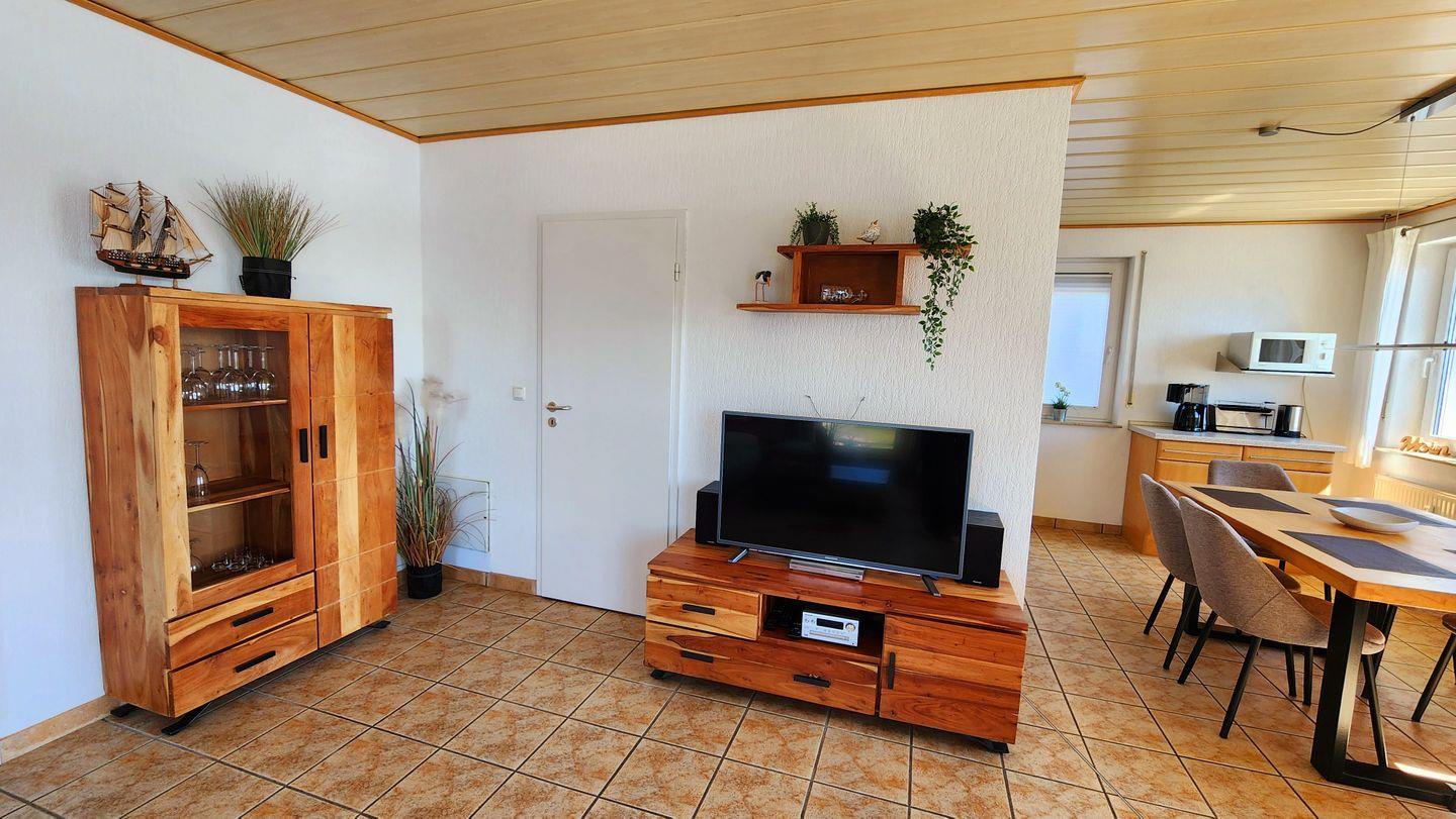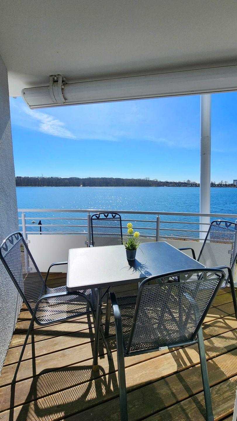 Diese geräumige, gepflegte 3-Zimmer-Wohnung in der 1. Etage mit Balkon und traumhaftem Blick über den Binnensee ist aufgeteilt in Wohnbereich mit gemütlicher Eckcouch, Sessel und Couchtisch.