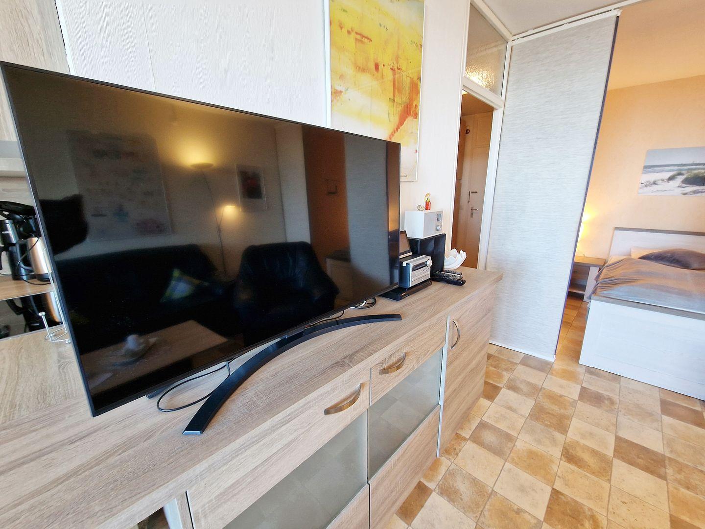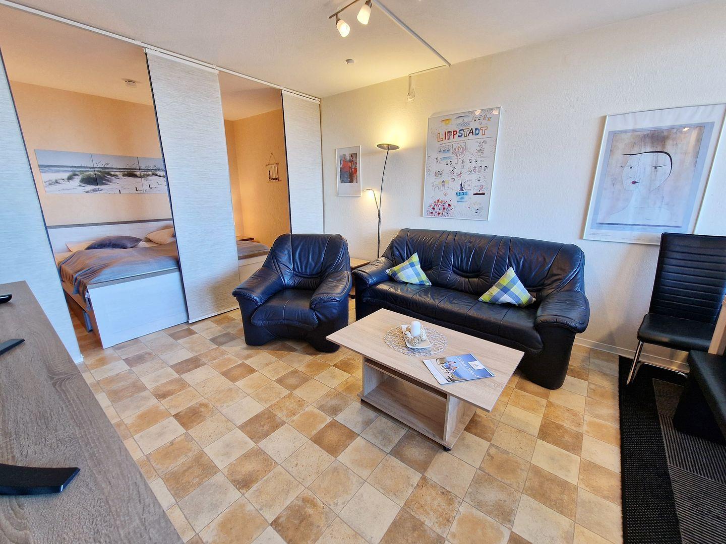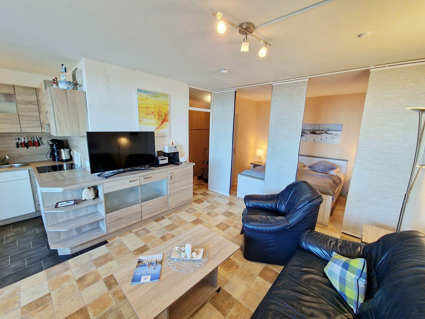 Diese geschmackvoll eingerichtete Ferienwohnung empfängt Sie mit einer hellen und freundlichen Atmosphäre. Die durchdachte Raumaufteilung schafft ein angenehmes Wohngefühl und bietet den idealen Rahmen für erholsame Urlaubstage. Der harmonisch gestaltete Wohnbereich lädt mit komfortablem Sofa, Essplatz und LCD-TV (81cm) zu entspannten Stunden ein – ob beim gemeinsamen Essen oder beim ruhigen Ausklang des Tages. Die integrierte Küche ist funktional ausgestattet und ermöglicht eine unkomplizierte Selbstversorgung. Ein besonderes Highlight ist der kleine Balkon in Nordausrichtung: Von hier aus genießen Sie den Blick auf die Ostsee und die Salzwiesen. Gerade in den Morgen- und Abendstunden entsteht hier eine wunderbar ruhige Atmosphäre – ideal für eine Tasse Kaffee oder ein Glas Wein mit Ausblick. Der Schlafbereich bietet eine angenehme Rückzugsmöglichkeit und sorgt für erholsame Nächte. Die Wohnung eignet sich hervorragend für Paare oder kleine Familien, die Wert auf eine gepflegte und wohnliche Unterkunft legen. Die Einrichtung ist harmonisch aufeinander abgestimmt und mit viel Liebe zum Detail gewählt. Der markante Bodenbelag im Schachbrettmuster in warmen Brauntönen setzt einen eigenständigen Akzent und verleiht der Wohnung eine individuelle Note. Funktional fügt er sich selbstverständlich in das Gesamtbild ein und beeinträchtigt den Wohnkomfort in keiner Weise. Selbstverständlich stehen Ihnen kostenfreies WLAN sowie ein eigener, kostenfreier Parkplatz zur Verfügung, sodass auch in praktischer Hinsicht für einen entspannten Aufenthalt bestens gesorgt ist. Eine einladende Ferienunterkunft mit persönlichem Charme und schönem Ausblick – ideal für eine entspannte Auszeit am Meer.