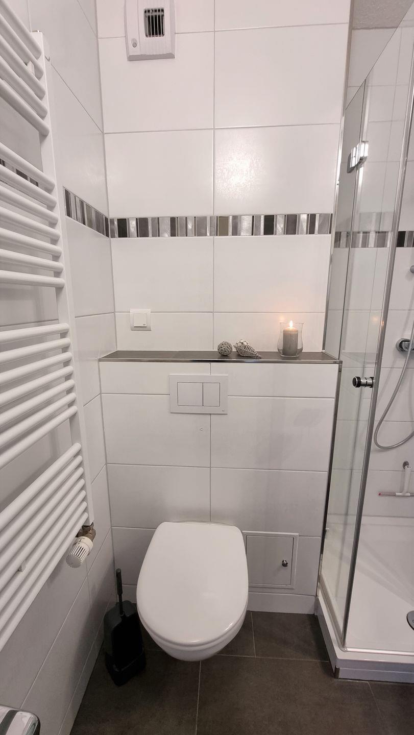 Ihnen steht ein schickes, modernes Bad mit einem WC und Dusche (Duschkabine, flacher Einstieg) zur Verfügung.