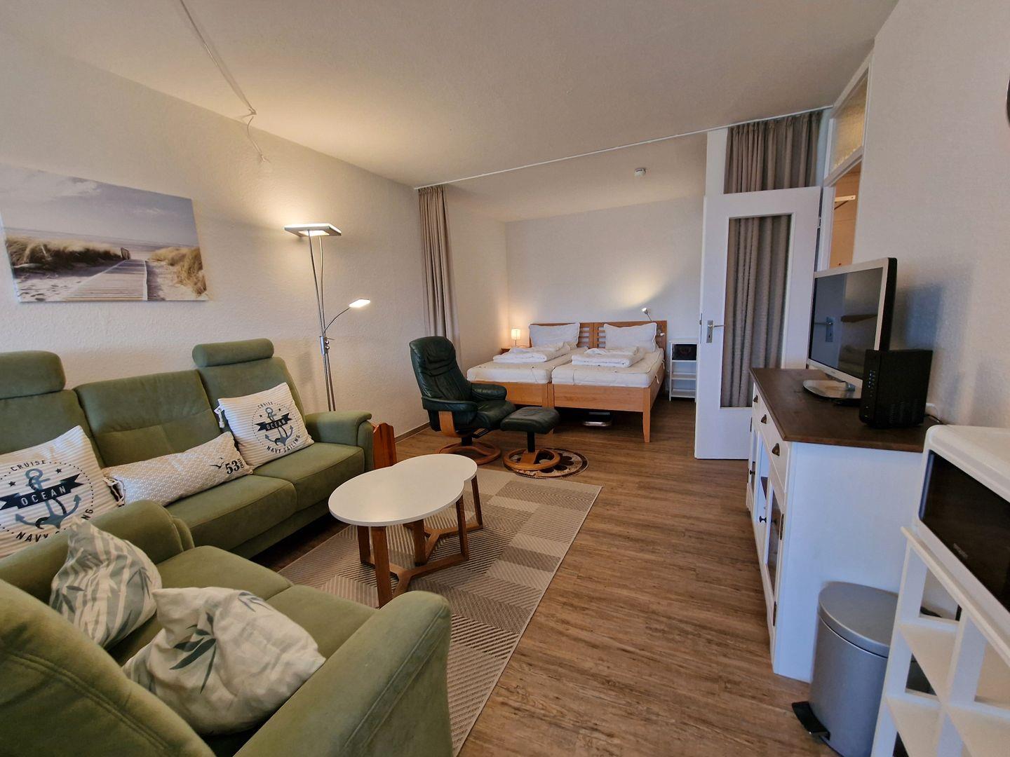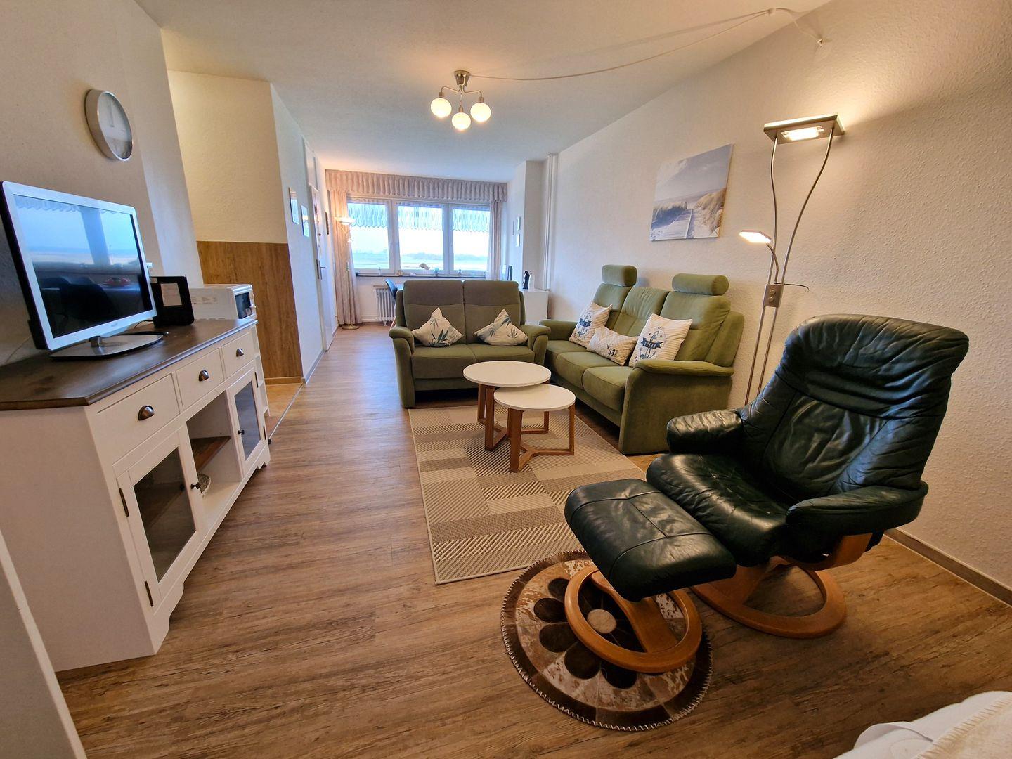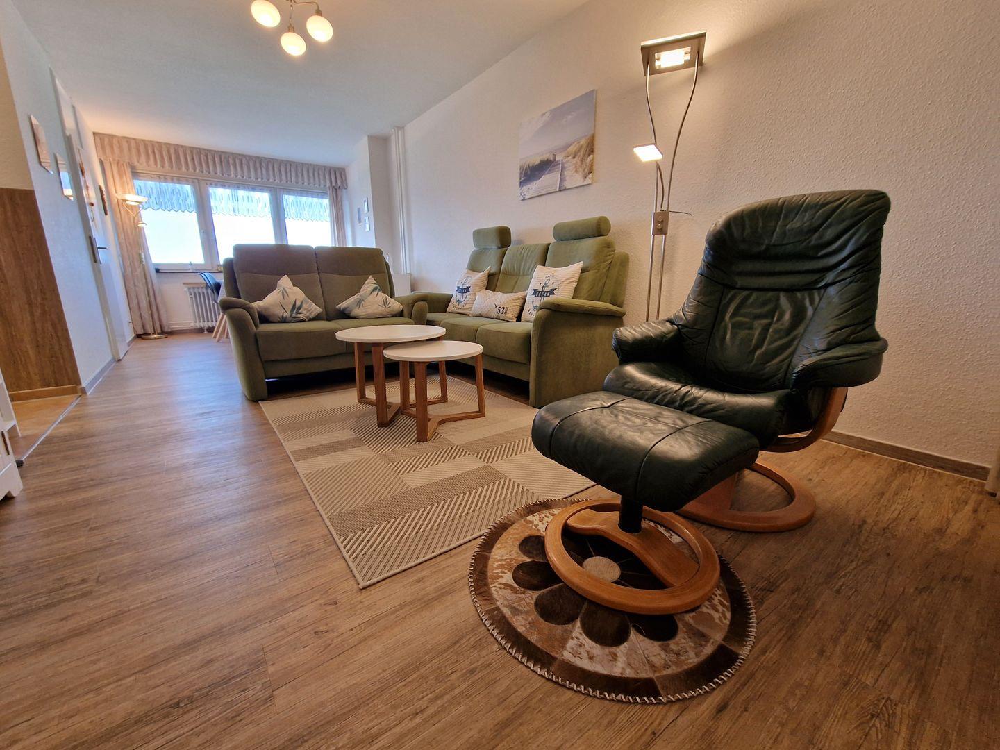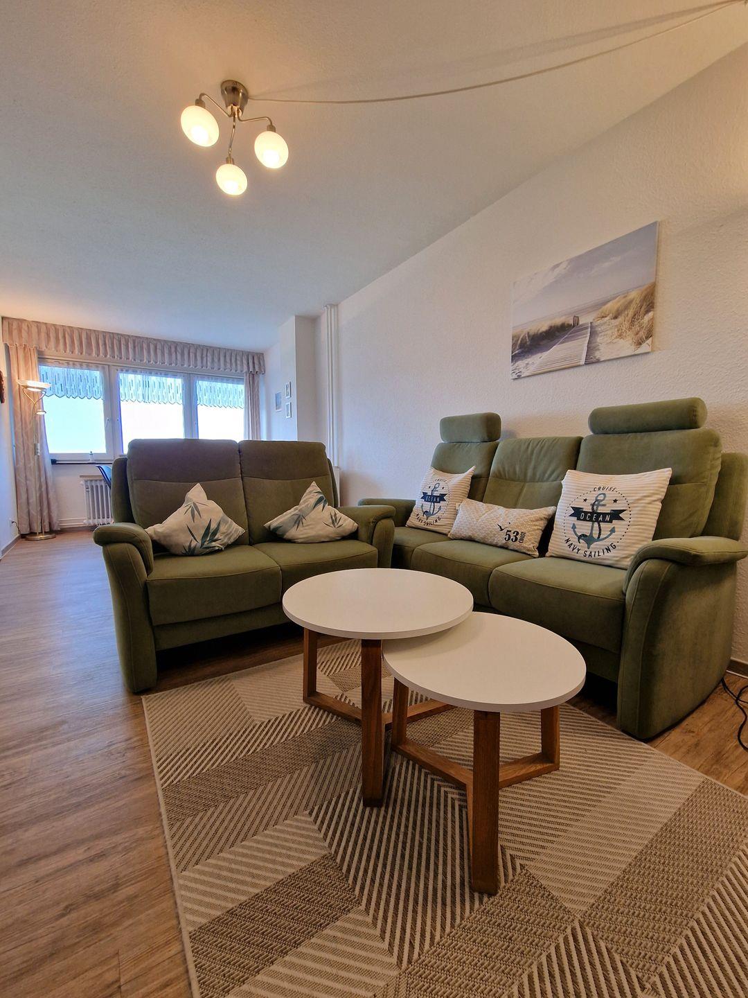 Der Wohnbereich ist mit einem 2er und 3er Sofa und einem Sessel ausgestattet.
