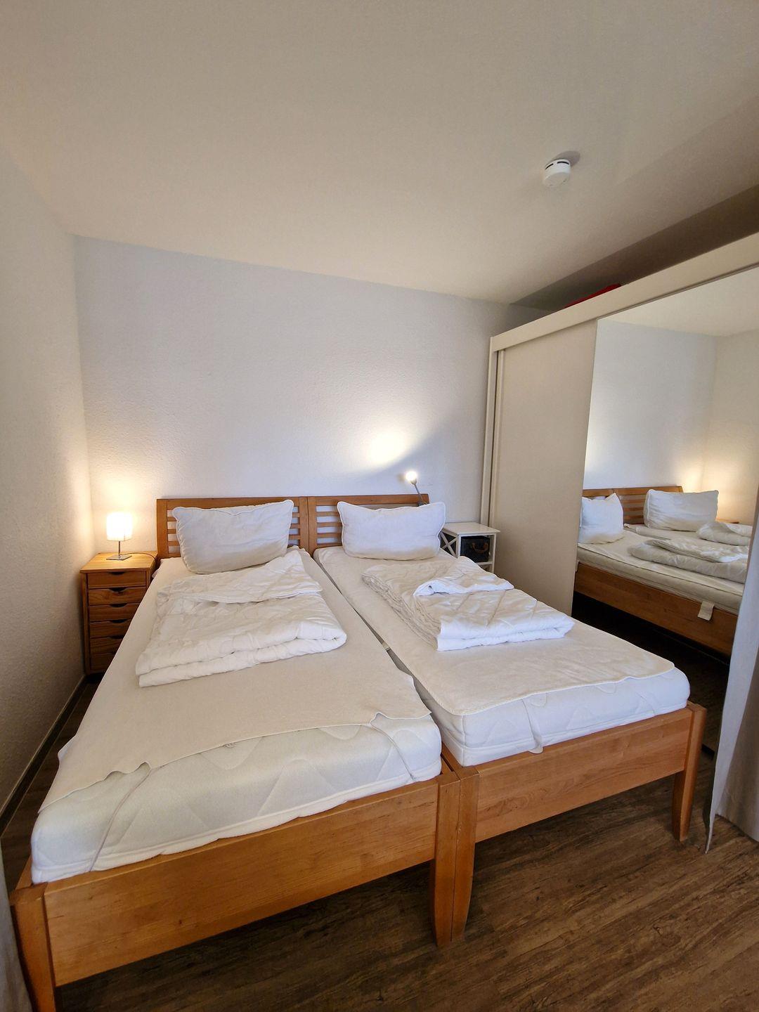 Im Schlafbereich befindet sich ein Doppelbett und ein Kleiderschrank.