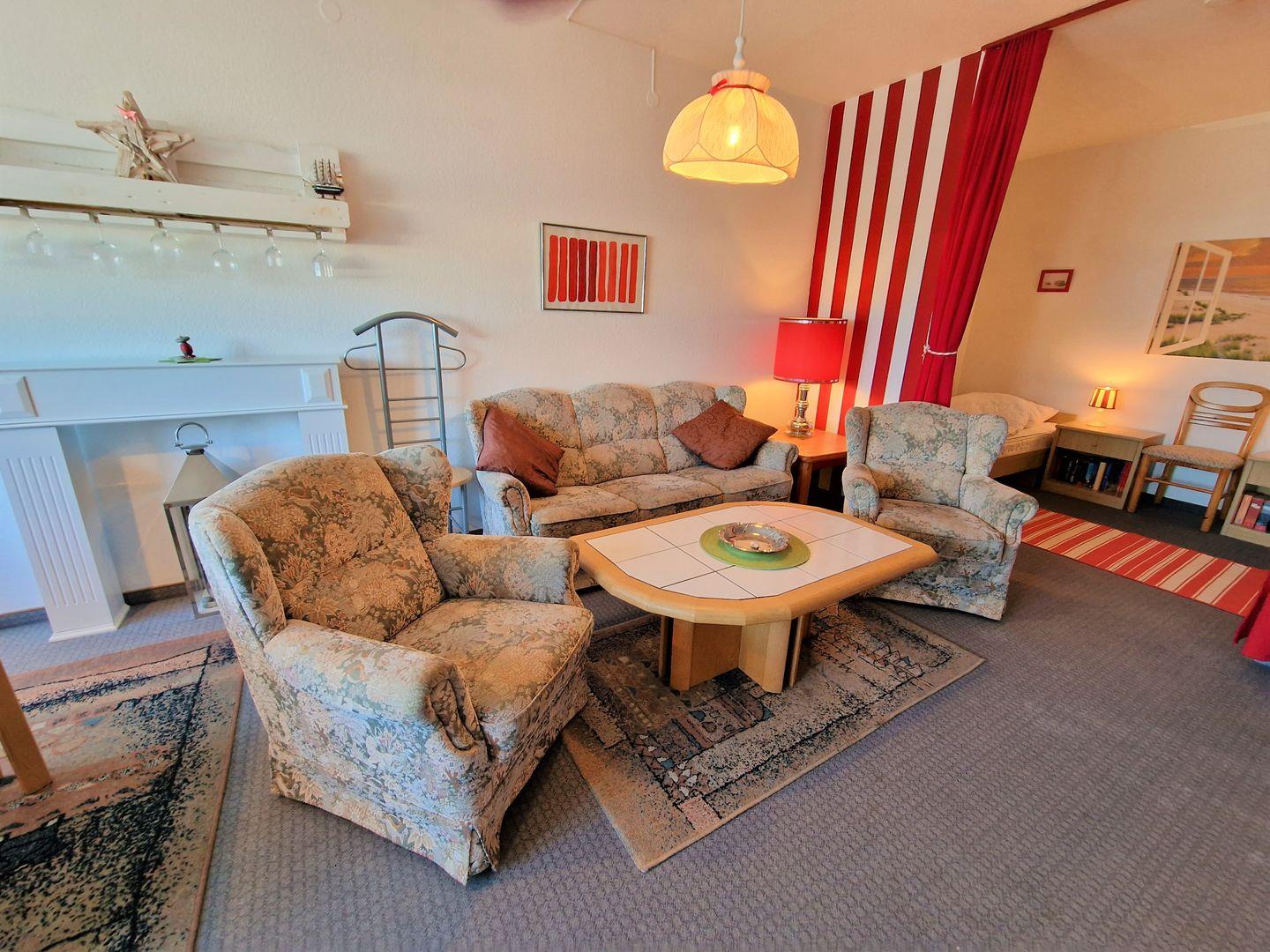 Wohnraum mit einer 3er Couch und 2 Sessel, TV.