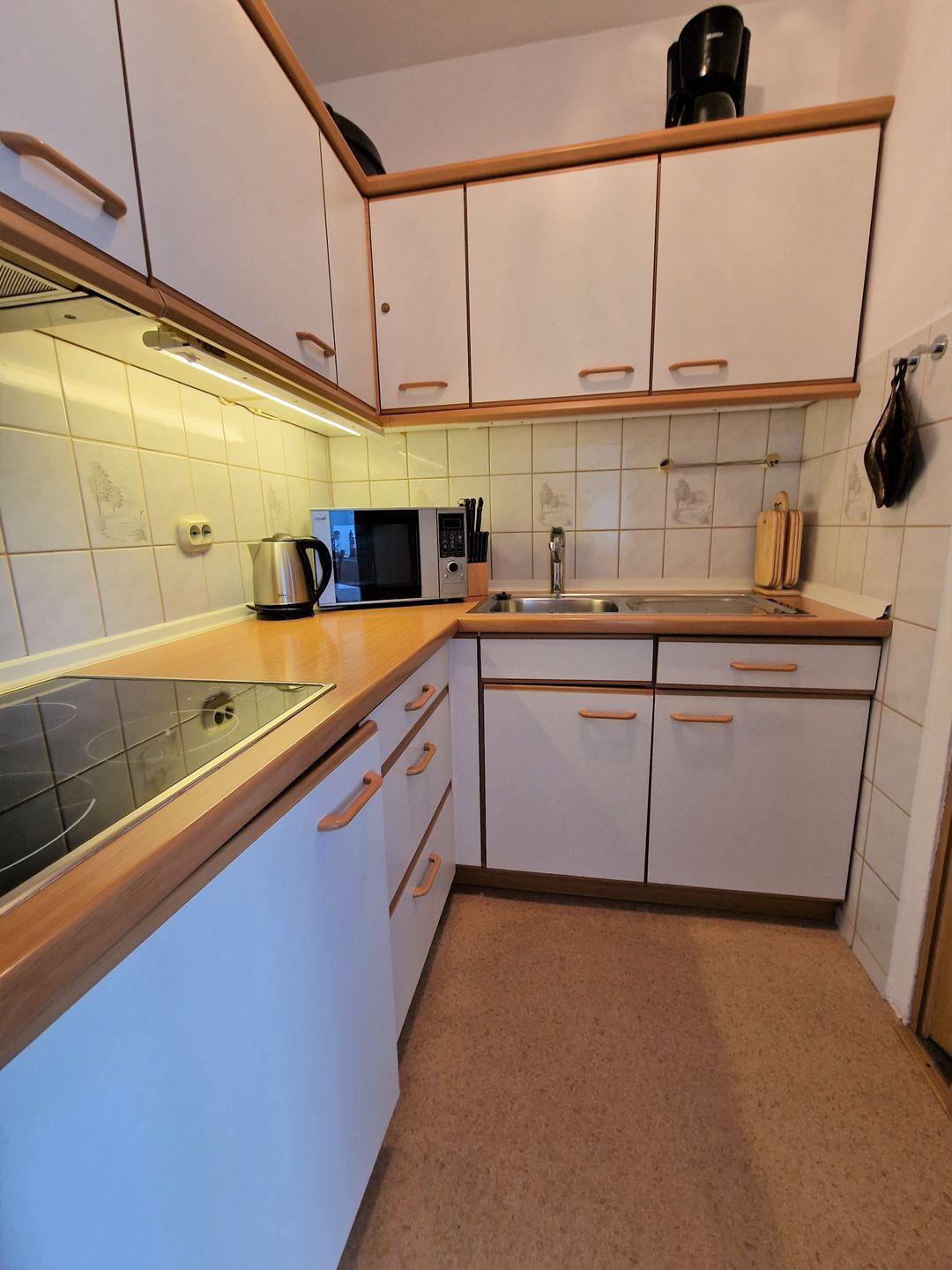 Offen gestalteter Küchenbereich mit 4-Plattenherd, Mikrowelle, Kühlschrank mit Gefrierfach und Kaffeemaschine.