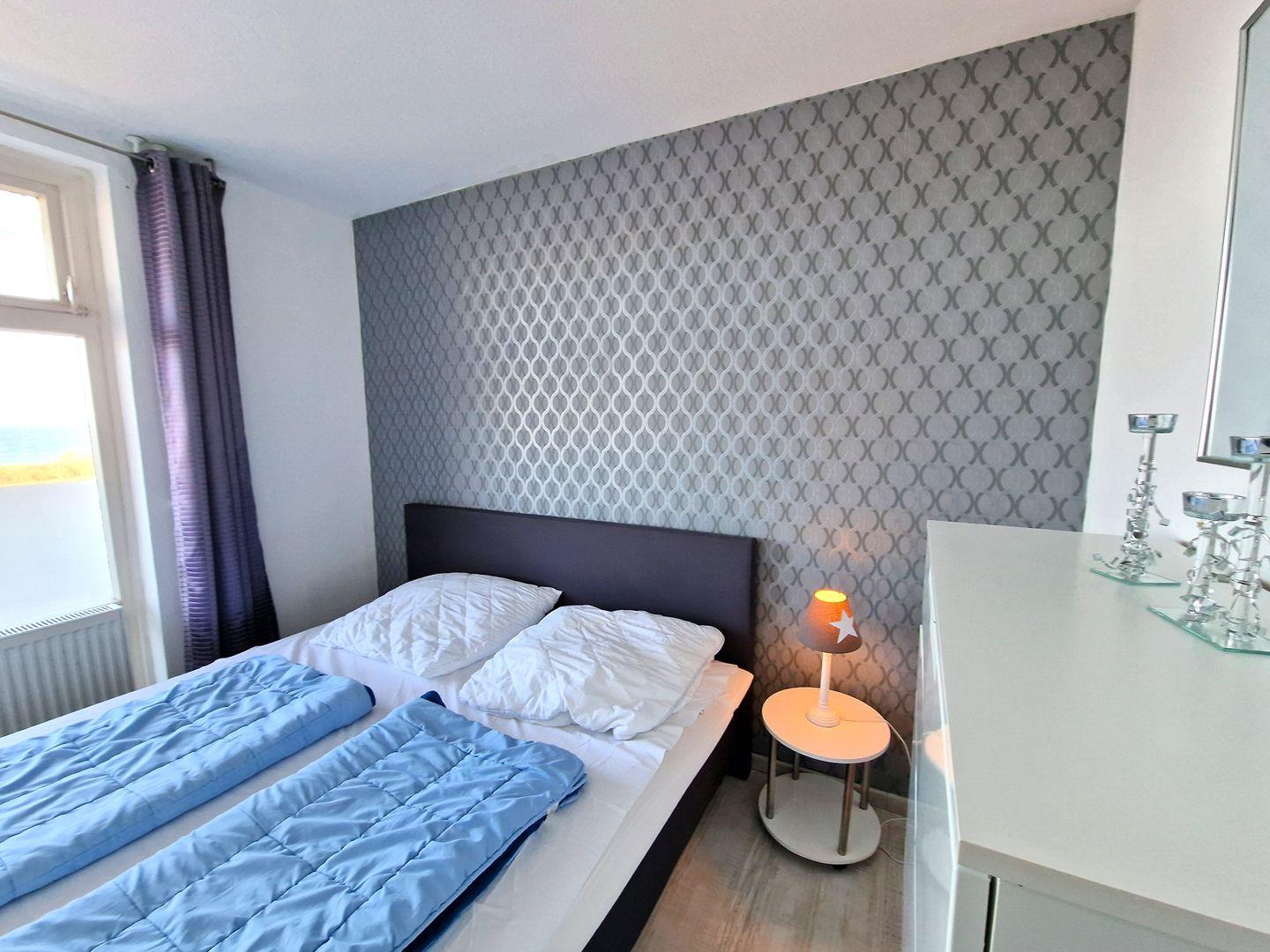 Gleich rechts davon gelegen, befindet sich das separate Schlafzimmer mit großem Boxspringbett (durchgängige Matratze 180*200) und tollem Panoramafenster (zu öffnen).