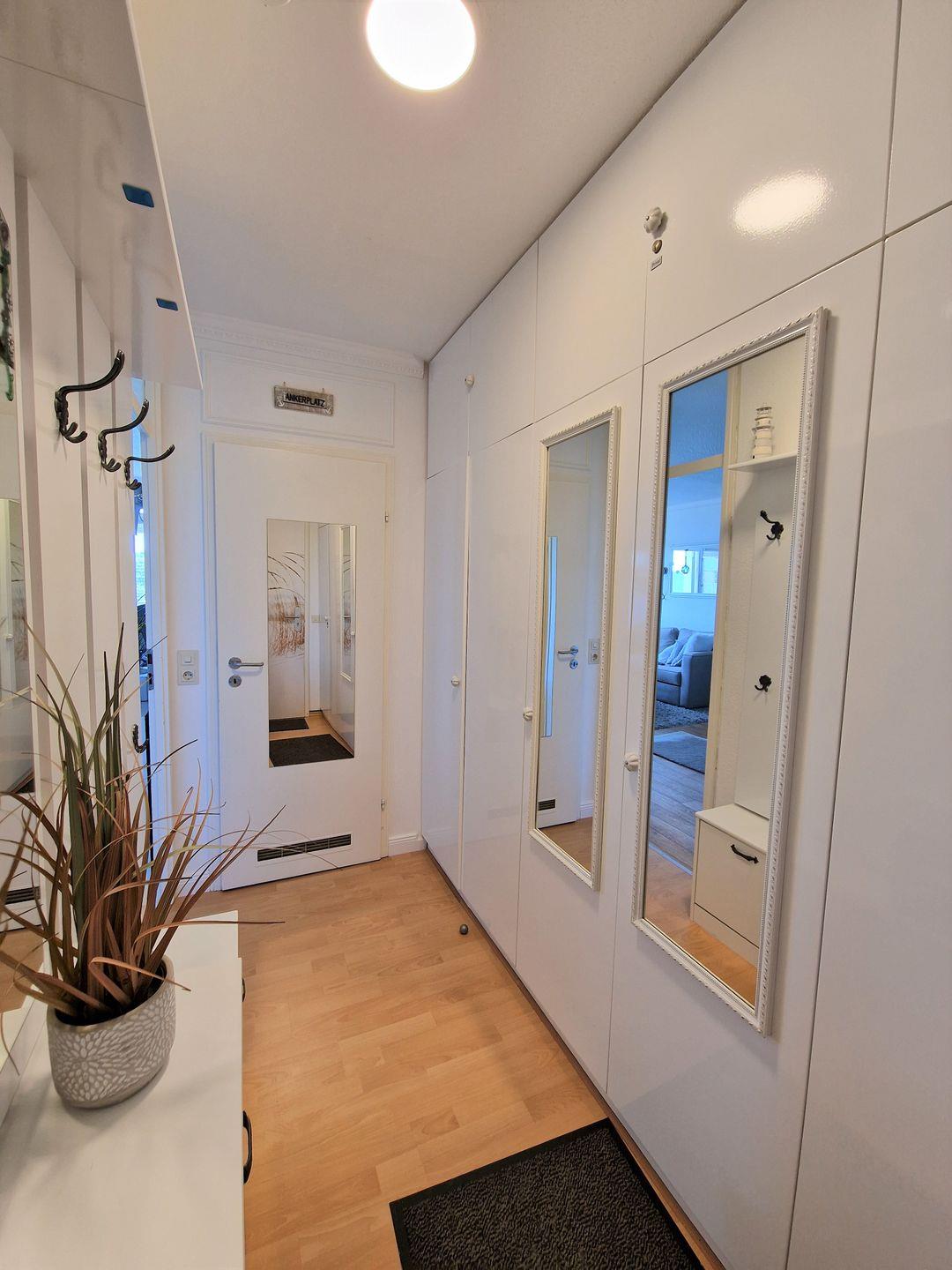 Schöne und sehr harmonisch eingerichtete Ferienwohnung mit PVC in Dielenoptik in der 4. Etage und sonnigem Balkon zur Süd-Ostseite.