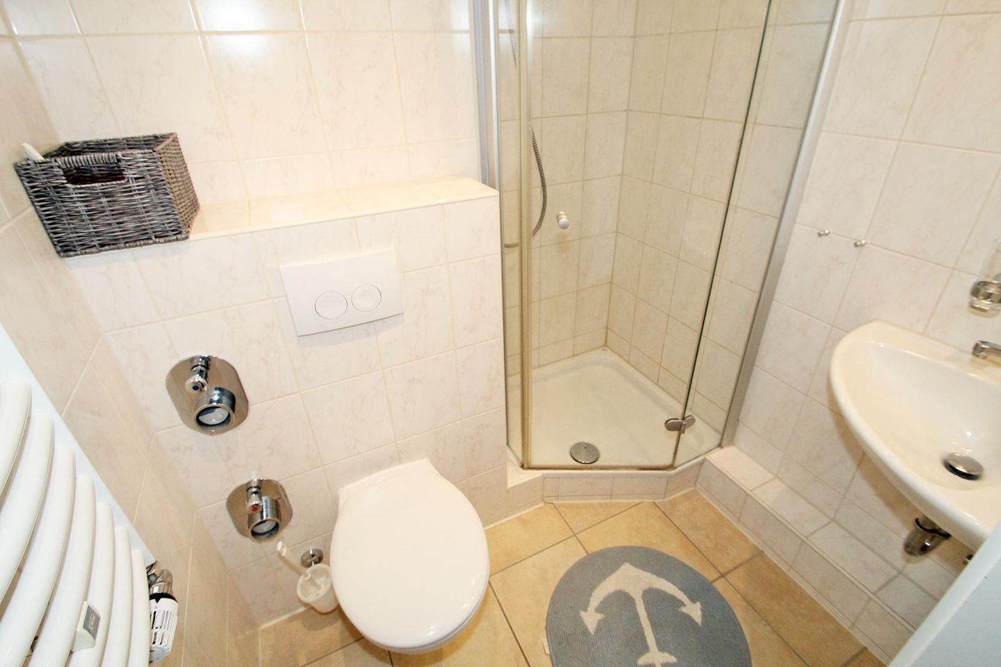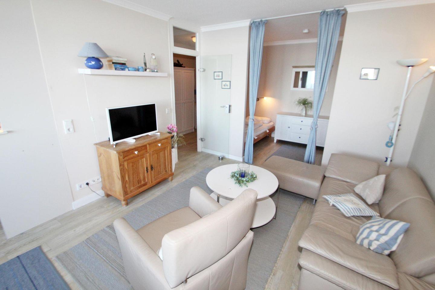 Der Wohnbereich ist mit einer bequemen Ledergarnitur ausgestattet, die bei Bedarf auch als Schlafmöglichkeit für eine weitere Person genutzt werden kann. Ergänzt wird der Raum durch einen gemütlichen Sessel, einen Fernseher sowie eine Musikanlage mit CD-Player – perfekt für entspannte Abende nach einem Tag am Meer. Die Essecke liegt direkt am Fenster und lädt zu gemeinsamen Mahlzeiten mit Blick nach draußen ein. Die kompakte Küche ist funktional eingerichtet und bietet alles, was Sie für die Zubereitung Ihrer Mahlzeiten benötigen. Neben einem 4-Platten-Herd stehen Ihnen ein Kühlschrank mit Gefrierfach, ein Minibackofen sowie praktische Küchengeräte wie Kaffeemaschine, Wasserkocher und Toaster zur Verfügung.