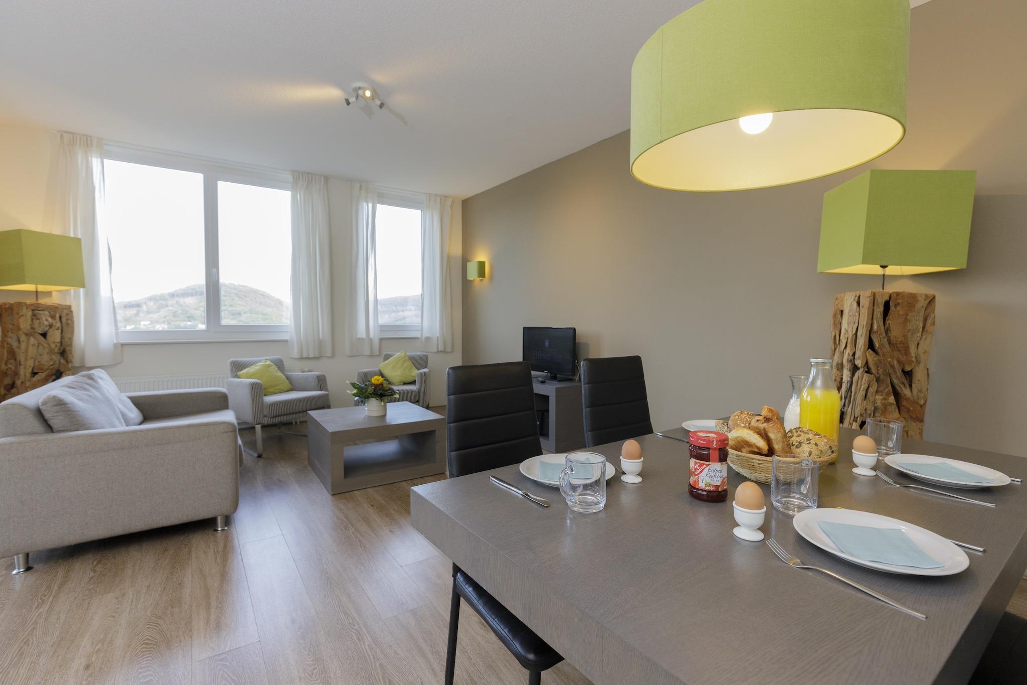 Moderne komfort i naturen Bo i en vakkert designet leilighet på det naturskjønne Eifeler Tor Resort, hvor komfort møter avslapning. Den stilige stuen med spiseplass går over i et fullt utstyrt åpent kjøkken, perfekt for koselige måltider sammen. Etter en dag med utforsking kan du slappe av i badets beroligende badstue eller nyte den friske luften fra din private balkong med hagemøbler. Gjestene har også tilgang til felles innendørs- og utendørsbassenger, noe som gjør det til et ideelt sted for både sommerbading og vinteravslapning. Familier vil elske den barnevennlige atmosfæren, og kjæledyr er også velkomne, med turstier rett utenfor døren. Utforsk Eifels underverker Leiligheten ligger i nærheten av den berømte innsjøen Rursee, ideell for båtliv, sykling eller piknik ved innsjøen. Bare en kort tur unna finner du Eifel nasjonalpark, et paradis av skog og dyreliv med godt merkede turstier. Historieelskere vil sette pris på Heimbach slott, mens kulturinteresserte kan besøke Mariawald kloster, kjent for sine fredelige omgivelser og lokale likører. Lokale spisesteder Etter sightseeing kan du unne deg smakene fra regionen. Prøv Brauhaus Heimbach for solide tyske måltider med lokal øl, eller nyt en middag ved innsjøen på Haus am See med utsikt over Rursee. For noe søtt serverer Café Lieschen hjemmelagde kaker og kaffe i sjarmerende omgivelser. Mange restauranter ønsker kjæledyr velkommen på terrassene sine, noe som gjør det enkelt å ta med din firbente venn. Fra rustikke retter til naturskjønne spisesteder blir hvert måltid en del av opplevelsen. Merk: På Dormio Resort Eifeler Tor vil innendørsbassenget være stengt fra mandag 17. november til torsdag 20. november 2025. Årsaken til denne stengingen er årlig vedlikeholdsarbeid. Fredag morgen 21. november vil innendørsbassenget være tilgjengelig for gjester igjen. Turistskatt er 9 % av leiebeløpet, som skal betales i parken.