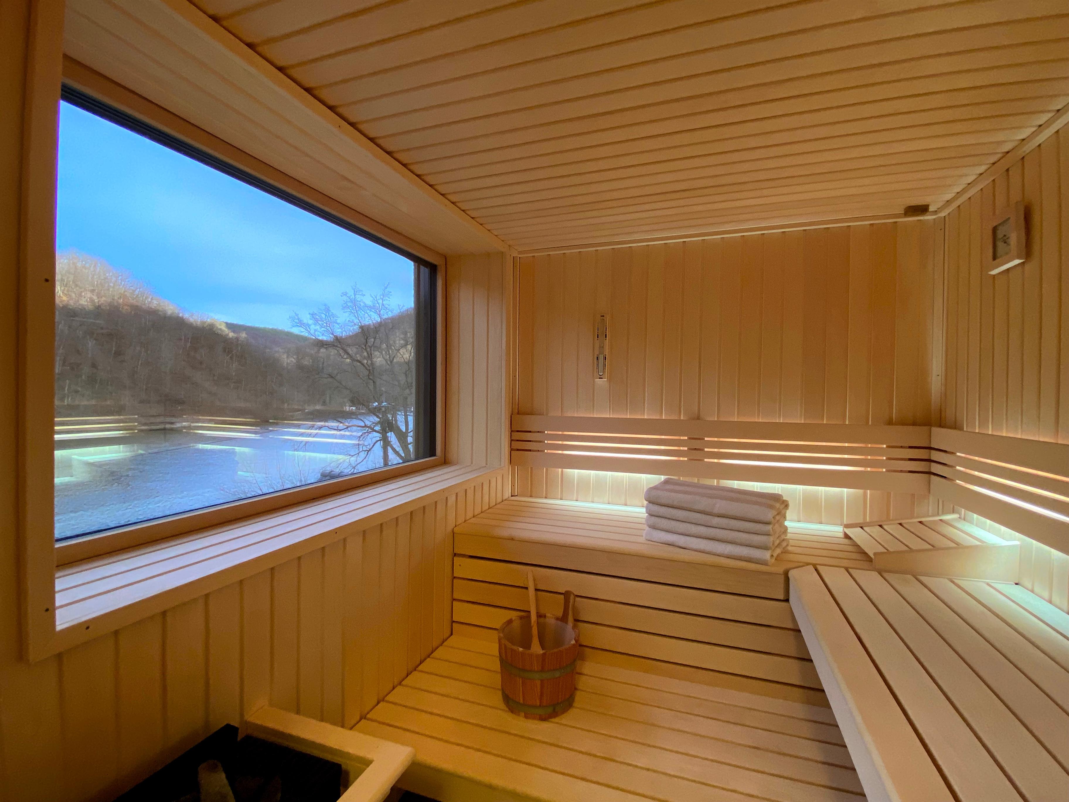 > Für schöne Wohlfühlmomente sorgt die hauseigene Sauna mit Panoramafenster und unmittelbarem Blick auf den See. Dank der Soundübertragung mit eingebauter Bluetooth-Anlage sowie variablem LED-Lichtspiel werden Sie sich rundum wohlfühlen.