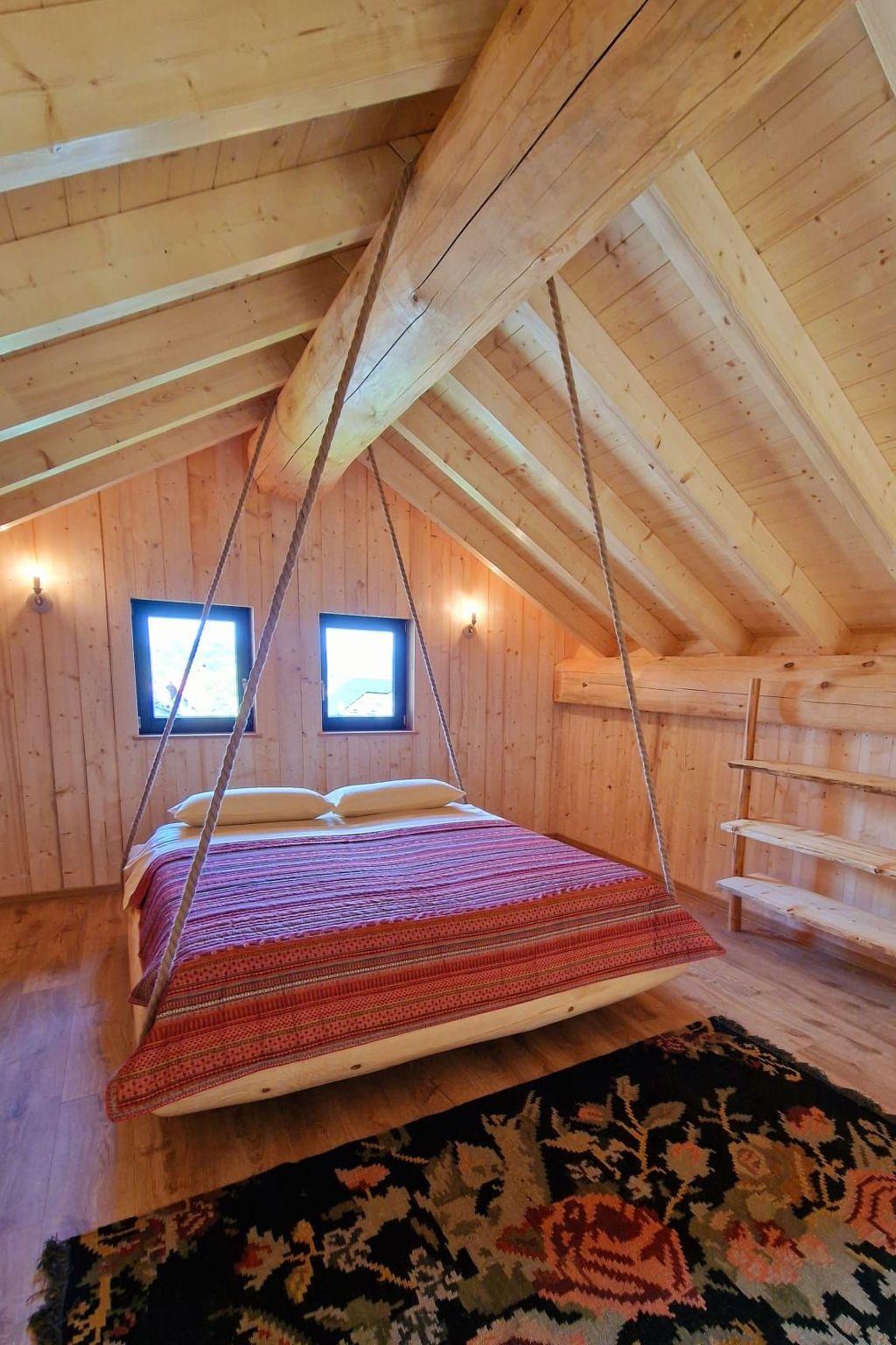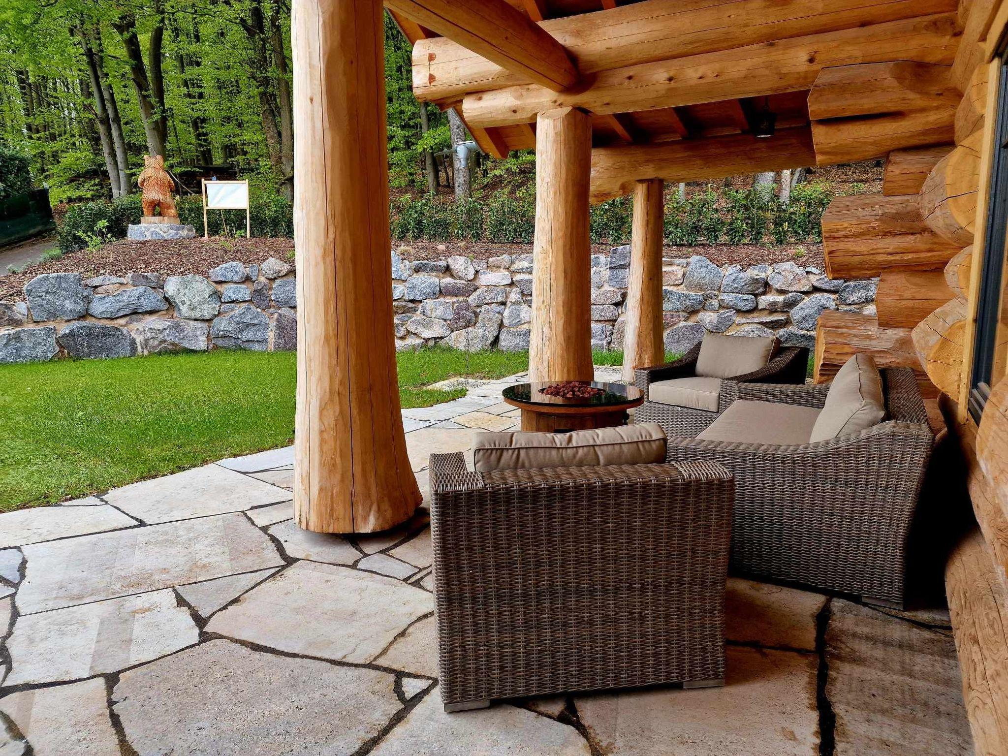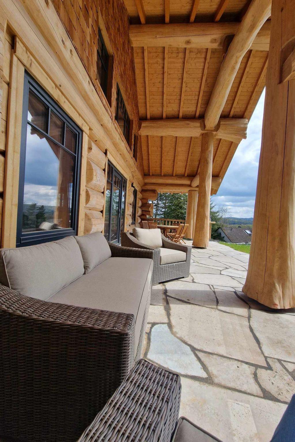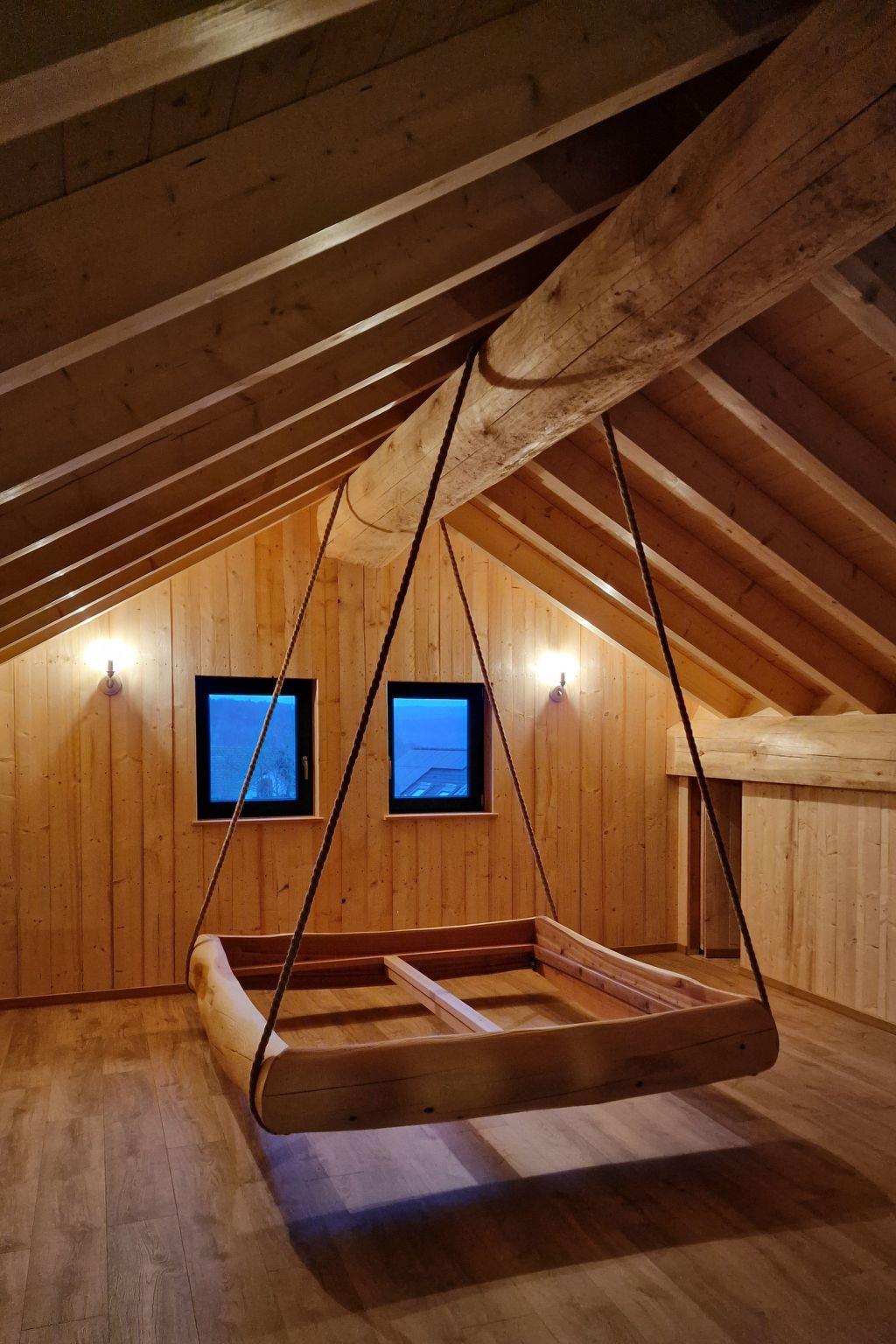 The perfect vacation retreat for up to 6 guests, with over 272 sq meters. The natural red cedar log cabin was built in Canada in 2023 and disassembled and shipped to its current location in The Spessart where it was reassembled. The interior has been professionally designed and decorated with attention to detail, comfort and luxury. The living area is open concept, promoting family togetherness. During your stay you may cook your own meals in the beautiful, fully equipped chef’s kitchen. Or, let someone else do the cooking and enjoy one of the many local restaurants. The bed and chairs hang from the ceiling. Climb the ladder to see what other fun surprises await! You won’t run out of exciting activities nearby, many in walking distance. After a fun filled day, come back and relax in the sauna, warm up beside the double-sided fireplace in the great room, or enjoy drinks around the firepit on the terrace. Your hosts are always happy to assist you with restaurant or activity reservations.