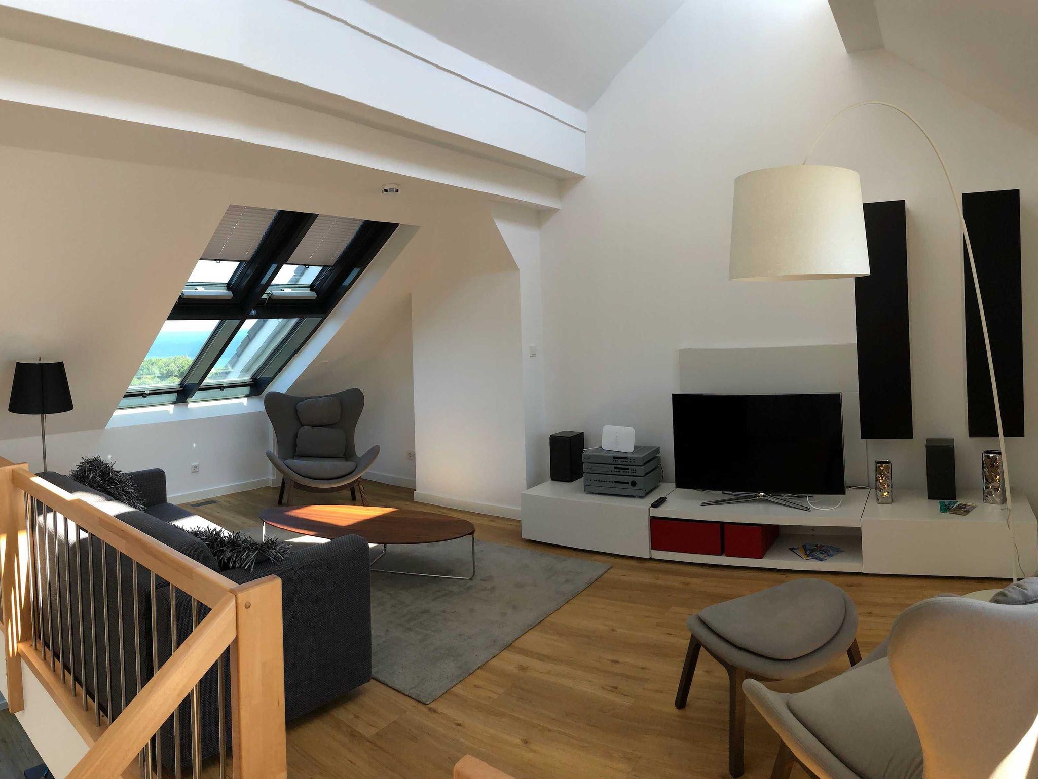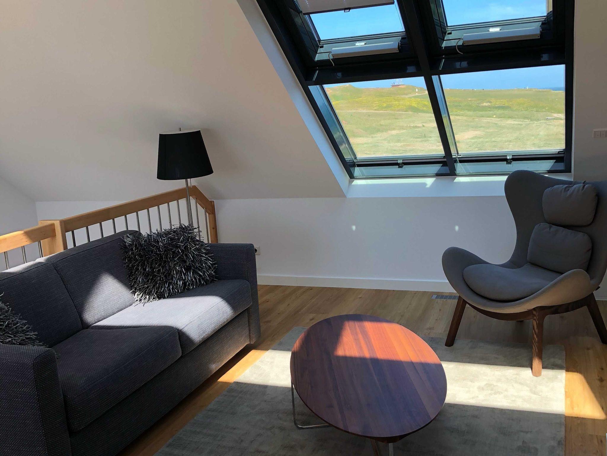 Die luxuriöse Maisonette Wohnung hat ca. 70 qm Wohnfläche und verfügt in der unteren Etage über eine komplett ausgestattete Küche mit Geschirrspüler und Zugang zum Balkon, einen großzügigen Essbereich und Blick auf das Meer und ins Grüne. Bad mit Dusche und WC, Schlafzimmer mit einem komfortablen Doppelbett. Im Studio in der oberen Ebene befindet sich ein Wohn/Schlafbereich mit Blick auf die Nordsee durch das Panoramadachfenster und Zugang zur Dachterrasse mit Blick auf den Leuchtturm und die Düne. WLAN, TV und Radio/Dockingstation stehen zur Verfügung. Bettwäsche und Handtücher sind inklusive und werden bei längeren Aufenthalten gewechselt.