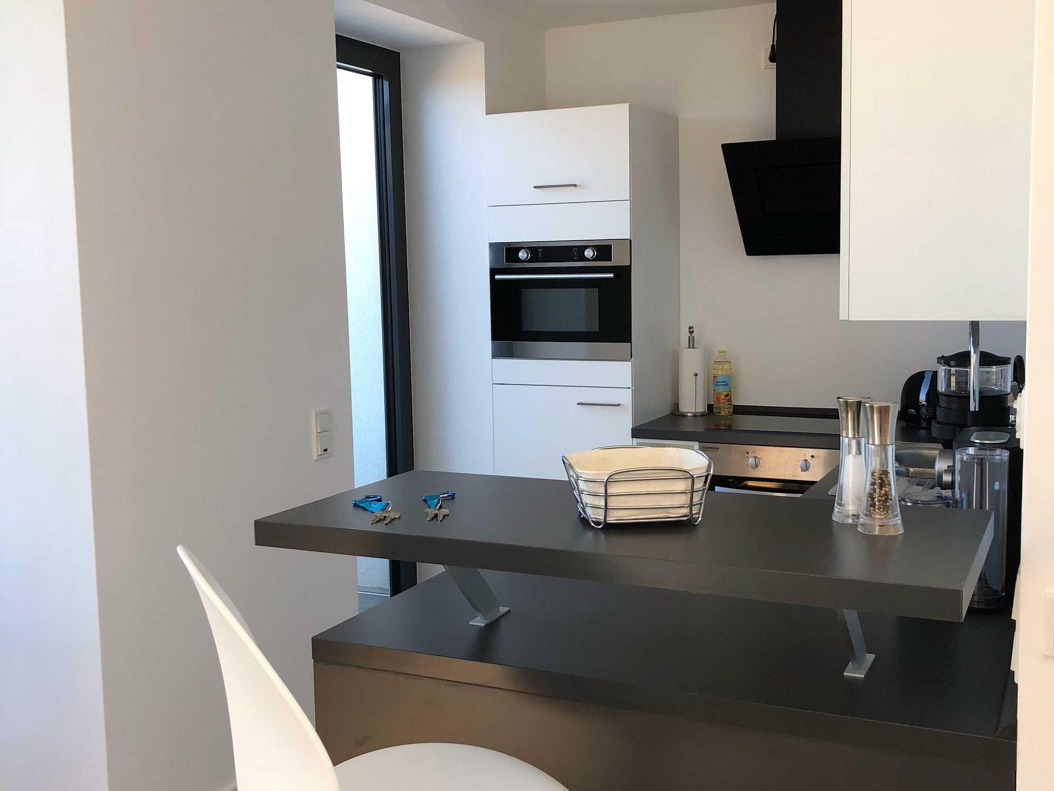 Geschirrspüler und Zugang zum Balkon, einen großzügigen Essbereich und Blick aufs Meer und ins Grüne. Bad mit Dusche und WC, Schlafzimmer mit einem komfortablen Doppelbett. Im Studio in der oberen Etage befindet sich ein Wohn/Schlafbereich mit