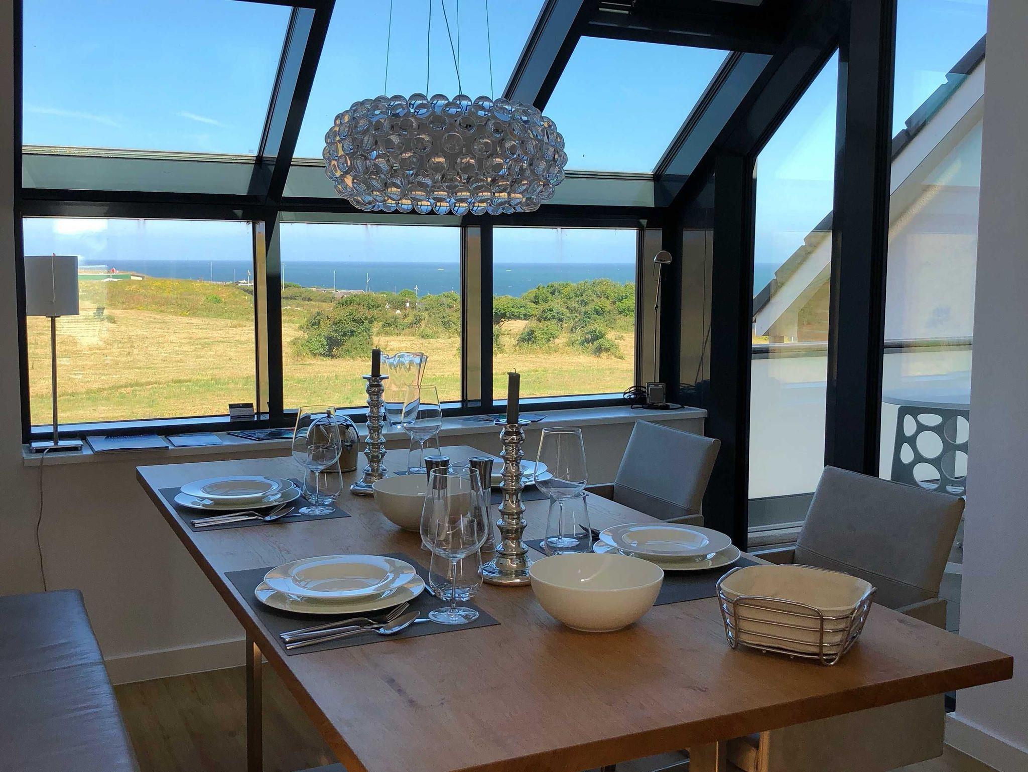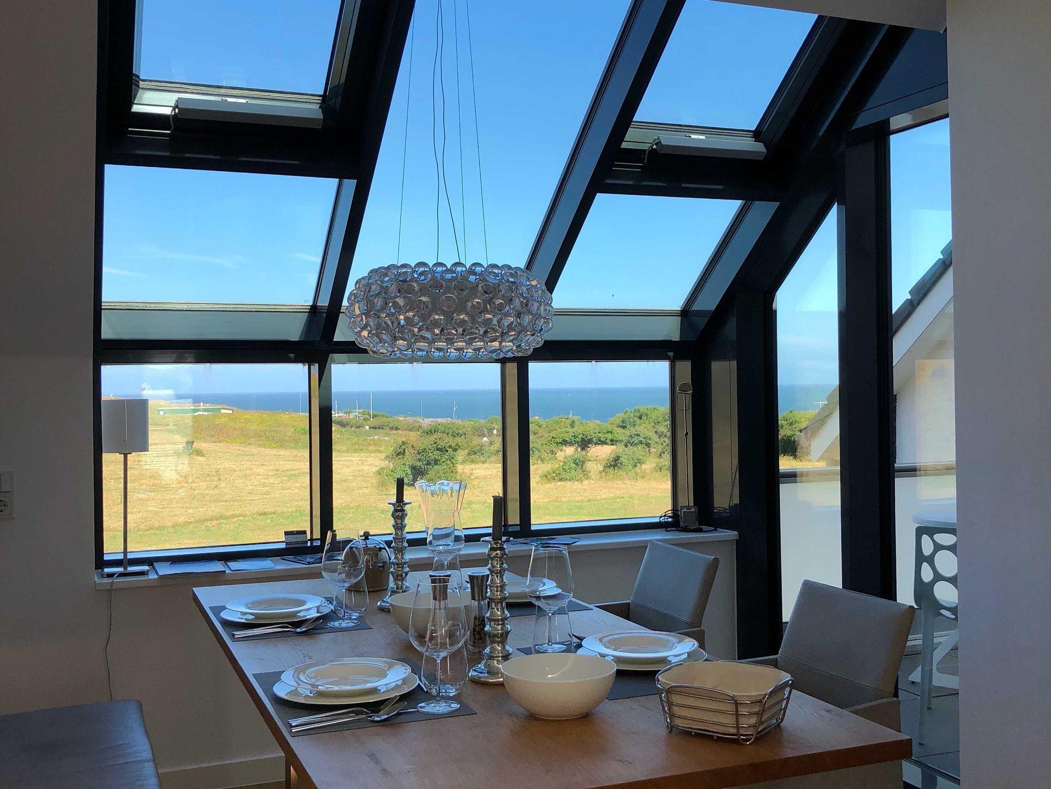 Blick auf die Nordsee durch das Panoramadachfenster und Zugang zur Dachterrasse mit Blick auf den Leuchtturm und die Düne.