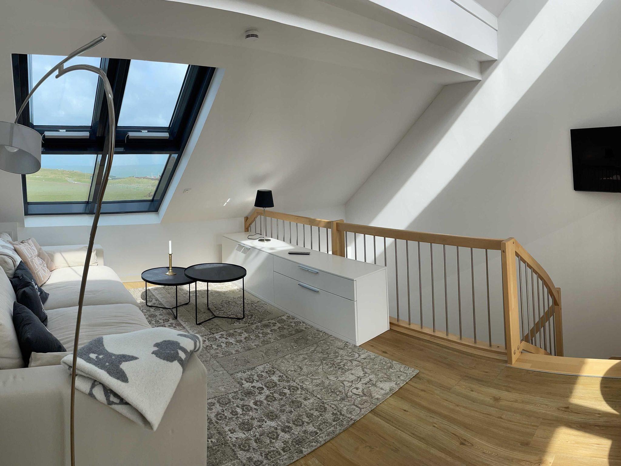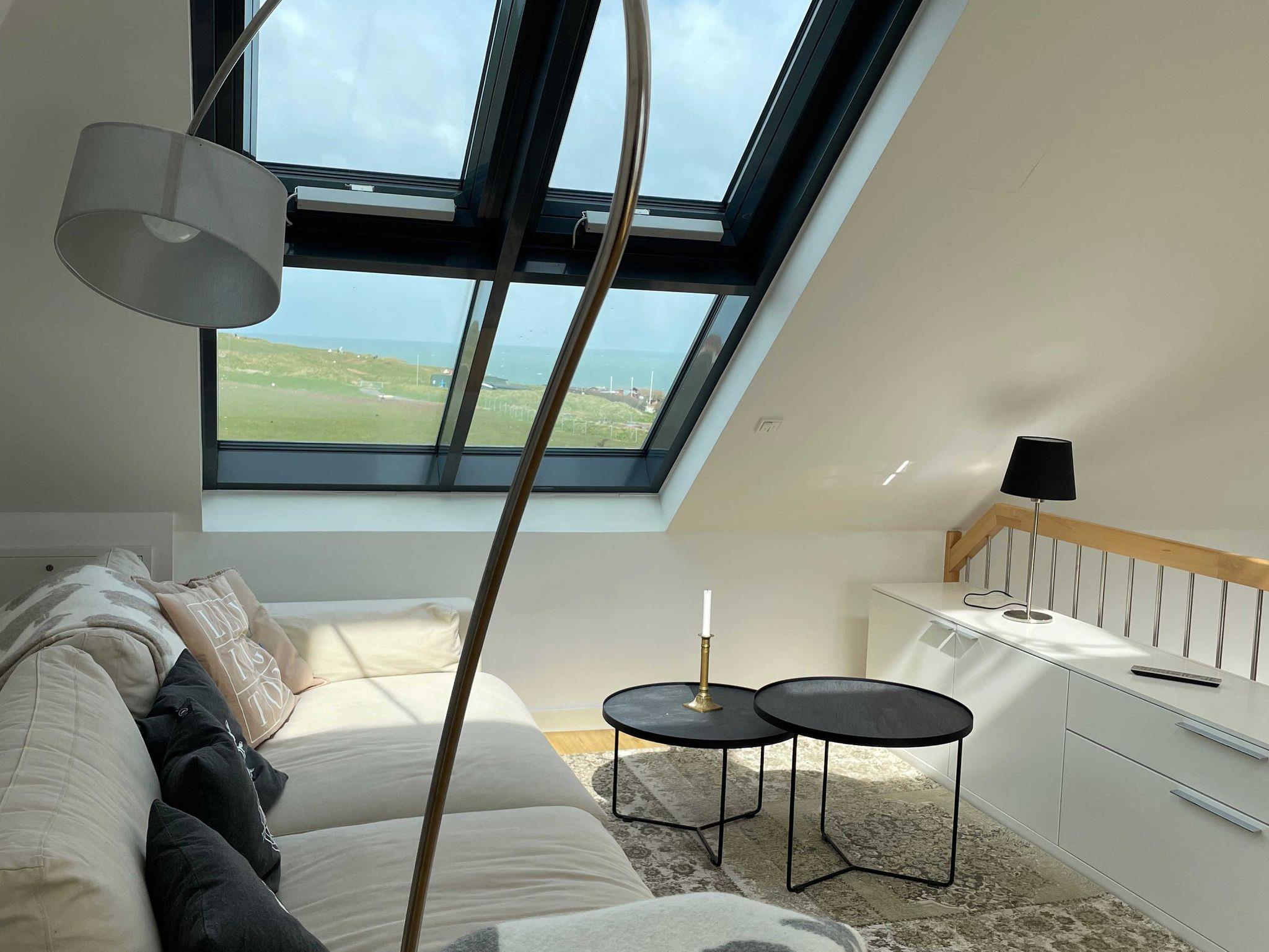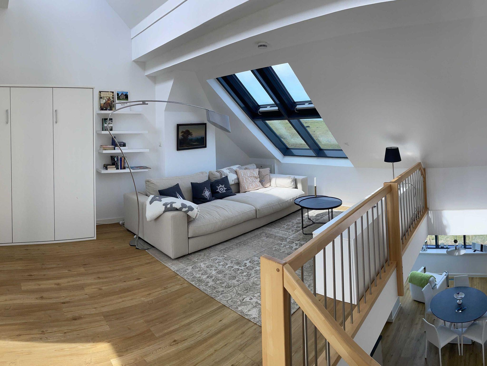 Die luxuriöse Wohnung hat ca. 70 qm Wohnfläche und verfügt in der unteren Etage über eine komplett ausgestattete Küche mit Geschirrspüler und Zugang zum Balkon, einen großzügigen Essbereich und Blick auf das Meer und ins Grüne. Bad mit Dusche und WC. Schlafzimmer mit einem komfortablen Doppelbett. Im Studio in der oberen Ebene befindet sich ein Wohn/Schlafbereich mit Blick auf die Nordsee durch das Panoramadachfenster und Zugang zur Dachterrasse mit Blick auf den Leuchtturm und die Düne. Als Schlafmöglichkeit ist im Studio ein sehr bequemes Doppelbett als ausklappbares Schrankbett vorhanden. Waschmaschine und Trockner befinden sich im Keller, nur nutzbar für Gäste dieser Wohnung. WLAN, TV und Radio/Dockingstation stehen zur Verfügung. Bettwäsche und Handtücher sind Inklusive und werden bei längeren Aufenthalten gewechselt.