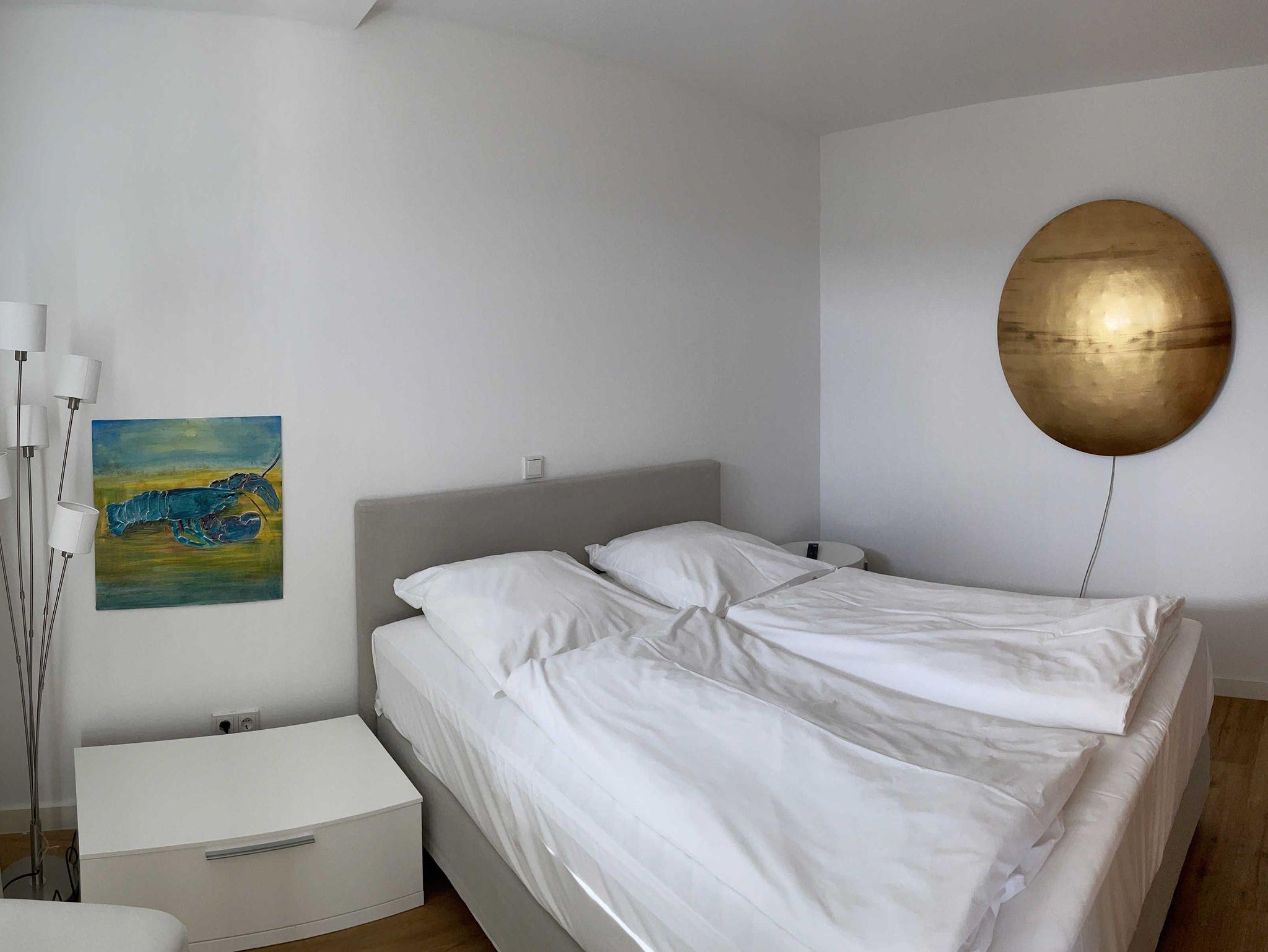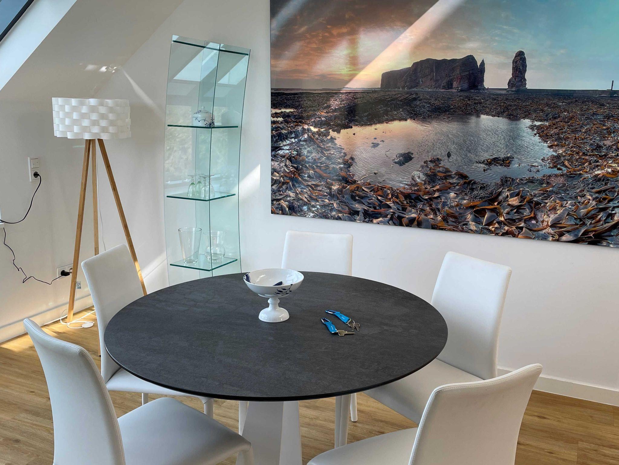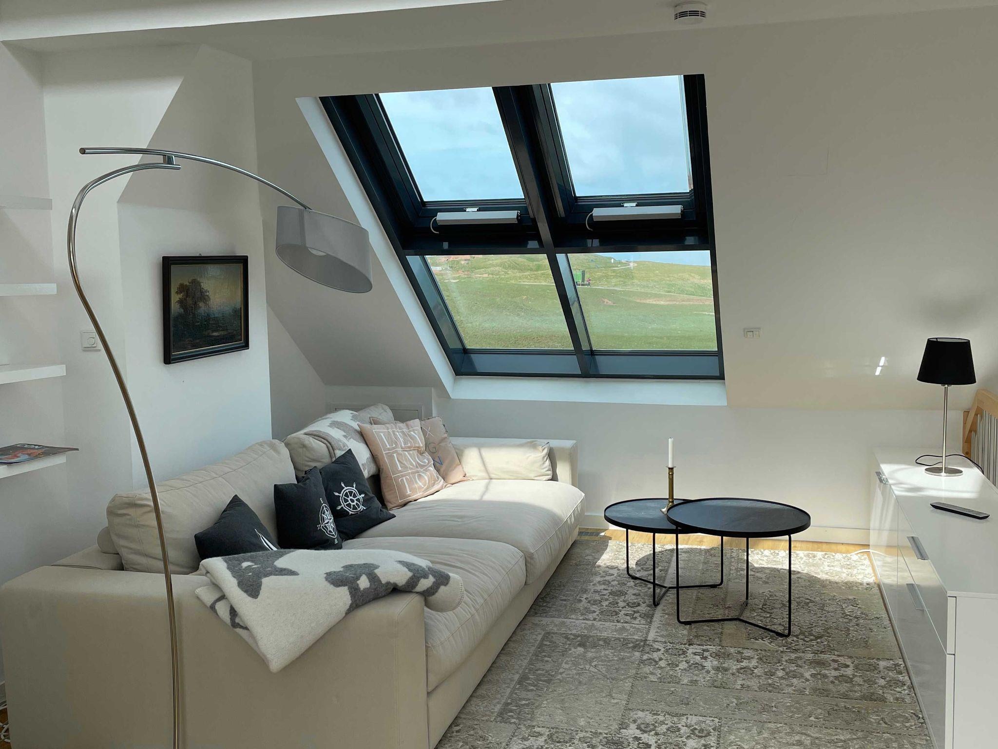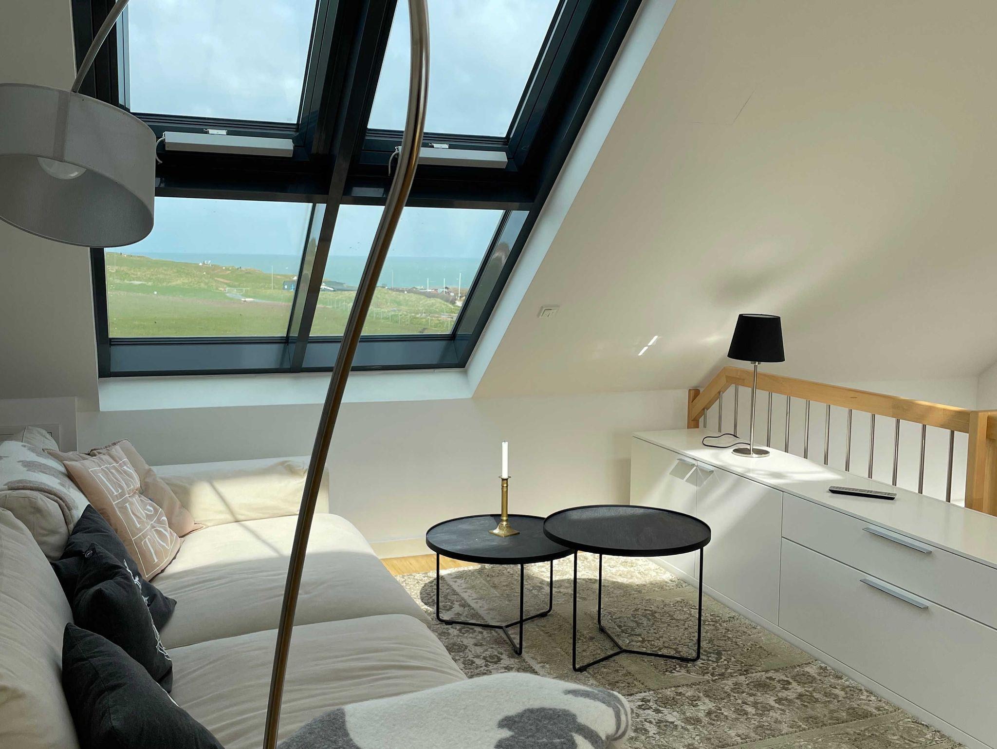 Die luxuriöse Wohnung hat ca. 70 qm Wohnfläche und verfügt in der unteren Etage über eine komplett ausgestattete Küche mit Geschirrspüler und Zugang zum Balkon, einen großzügigen Essbereich und Blick auf das Meer und ins Grüne. Bad mit Dusche und WC. Schlafzimmer mit einem komfortablen Doppelbett. Im Studio in der oberen Ebene befindet sich ein Wohn/Schlafbereich mit Blick auf die Nordsee durch das Panoramadachfenster und Zugang zur Dachterrasse mit Blick auf den Leuchtturm und die Düne. Als Schlafmöglichkeit ist im Studio ein sehr bequemes Doppelbett als ausklappbares Schrankbett vorhanden. Waschmaschine und Trockner befinden sich im Keller, nur nutzbar für Gäste dieser Wohnung. WLAN, TV und Radio/Dockingstation stehen zur Verfügung. Bettwäsche und Handtücher sind Inklusive und werden bei längeren Aufenthalten gewechselt.