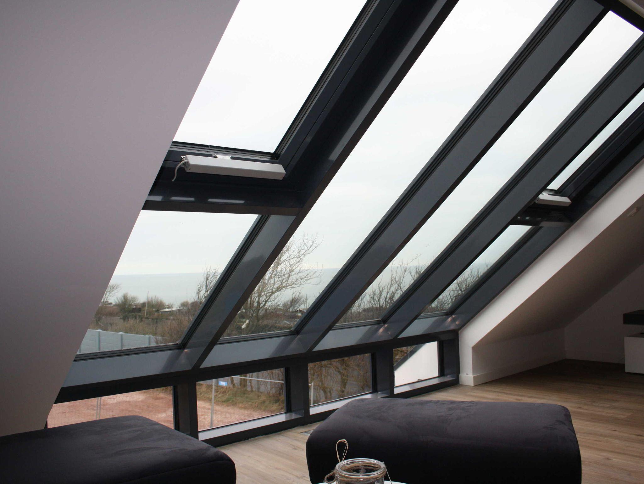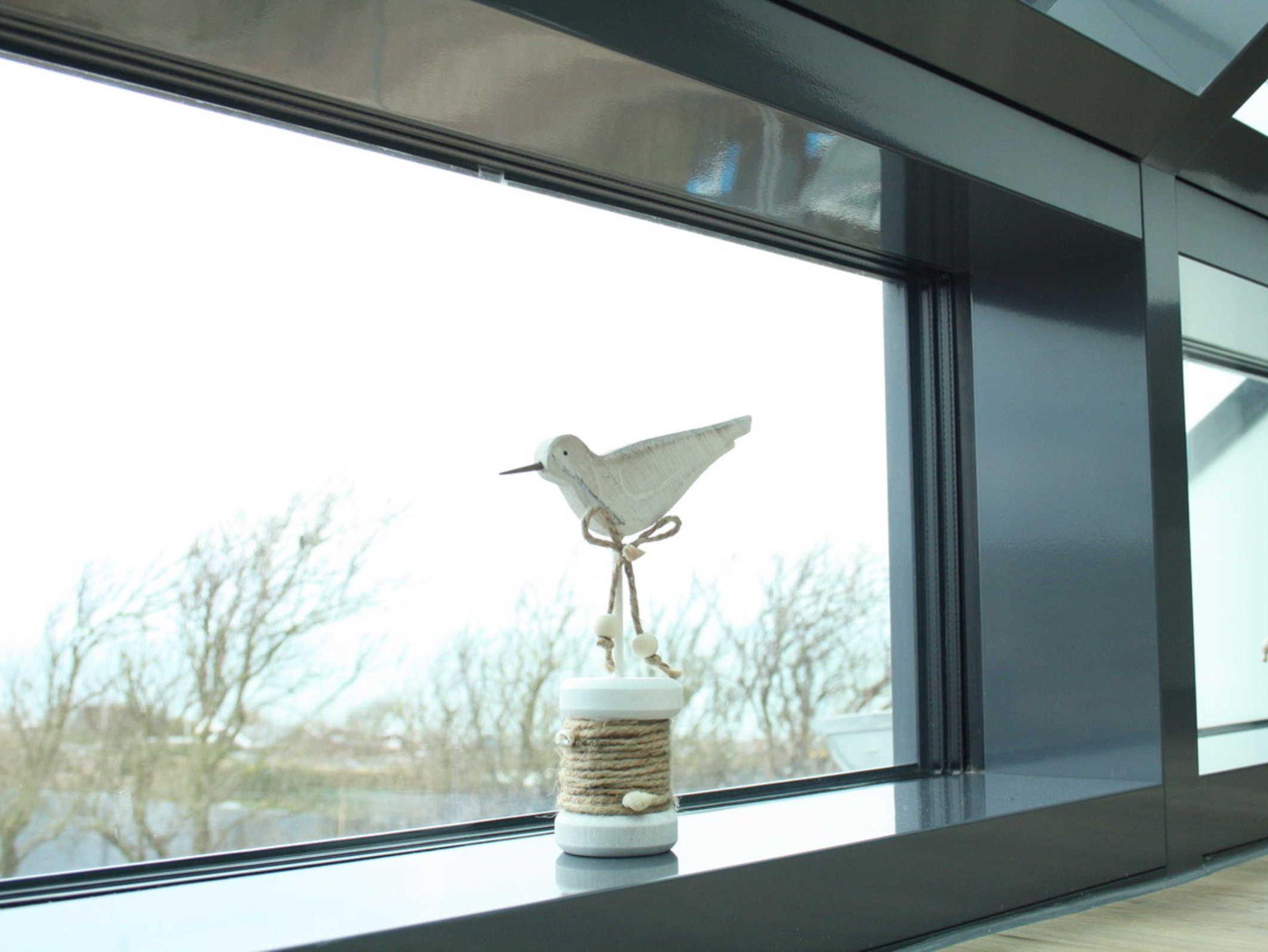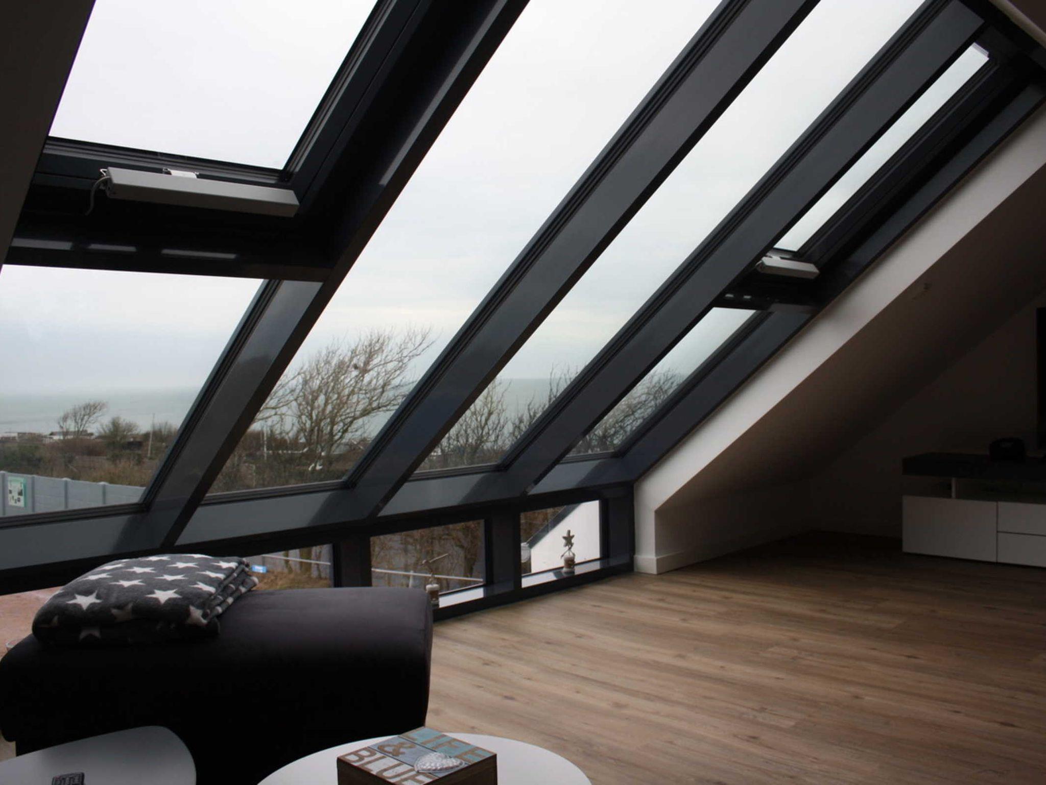 Schlafcouch mit hochwertigem Lattenrost. Großes Panoramafenster mit Blick auf die Nordsee und auf den grünen Teil der Insel.