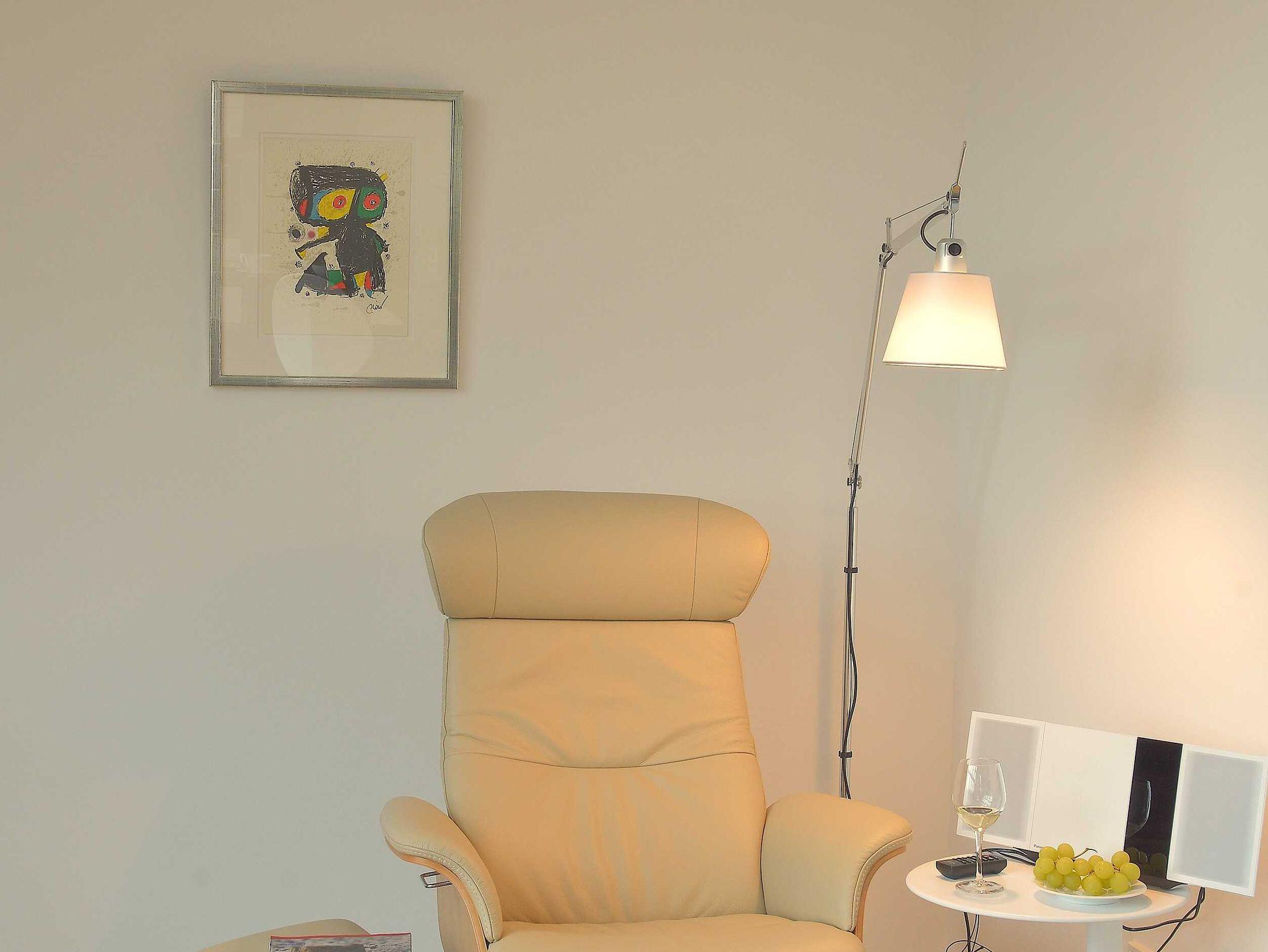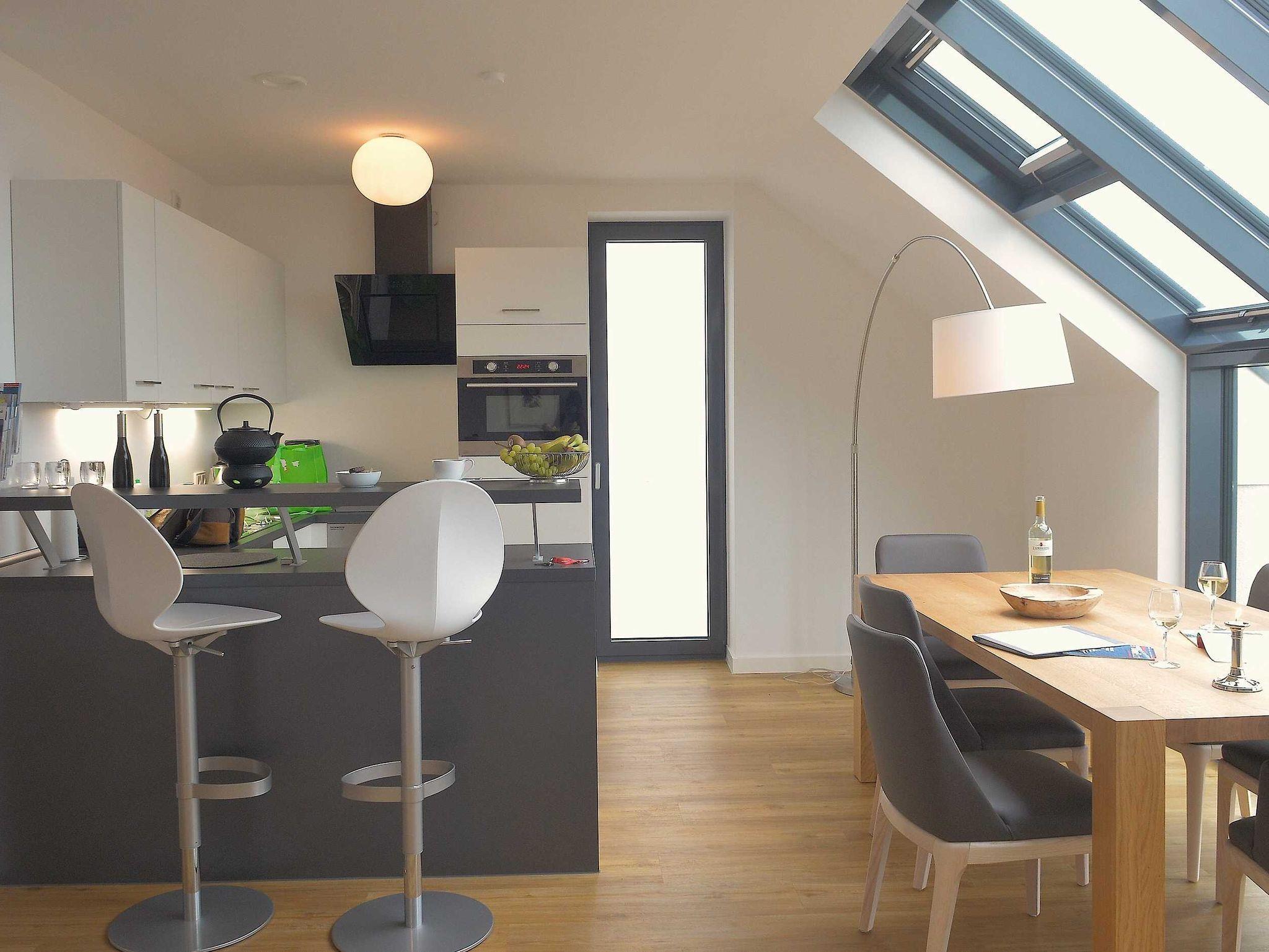 Die luxuriöse Wohnung hat ca. 79 qm Wohnfläche und verfügt in der unteren Etage über eine komplett ausgestattete Küche mit Geschirrspüler, einen großzügigen Essbereich mit Blick auf das Meer und ins Grüne, gestaltet wie ein Wintergarten. Bad mit Dusche und WC, Schlafzimmer mit einem komfortablen Doppelbett. Im Studio in der oberen Ebene befindet sich ein Wohn/Schlafbereich mit Blick auf die Nordsee durch das Panoramadachfenster und Zugang zur Dachterrasse mit Blick auf den Leuchtturm und die Düne. WLAN, TV und Radio/Dockingstation sehen zur Verfügung. Bettwäsche und Handtücher sind inklusive und werden bei längeren Aufenthalten gewechselt. Es stehen Waschmaschinen und Trockner gegen Gebühr (Münzgeräte) im Untergeschoss zur Verfügung.