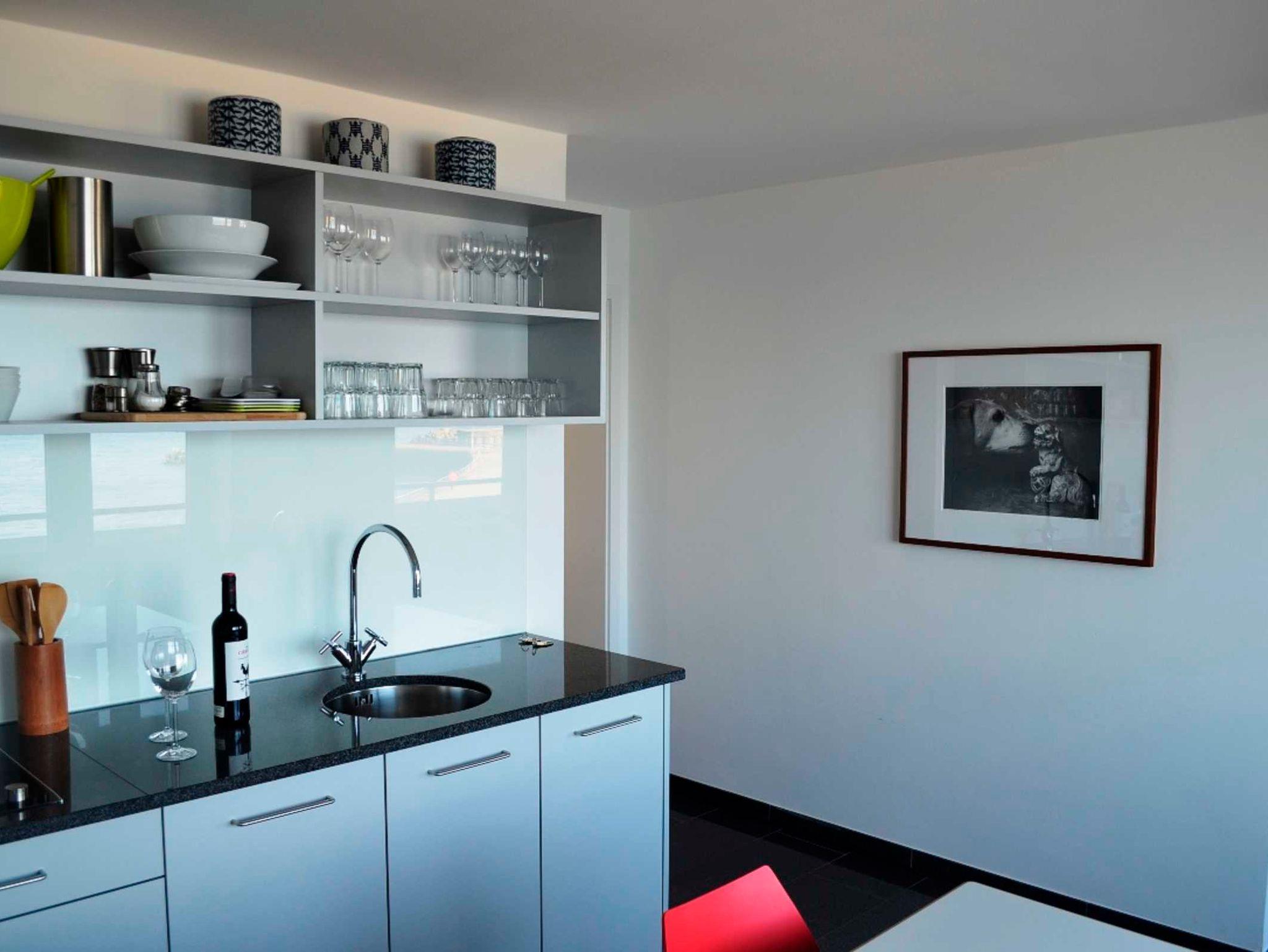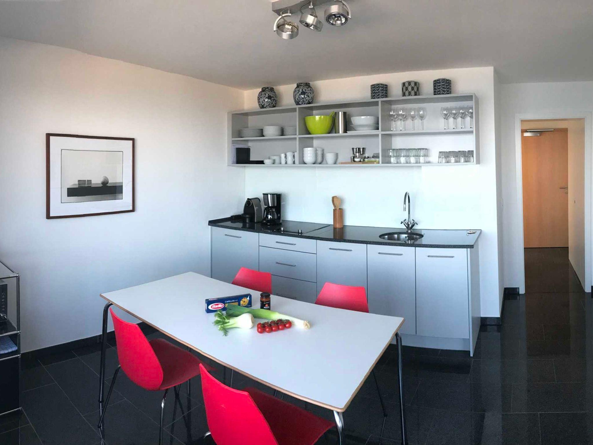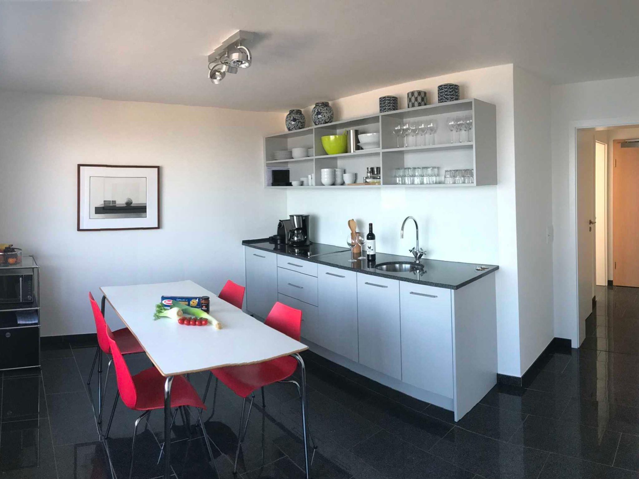 Vier Räume: Wohnzimmer zur Seeseite mit Balkon, Küche mit Essplatz zur Seeseite. Bidet, Dusche/WC, Flur.