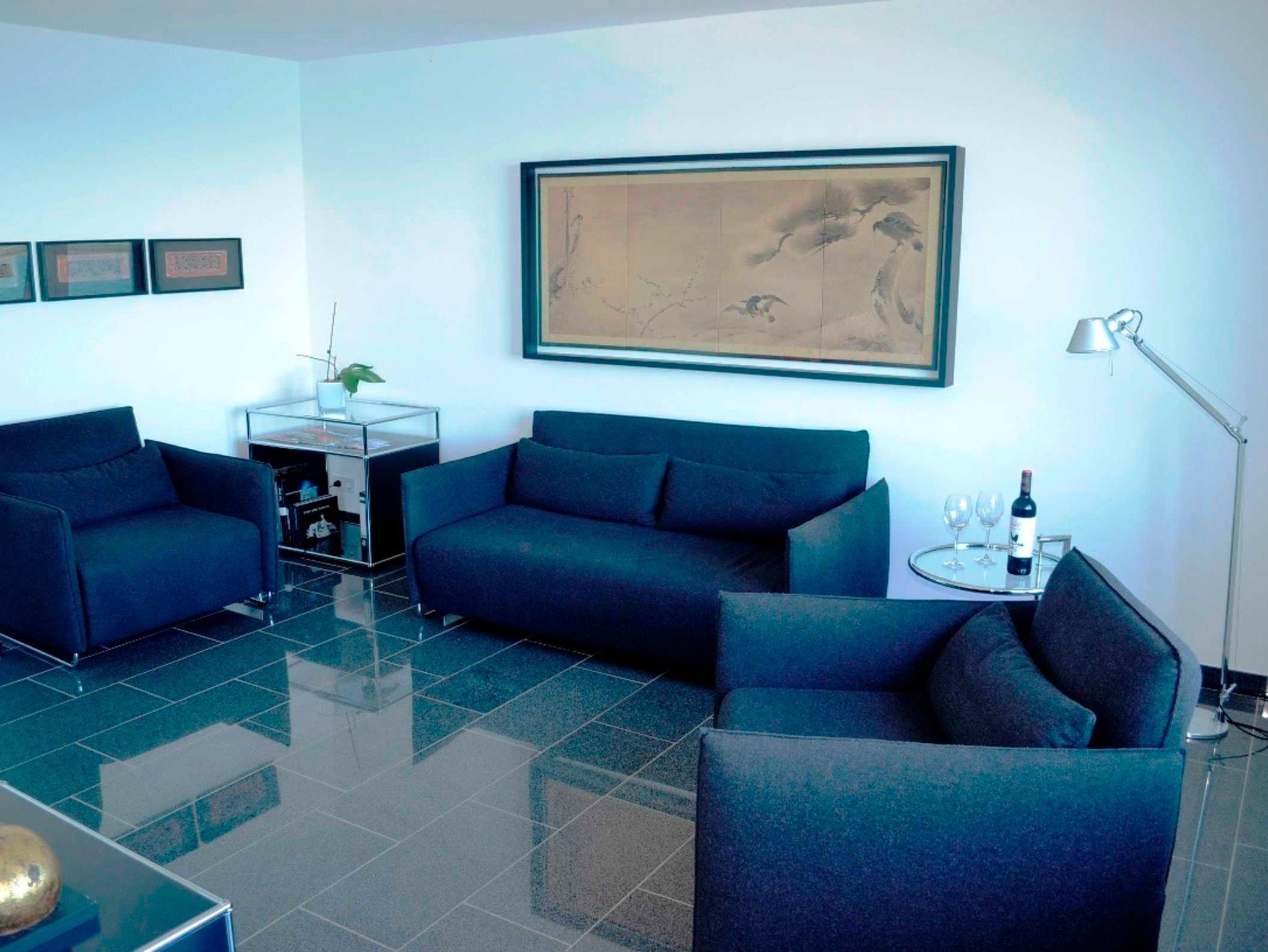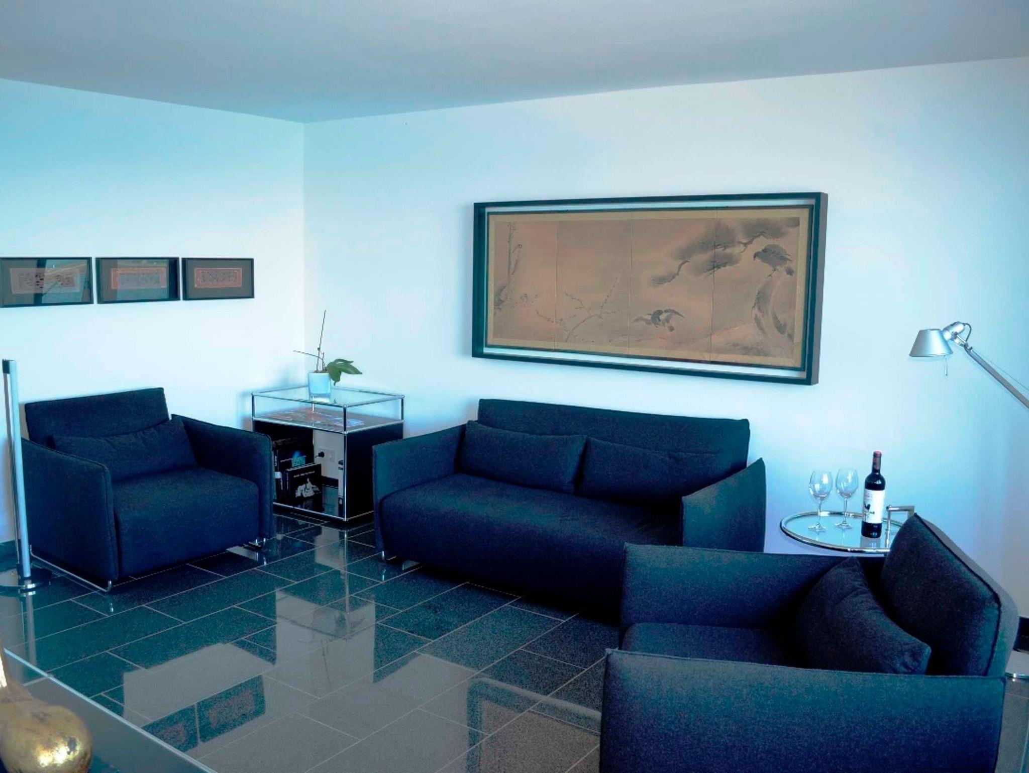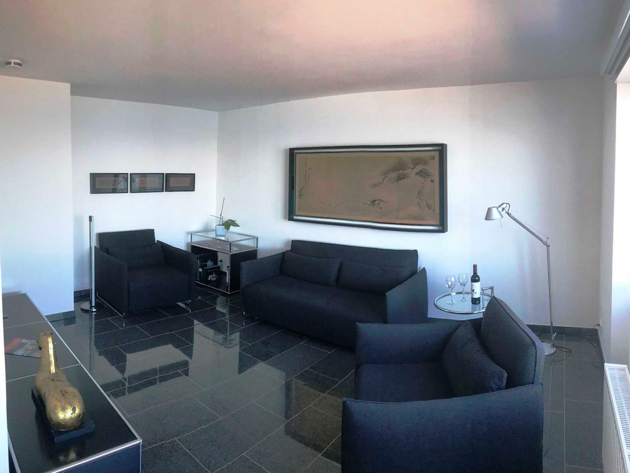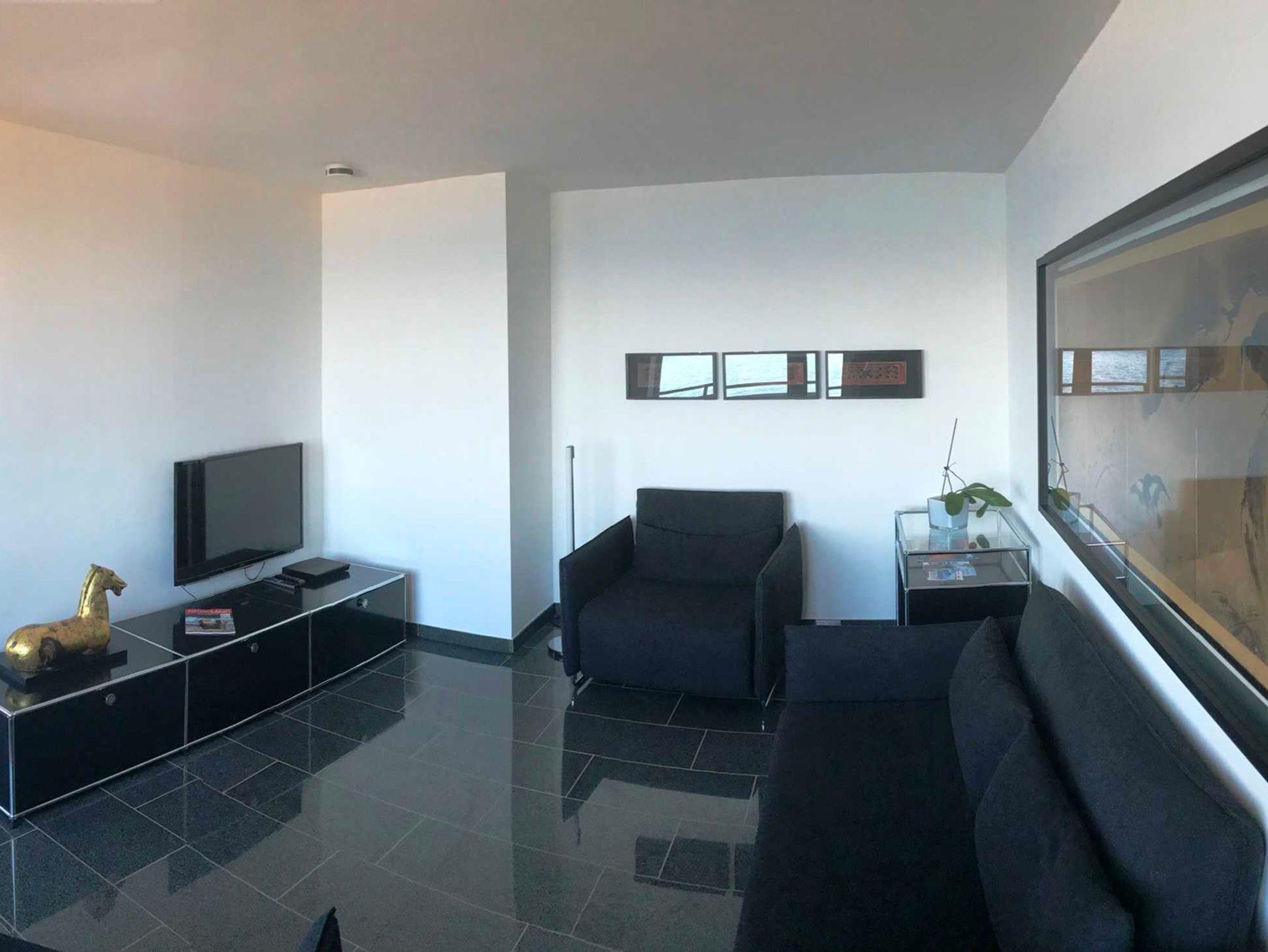 Vier Räume: Wohnzimmer zur Seeseite mit Balkon, Küche mit Essplatz zur Seeseite. Bidet, Dusche/WC, Flur.