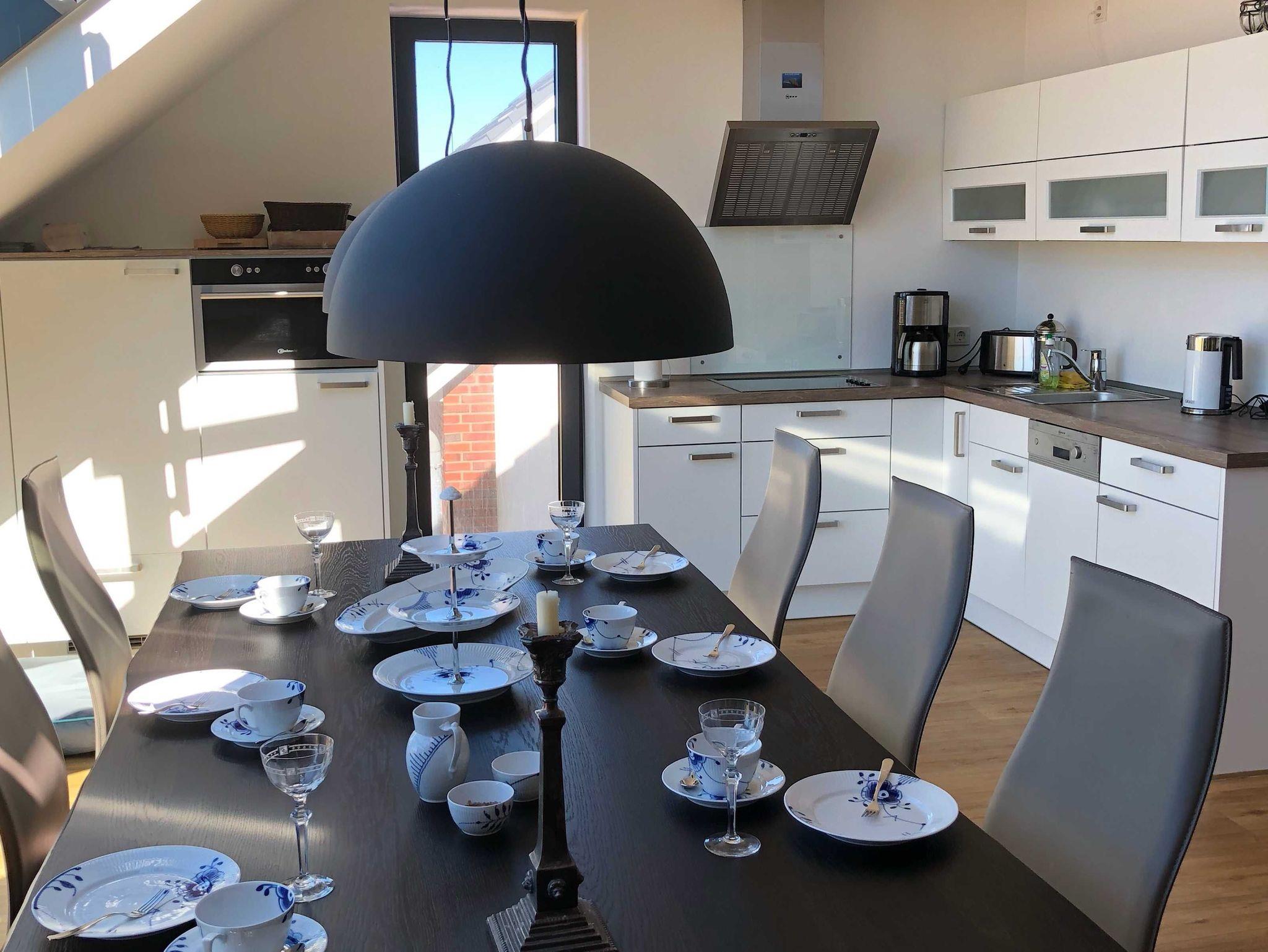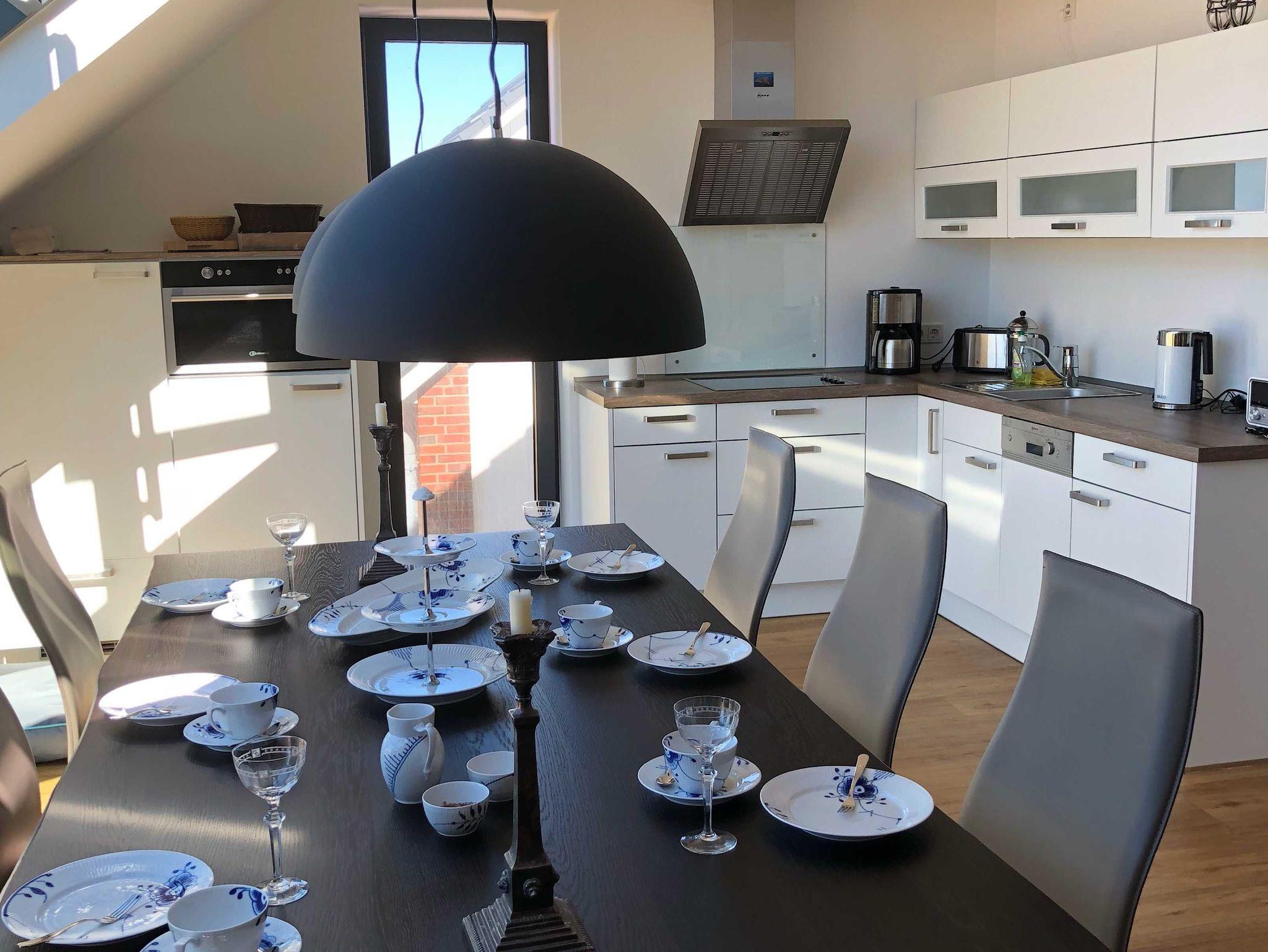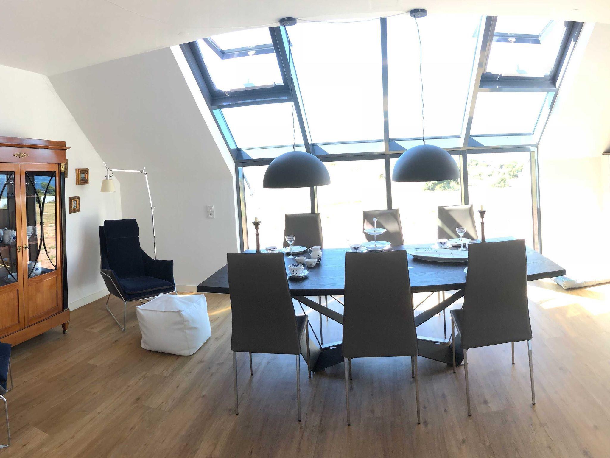Die luxuriöse Wohnung hat ca. 79 qm Wohnfläche und verfügt in der unteren Etage über eine komplett ausgestattete Küche mit Geschirrspüler, einen großzügigen Essbereich mit Blick auf das Meer und ins Grüne, gestaltet wie ein Wintergarten. Bad mit Dusche und WC, (Waschmaschine und Trockner), Schlafzimmer mit einem komfortablen Doppelbett. Im Studio in der oberen Ebene befindet sich ein Wohn/Schlafbereich (ein Schlafplatz) mit Blick auf die Nordsee durch das Panoramadachfenster und Zugang zur Dachterrasse mit Blick auf den Leuchtturm, das Oberland und die Düne. WLAN, TV (3 x) und Radio/Dockingstation stehen zur Verfügung. Bettwäsche und Handtücher sind inklusive und werden bei längeren Aufenthalten gewechselt.