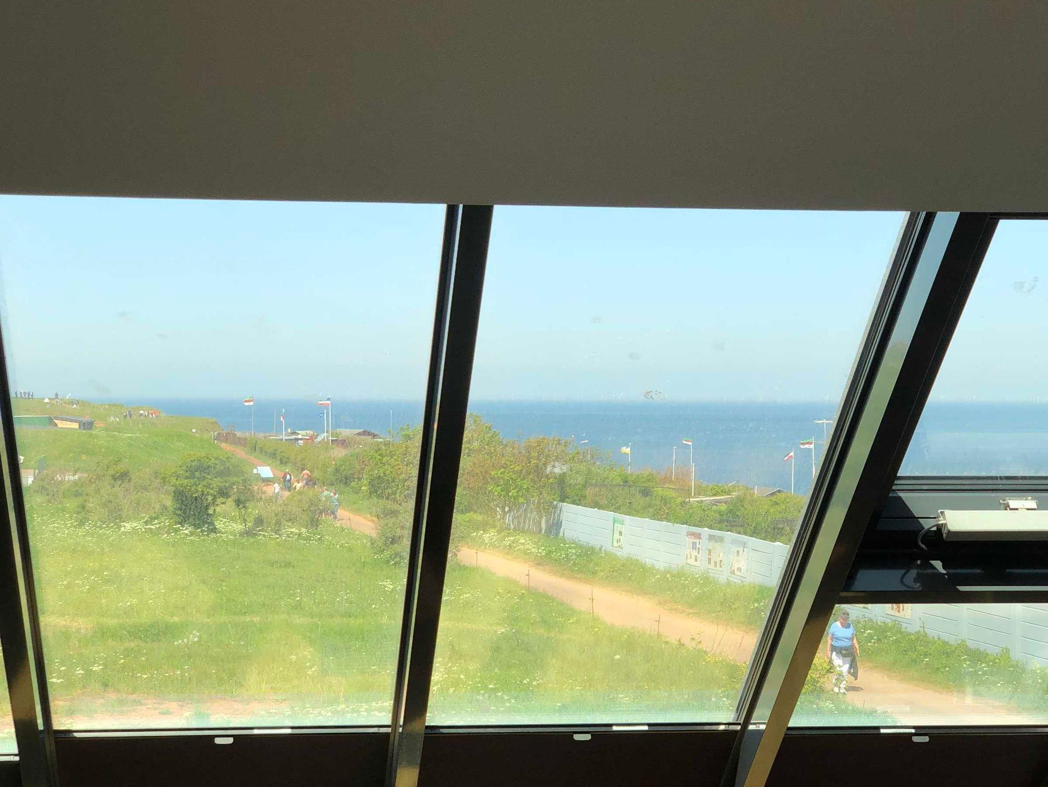 Ausblick in verschiedenen Perspektiven auf die Nordsee, die Düne, den Leuchtturm und das grüne Oberland.