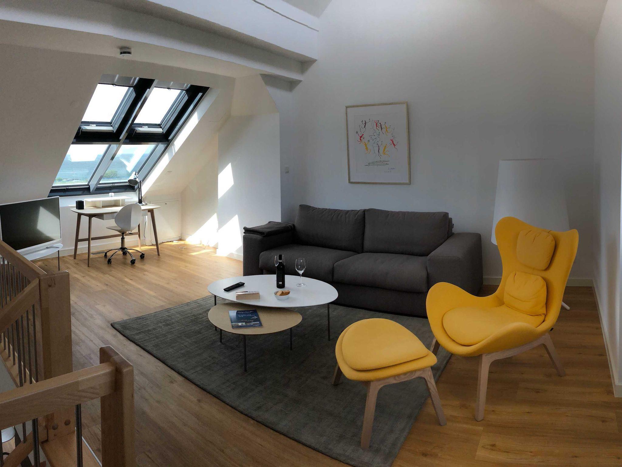 Die luxuriöse Wohnung hat ca. 70 qm Wohnfläche und verfügt in der unteren Etage über eine komplett ausgestattete Küche mit Geschirrspüler und Zugang zum Balkon, einen großzügigen Essbereich und Blick aus Meer und ins Grüne. Bad mit Dusche und WC, Schlafzimmer mit einem komfortablen Doppelbett. Im Studio in der oberen Ebene befindet sich ein Wohn/Schlafbereich mit Blick auf die Nordsee durch das Panoramadachfenster und Zugang zur Dachterrasse mit Blick auf den Leuchtturm und die Düne. WLAN, TV und Radio/Dockingstation sehen zur Verfügung. Bettwäsche und Handtücher sind inklusive und werden bei längeren Aufenthalten gewechselt.
