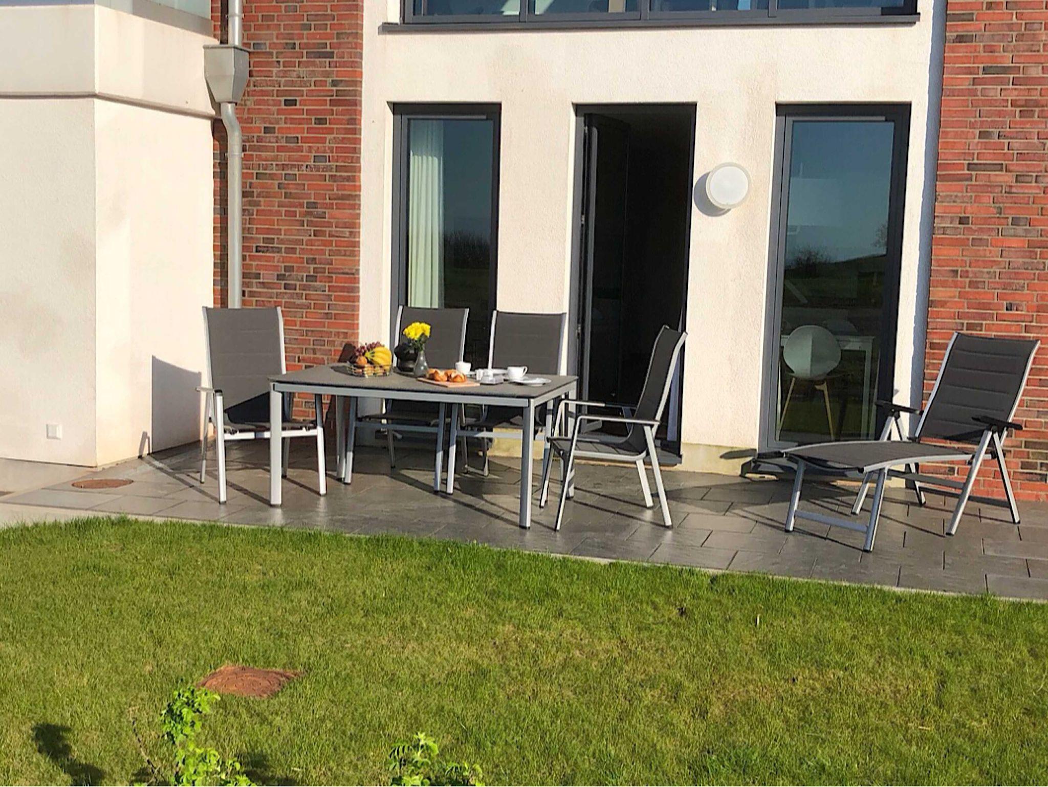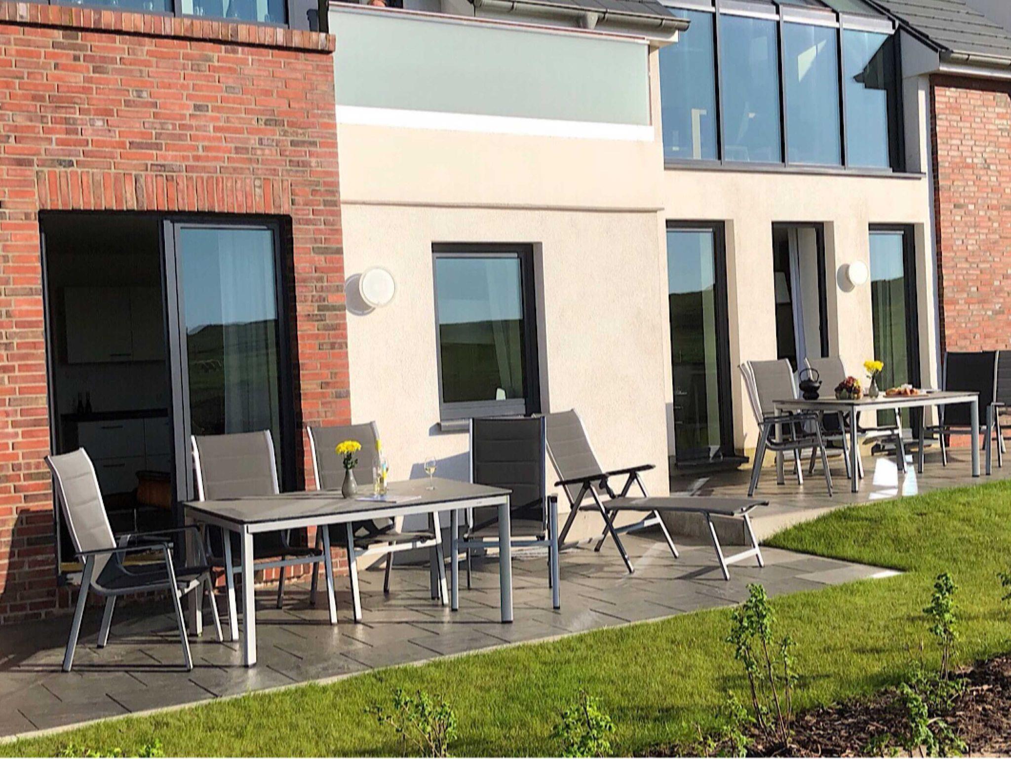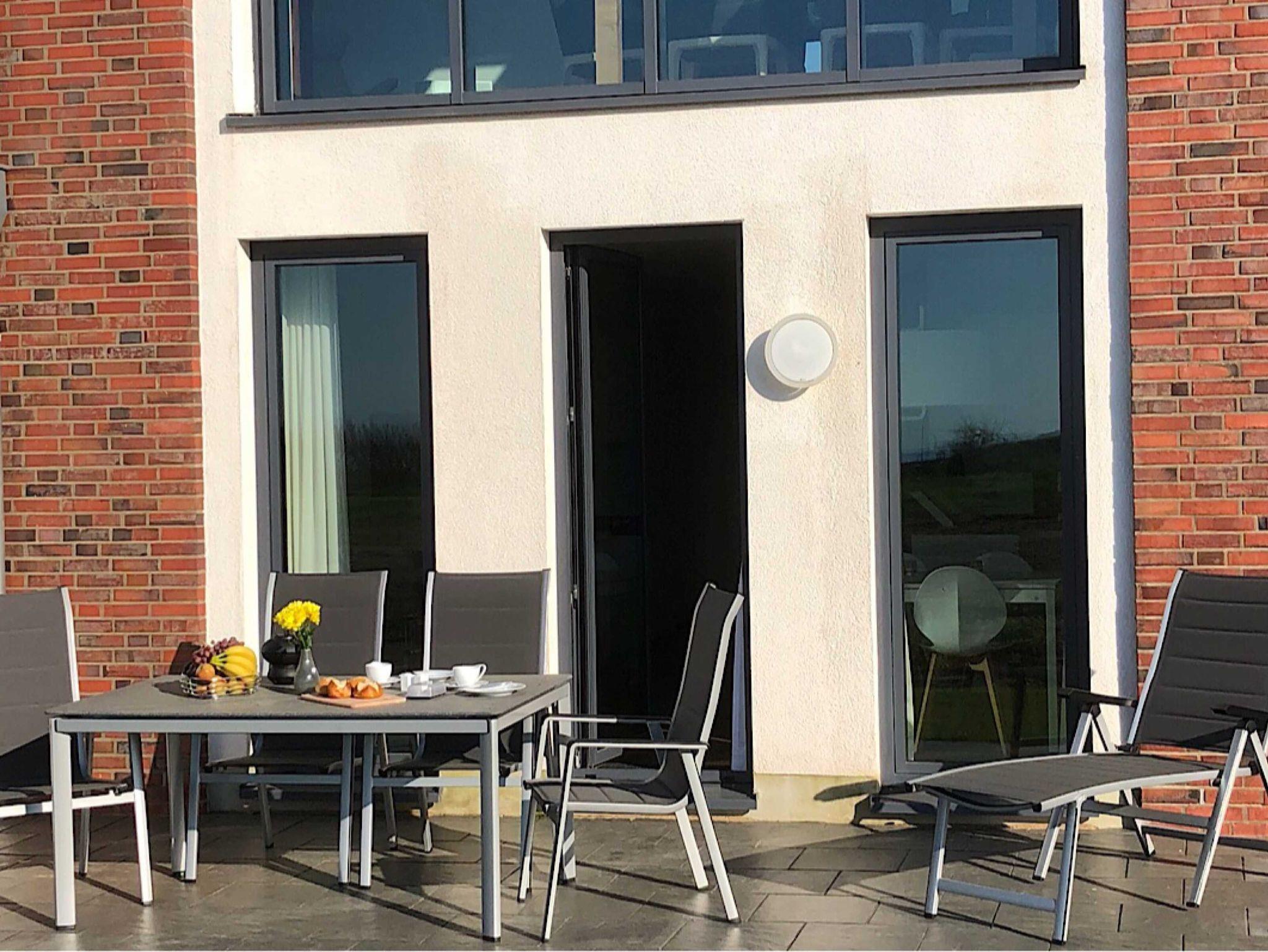 Die luxuriöse Wohnung hat ca. 59 qm Wohnfläche und befindet sich im Erdgeschoss. Der Wohnbereich mit offener, komplett ausgestatteter Küche und Essplatz hat einen Zugang zur Terrasse und einen unverbauten Blick auf die Nordsee und das grüne Oberland. Eine zweite Terrasse befindet sich auf der südlichen Sonnen-Seite der Wohnung.