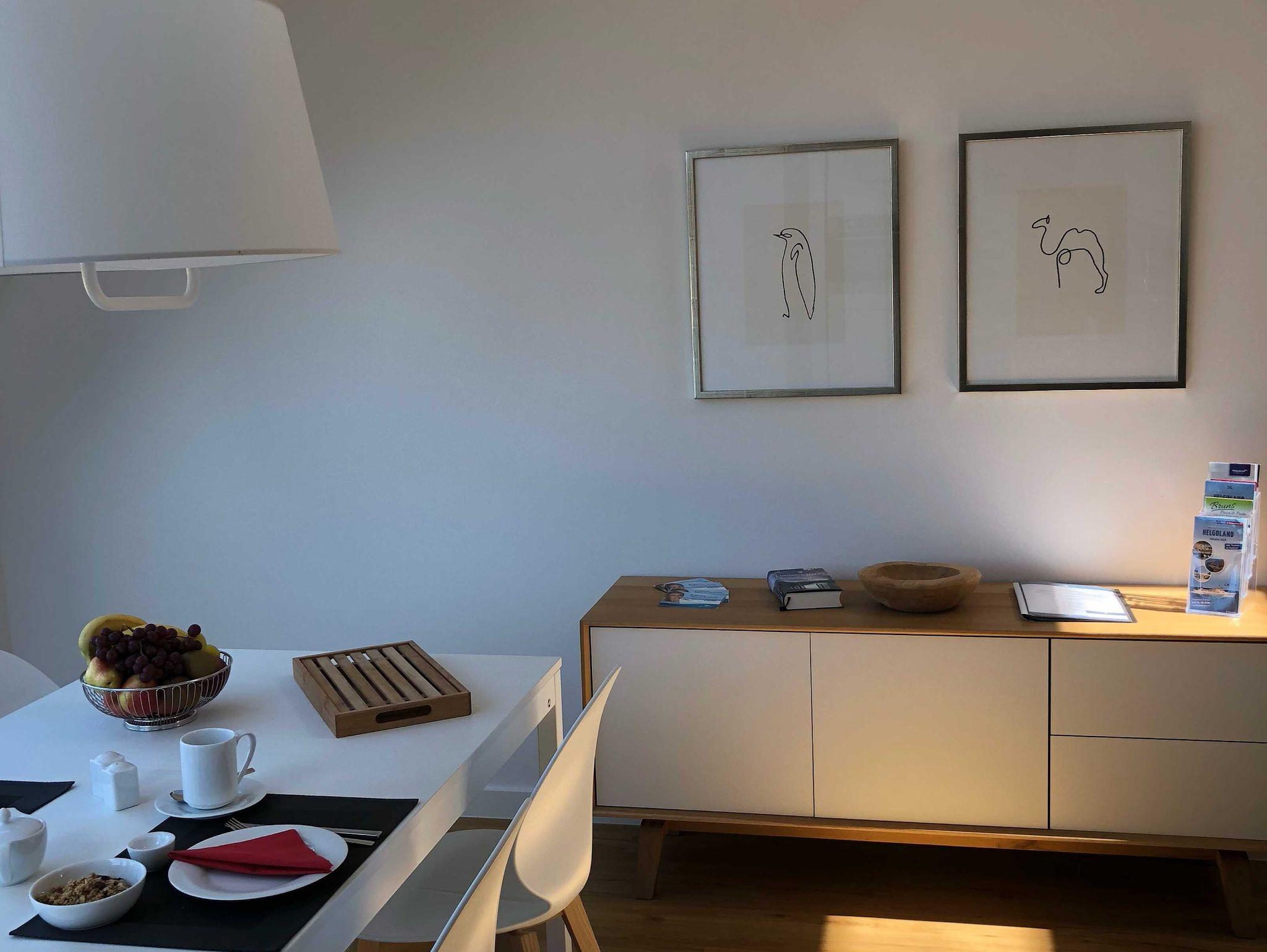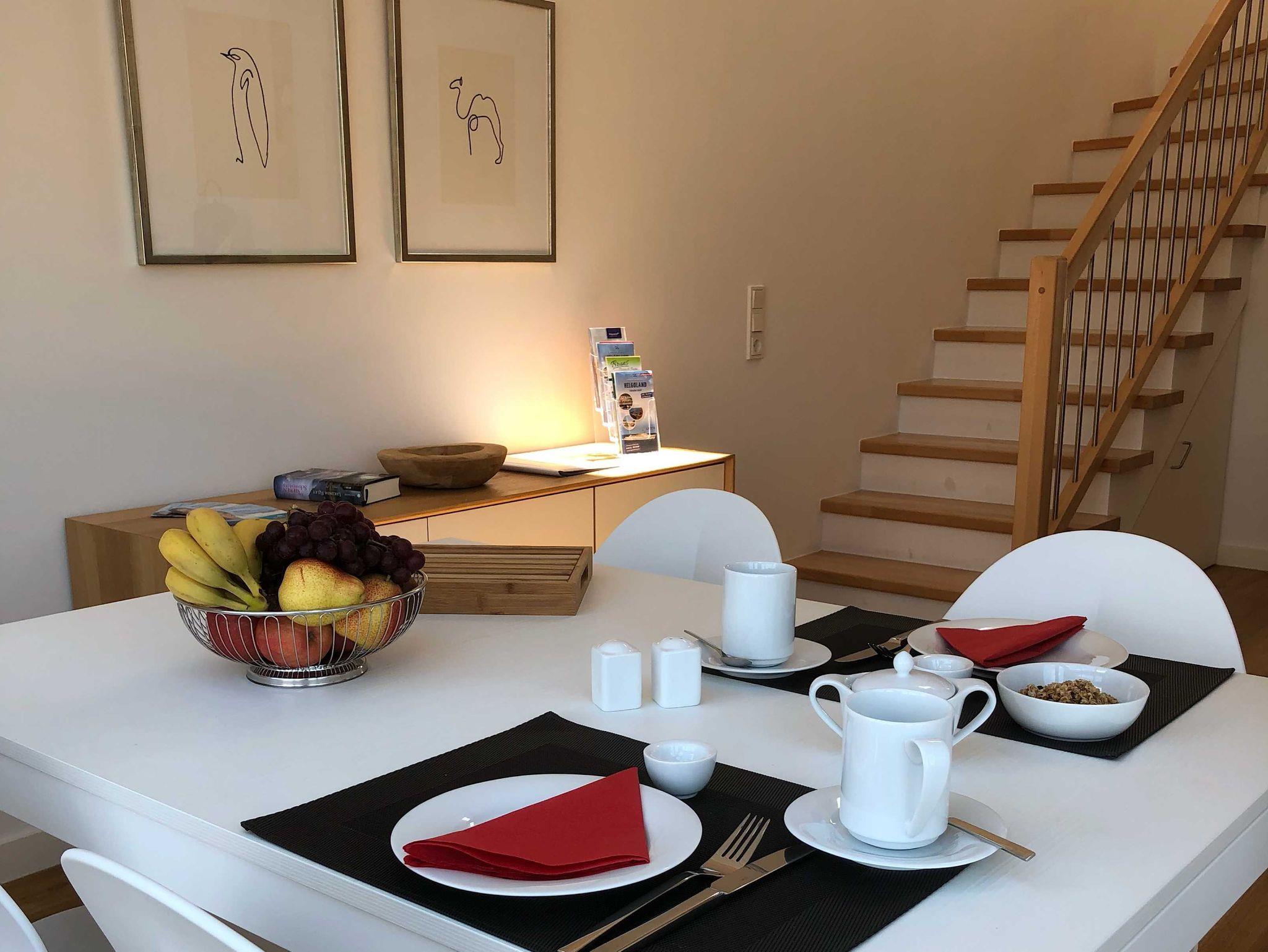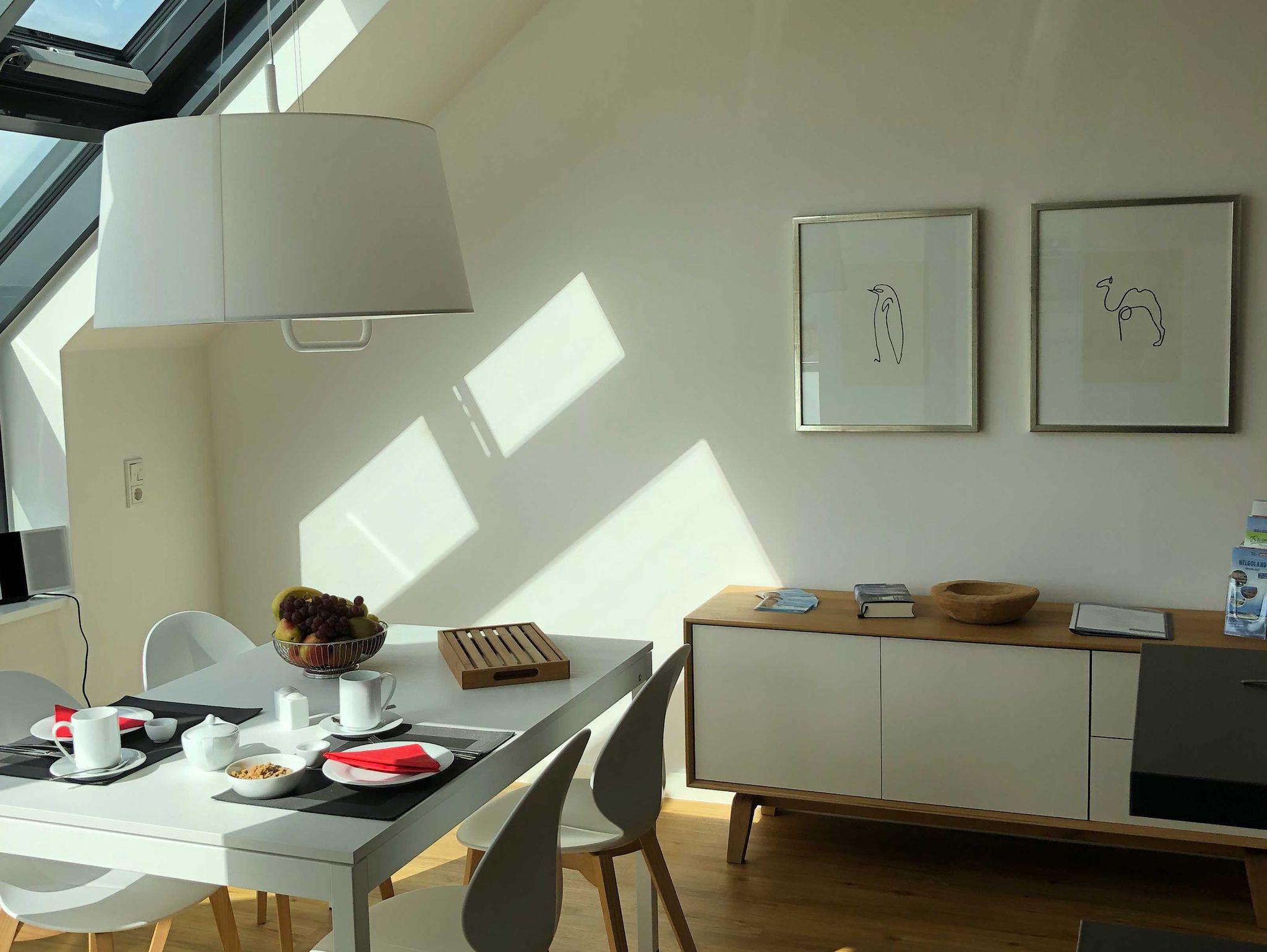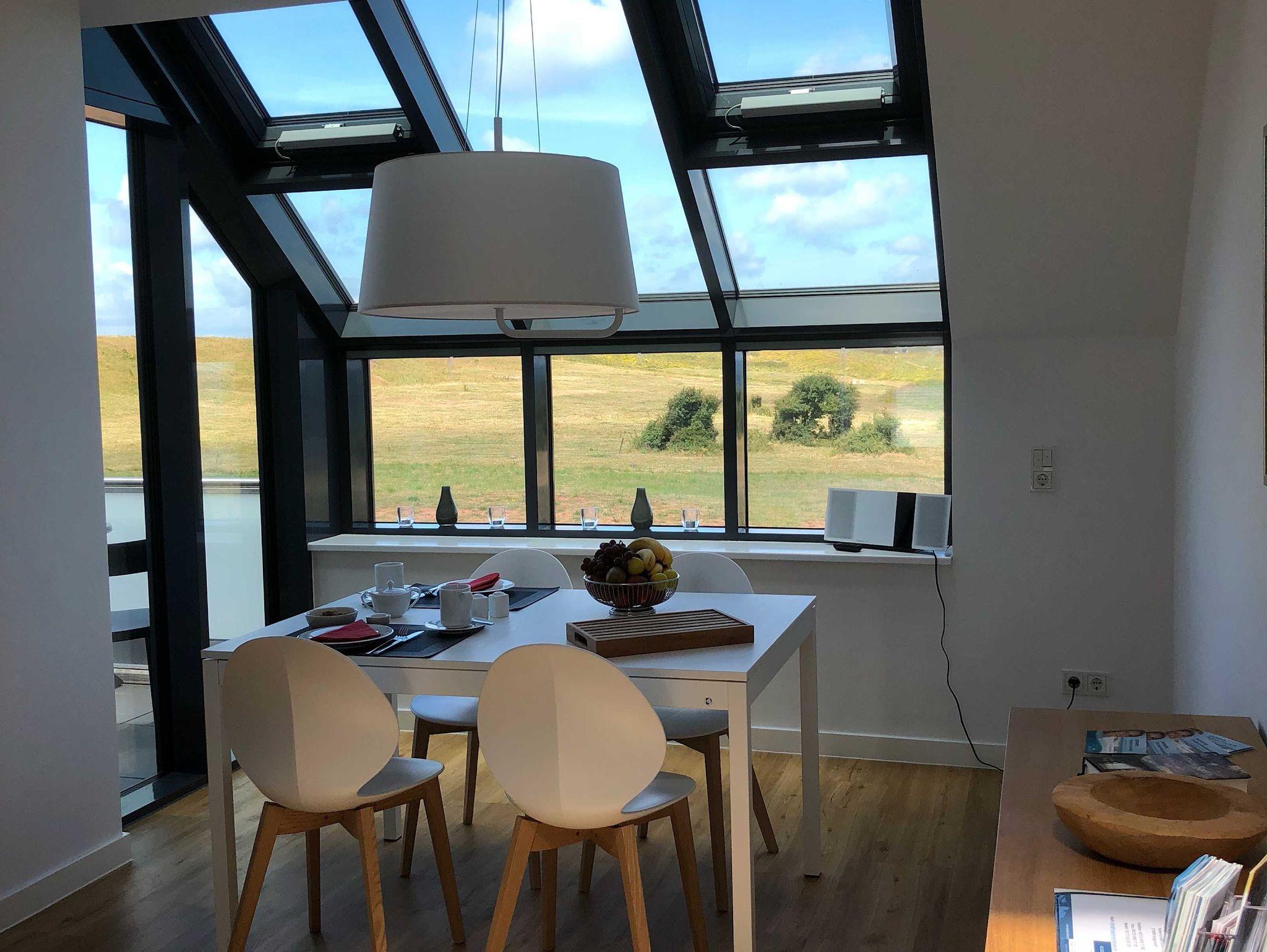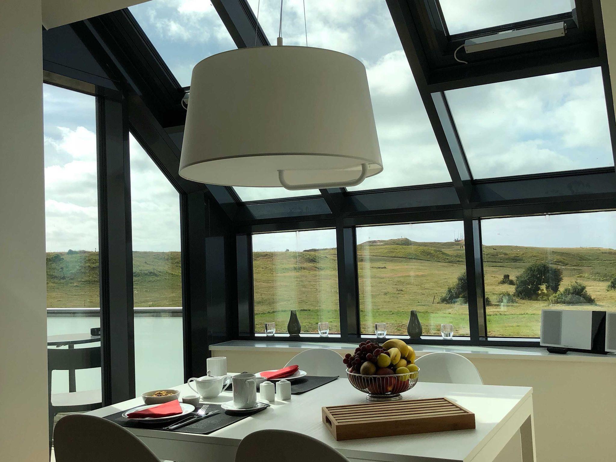 Die luxuriöse Wohnung hat ca. 70 qm Wohnfläche und verfügt in der unteren Etage über eine komplett ausgestattete Küche mit Geschirrspüler und Zugang zum Balkon, einen großzügigen Essbereich und Blick aus Meer und ins Grüne. Bad mit Dusche und WC, Schlafzimmer mit einem komfortablen Doppelbett. Im Studio in der oberen Ebene befindet sich ein Wohn/Schlafbereich mit Blick auf die Nordsee durch das Panoramadachfenster und Zugang zur Dachterrasse mit Blick auf den Leuchtturm und die Düne. WLAN, TV und Radio/Dockingstation sehen zur Verfügung. Bettwäsche und Handtücher sind inklusive und werden bei längeren Aufenthalten gewechselt. Es stehen Waschmaschinen und Trockner gegen Gebühr (Münzgeräte) im Untergeschoss zur Verfügung.