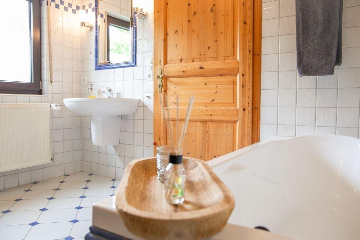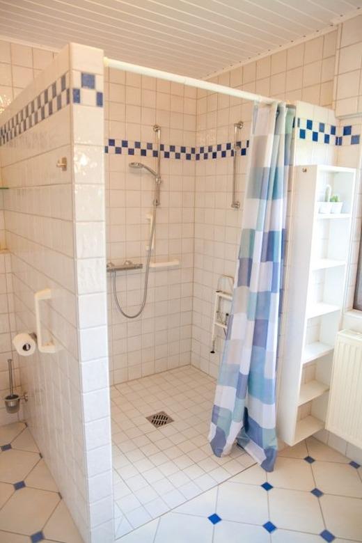 Im Erdgeschoss befinden sich sowohl ein großes Badezimmer mit begehbarer Dusche, einer Badewanne und einem WC als auch eine Waschküche mit Waschmaschine, Trockner, einer weiteren Dusche und einem seperat abgetrennten Gäste-WC. Das Schlafzimmer im Erdgeschoss verfügt über ein Etagenbett für zwei Personen (190 x 90 cm) sowie einen Kleiderschrank.