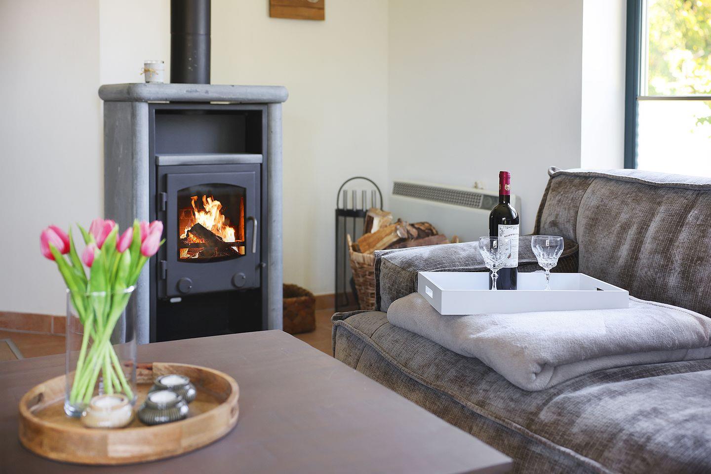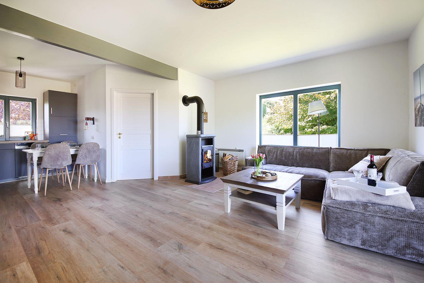 Sofa, Couchtisch, Smart-TV, Esstisch mit 4 Stühlen, Zugang zur Terrasse und Garten, Kamin-Ofen, Sonos Box