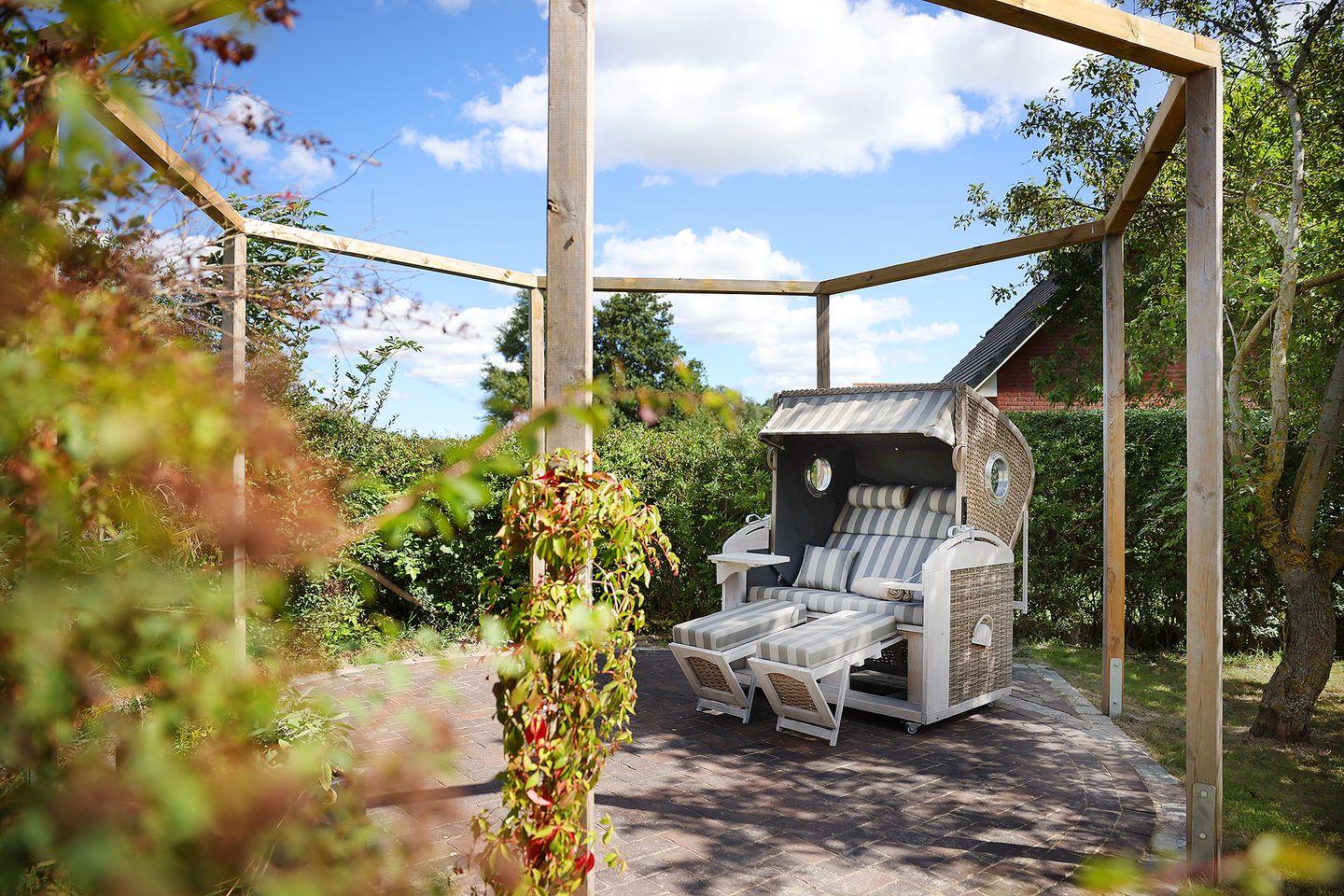 Terrasse, Garten, Sitzgruppe mit Tisch, Strandkorb, Außensauna
