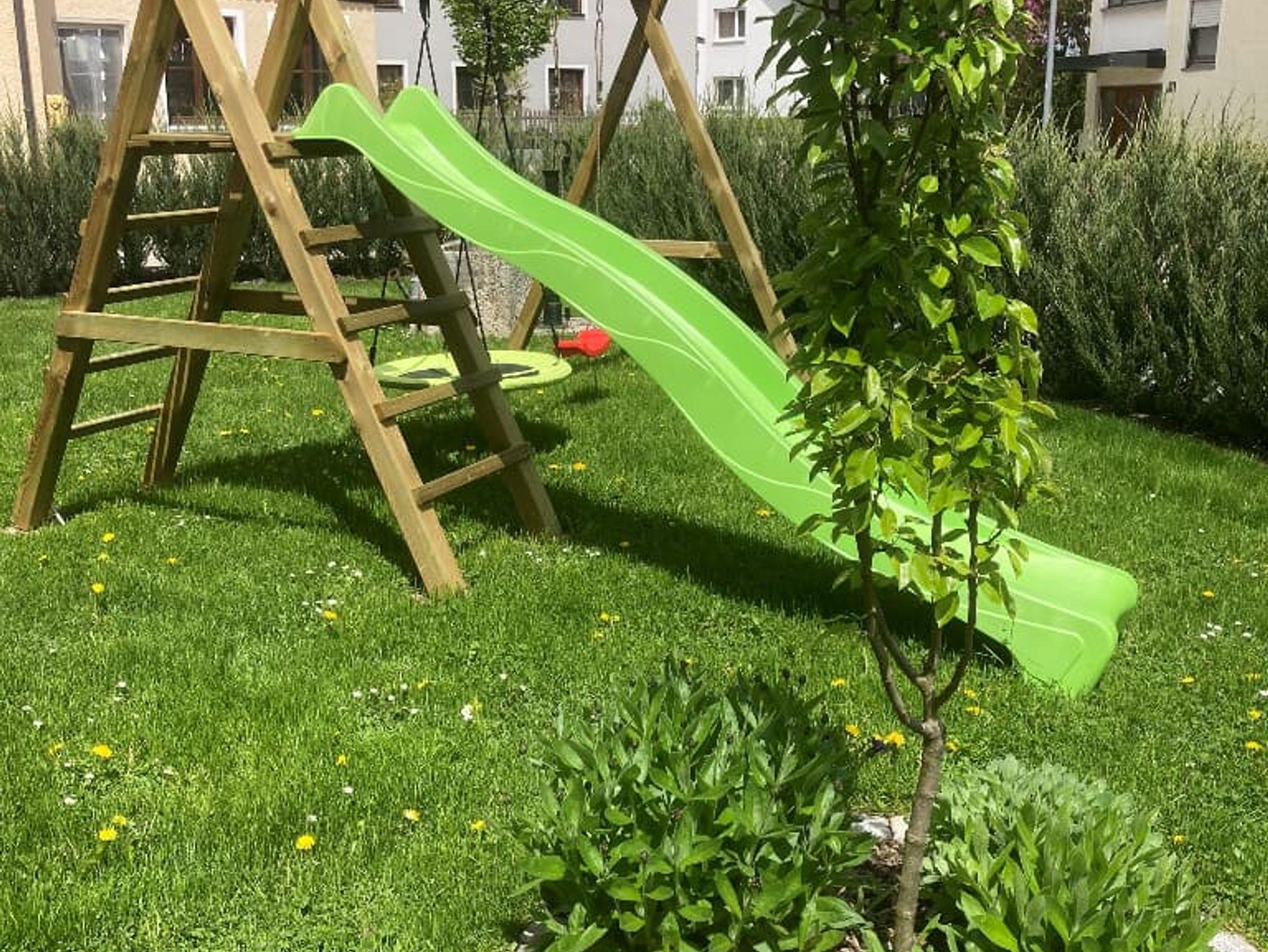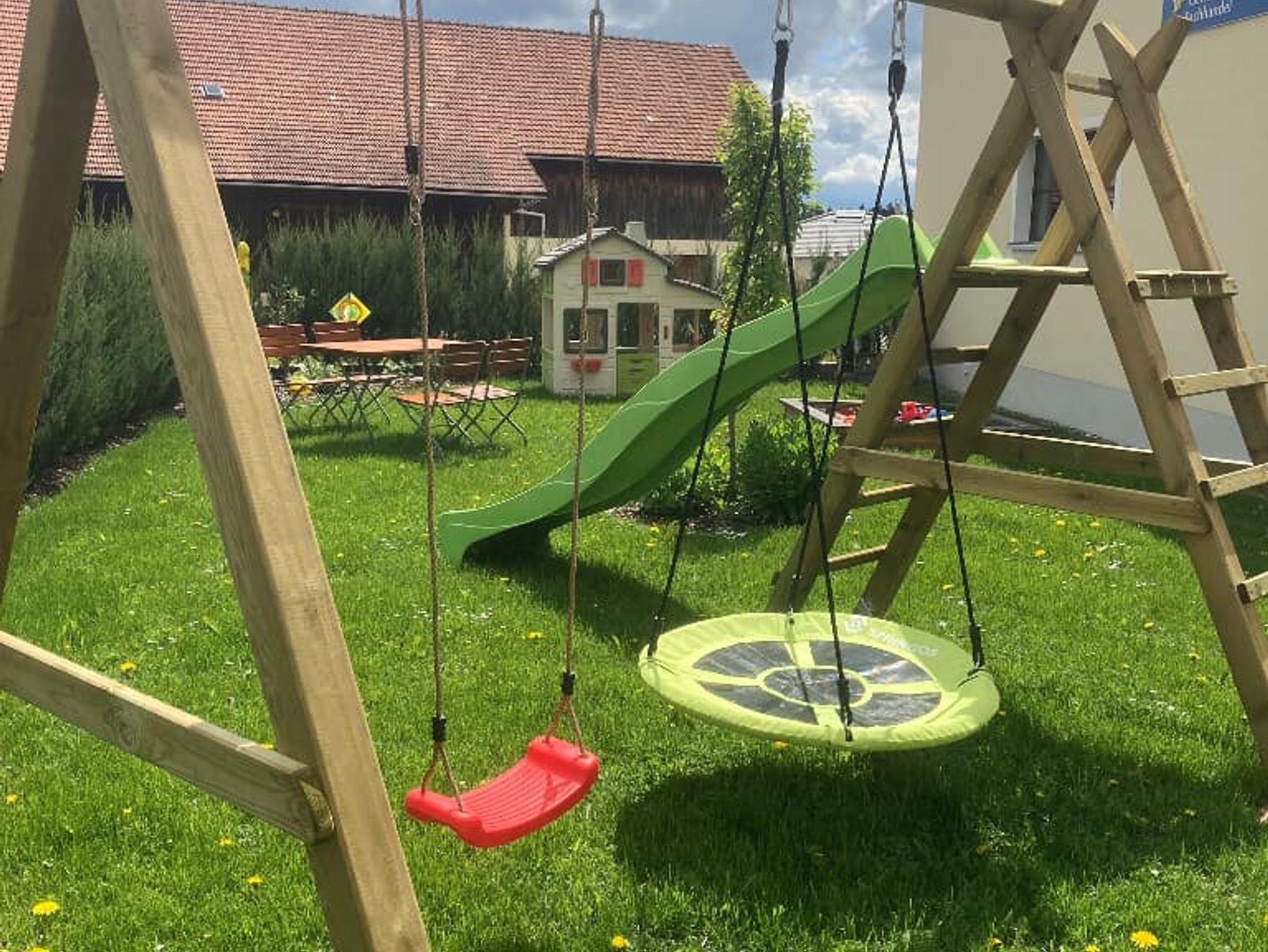 Gerne können zum Verweilen draußen unsere Sitzmöglichkeit im Garten nutzen. Kinder können sich an unseren Spielgeräten austoben. Eine Rutsche, eine Schaukel, eine Nestschaukel, sowie ein Sandkasten und ein Spielhaus sorgen für Abwechslung und Spaß.