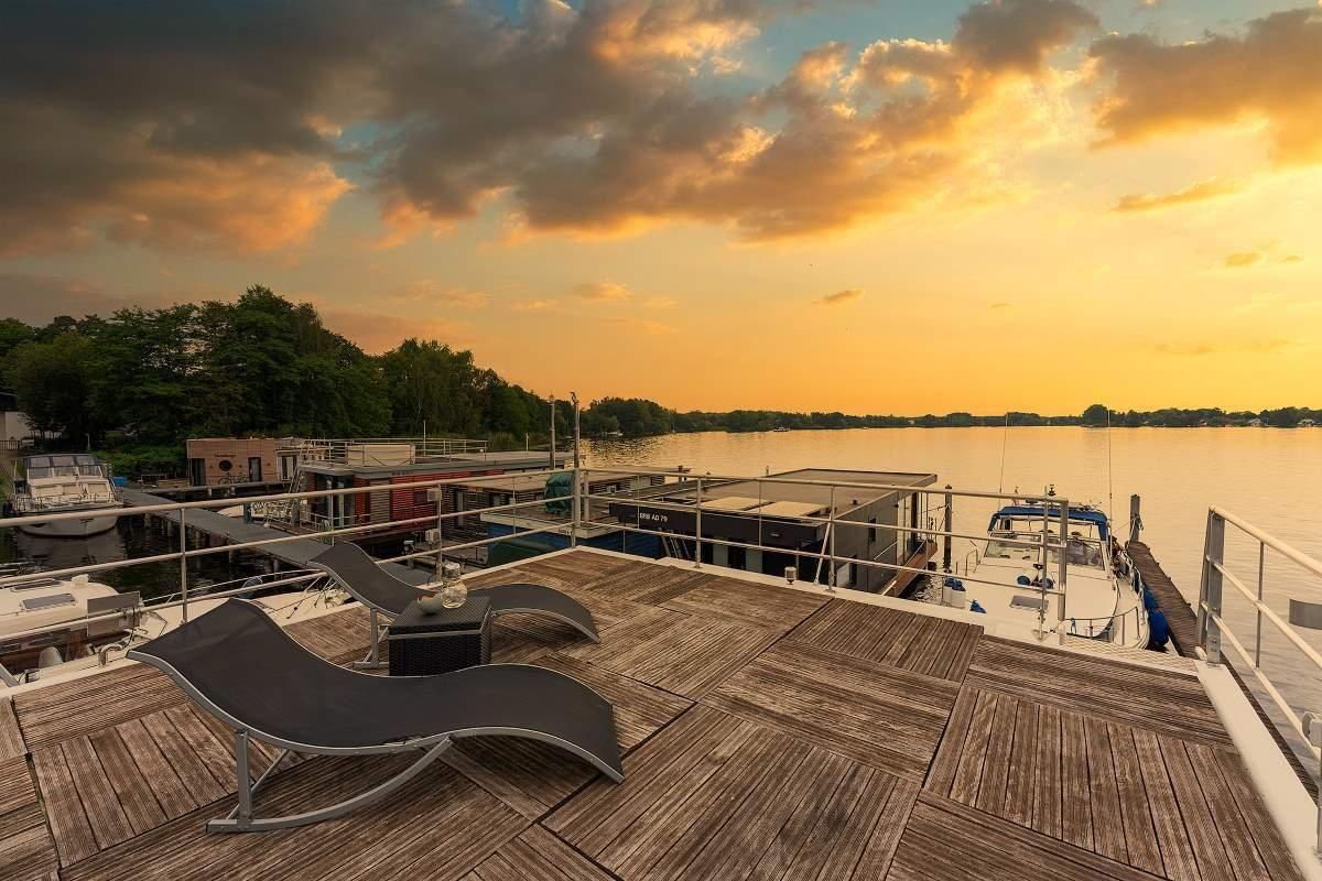 Floatinghouse Nike in Hennigsdorf bei Berlin: freistehendes Hausboot mit 44 m², 3 Zimmern, 2 Schlafzimmern und Platz für 4 Personen. Direkt auf dem See, Seeblick und Landschaftsblick, überdachter Terrasse mit Gartenmöbeln, Sonnenliegen und Sonnenschutz. Offene Küche zum Wohnzimmer mit Ceranherd, Spülmaschine, Kühlschrank mit Gefrierfach, Kaffeemaschine, Wasserkocher, Toaster und Elektrogrill. WLAN/TV, Klimaanlage, Privatparkplatz, Nichtraucher, familienfreundlich.