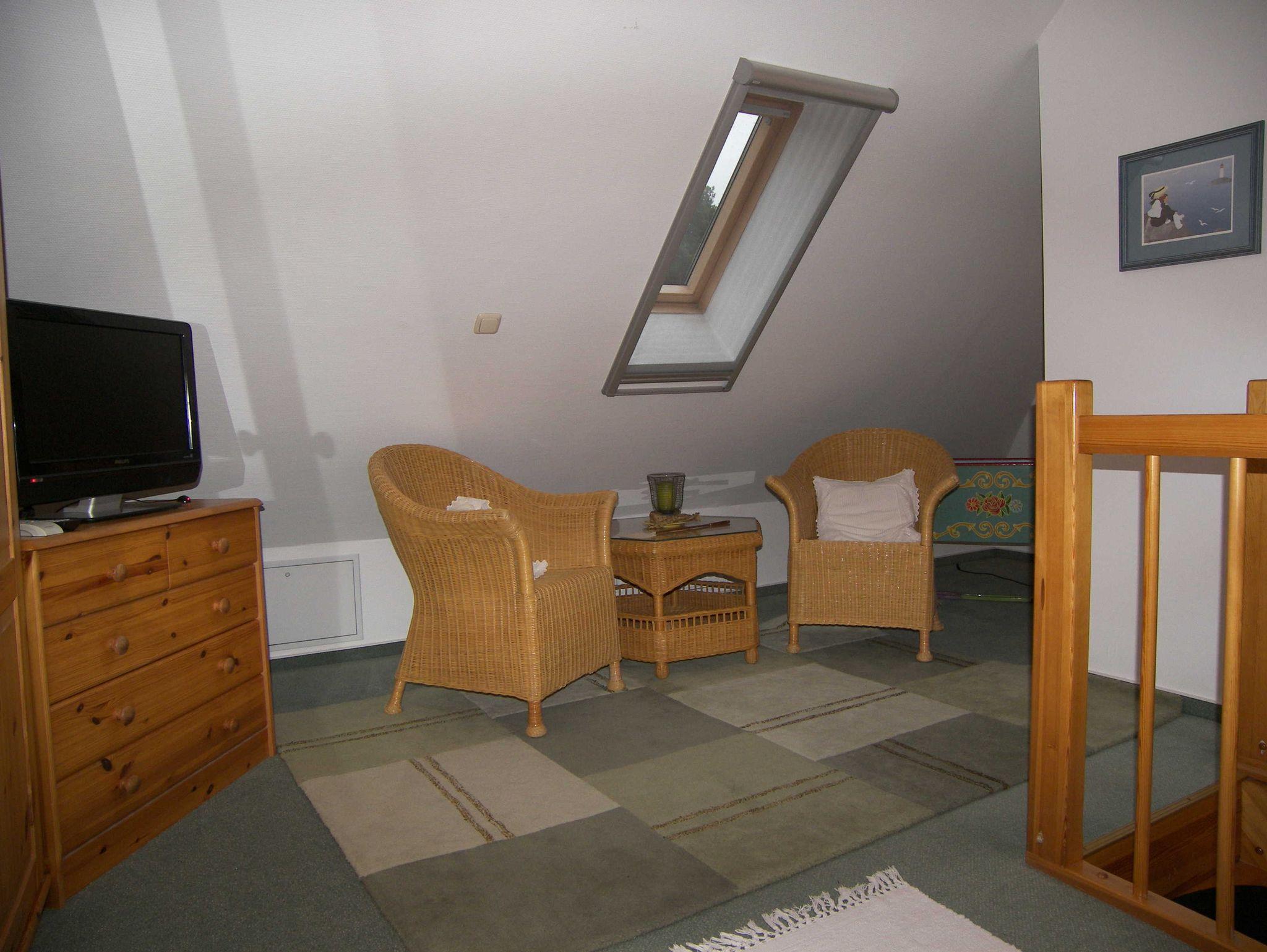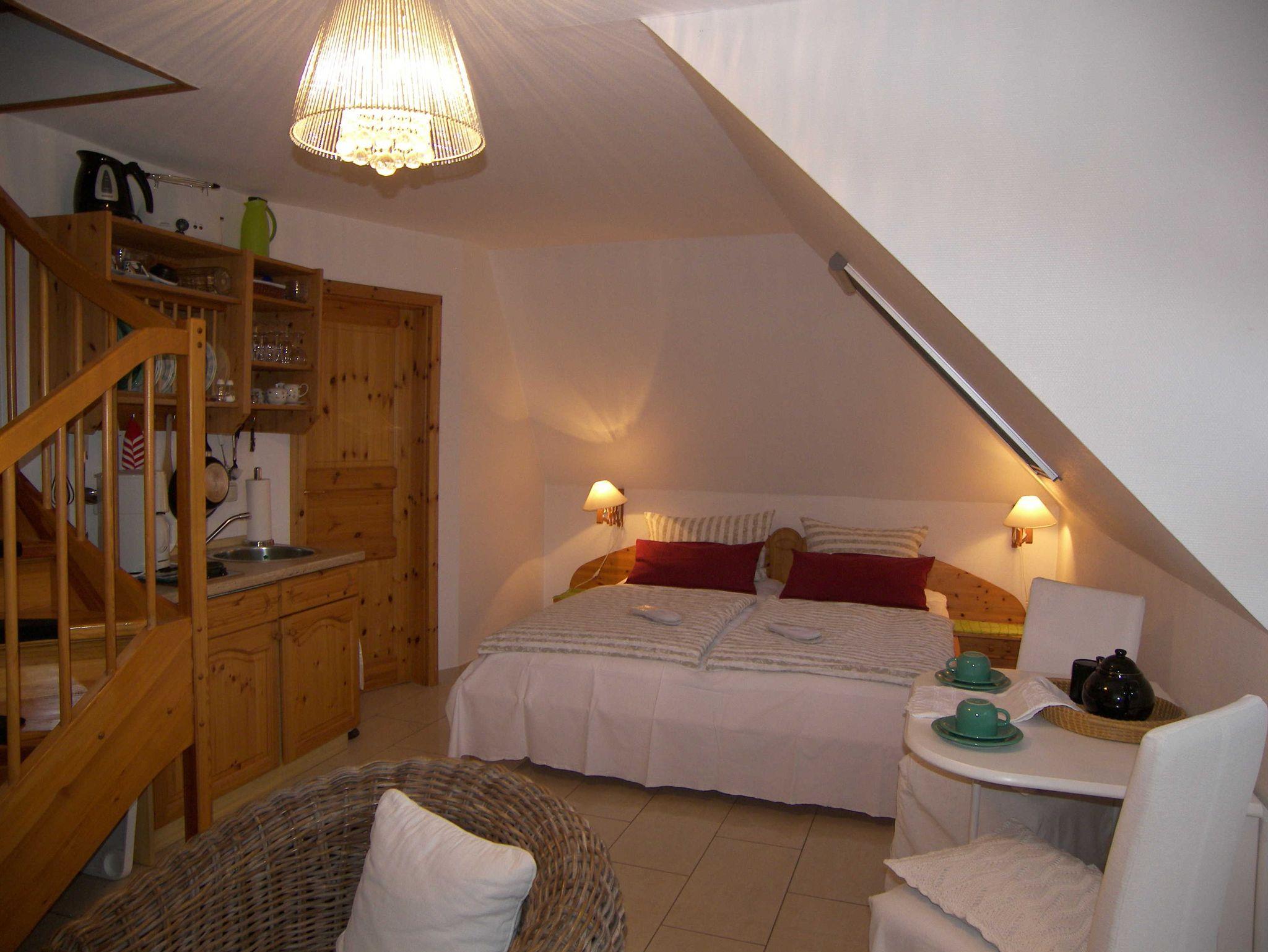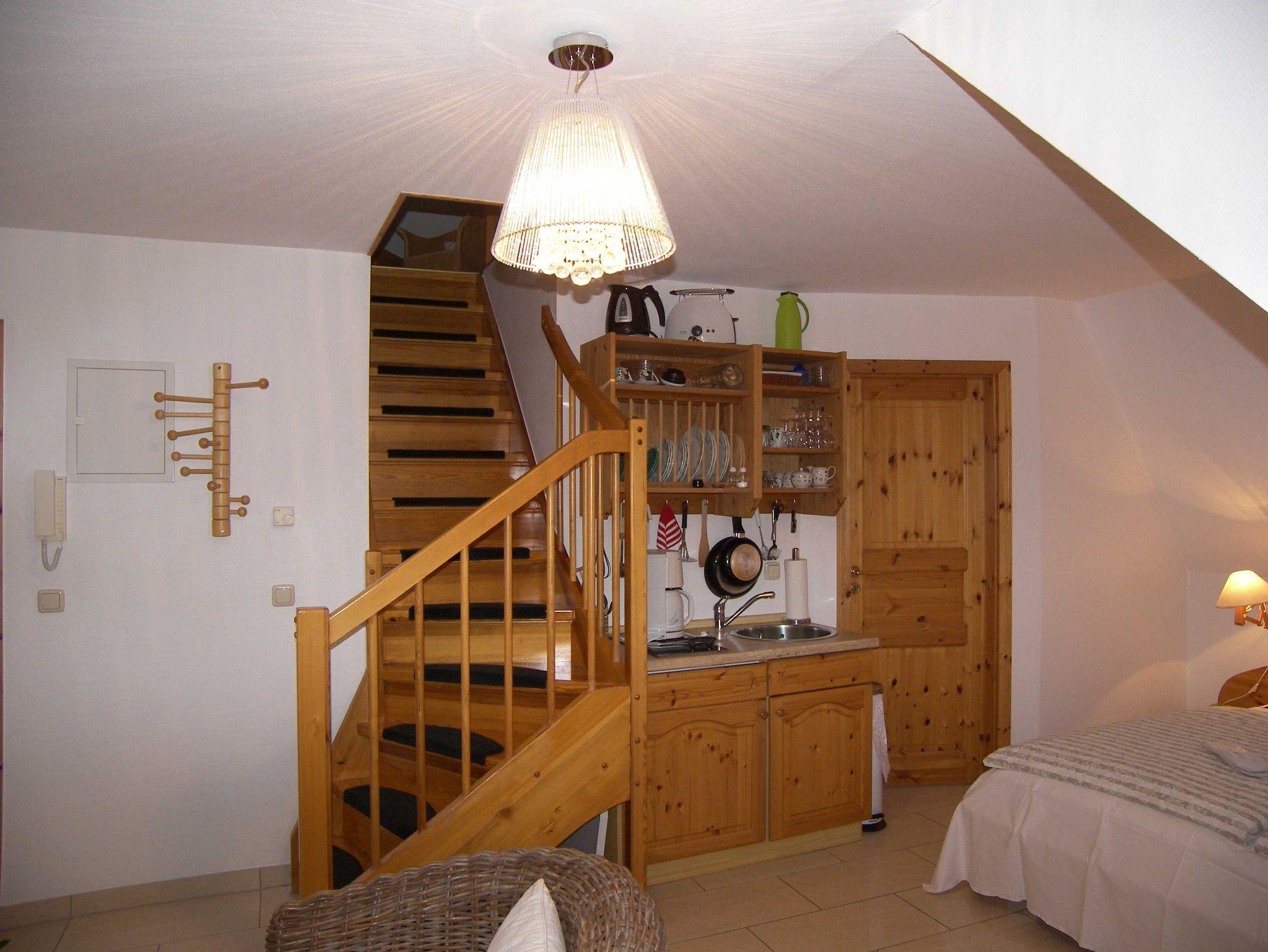 Die Maisonettewohnung befindet sich im 1. Obergeschoss und verfügt im unteren Bereich über einen kombinierten Wohn-/Schlafraum mit Doppelbett und gemütlicher Sitzecke, Flachbild-TV, Radio und W-LAN. Des Weiteren befindet sich auf gleicher Ebene die offene kleine Pantryküche mit 2-Kochfeld-Ceranplatte, Spülbecken, Kaffeemaschine, Toaster, Wasserkocher und Kühlschrank, sowie über einen kleinen Esstisch. Küchenrolle und ein Geschirrhandtuch werden bereitgestellt. Das Bad ist mit Dusche/WC, Handtuchheizung und Haartrockner ausgestattet. Über eine Treppe erreichen Sie den oberen Schlafbereich mit 2 Einzelbetten, einem großen Kleiderschrank.