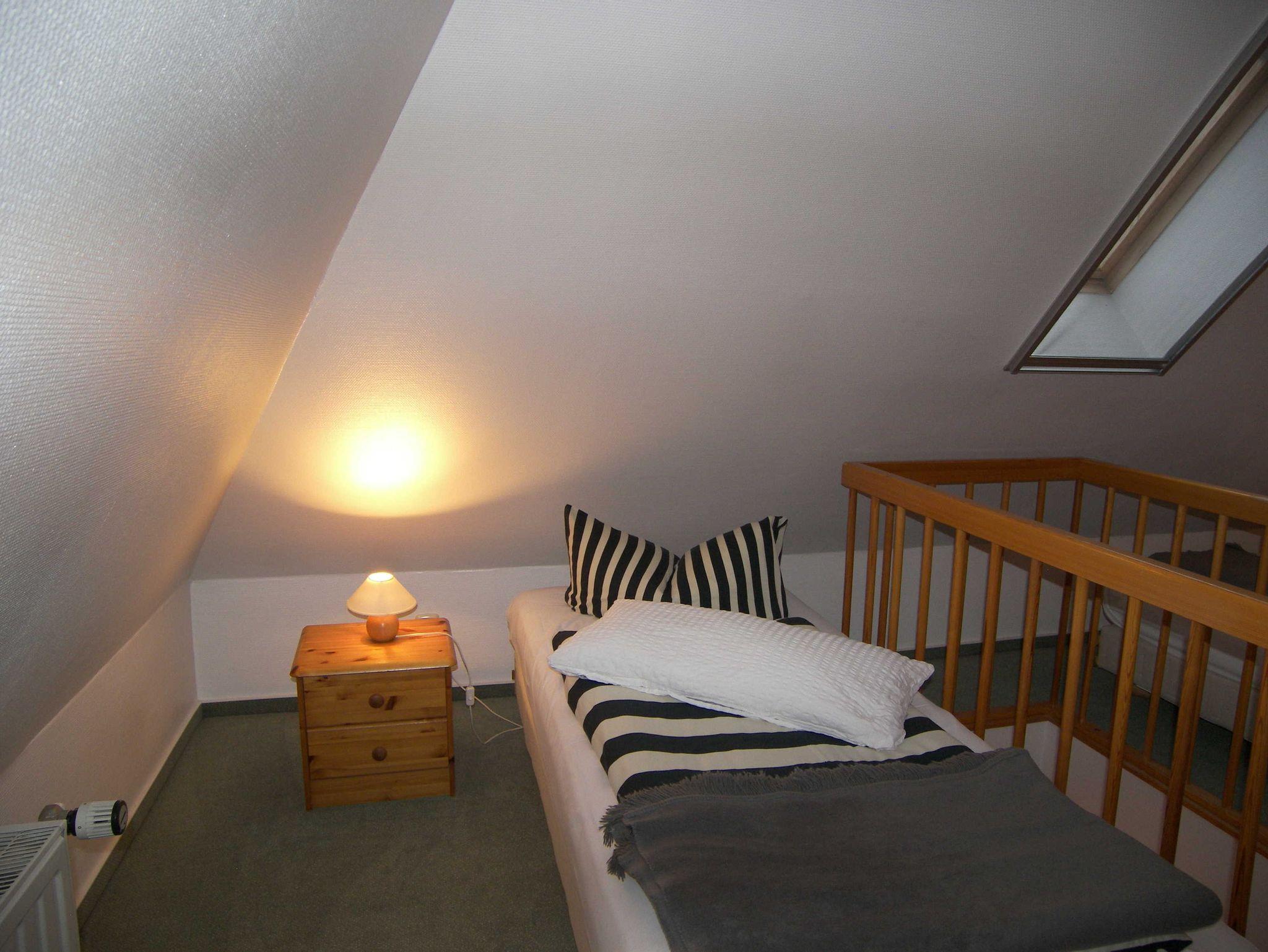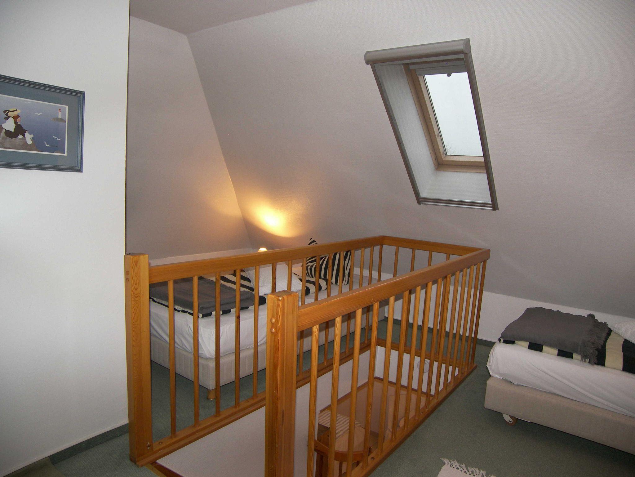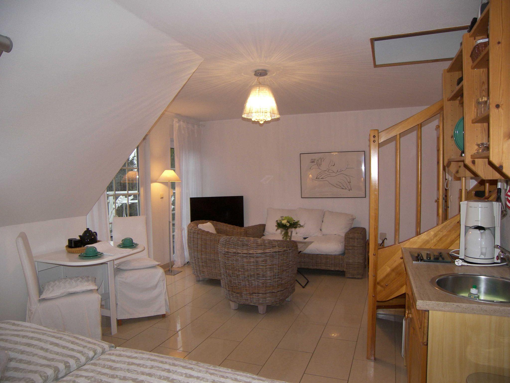 Die Maisonettewohnung befindet sich im 1. Obergeschoss und verfügt im unteren Bereich über einen kombinierten Wohn-/Schlafraum mit Doppelbett und gemütlicher Sitzecke, Flachbild-TV, Radio und W-LAN. Des Weiteren befindet sich auf gleicher Ebene die offene kleine Pantryküche mit 2-Kochfeld-Ceranplatte, Spülbecken, Kaffeemaschine, Toaster, Wasserkocher und Kühlschrank, sowie über einen kleinen Esstisch. Küchenrolle und ein Geschirrhandtuch werden bereitgestellt. Das Bad ist mit Dusche/WC, Handtuchheizung und Haartrockner ausgestattet. Über eine Treppe erreichen Sie den oberen Schlafbereich mit 2 Einzelbetten, einem großen Kleiderschrank.