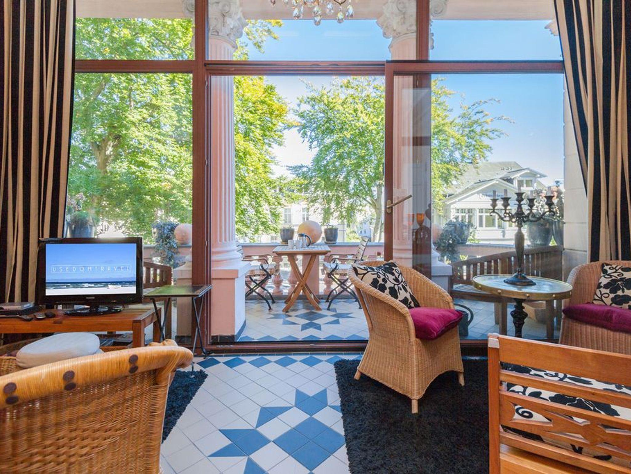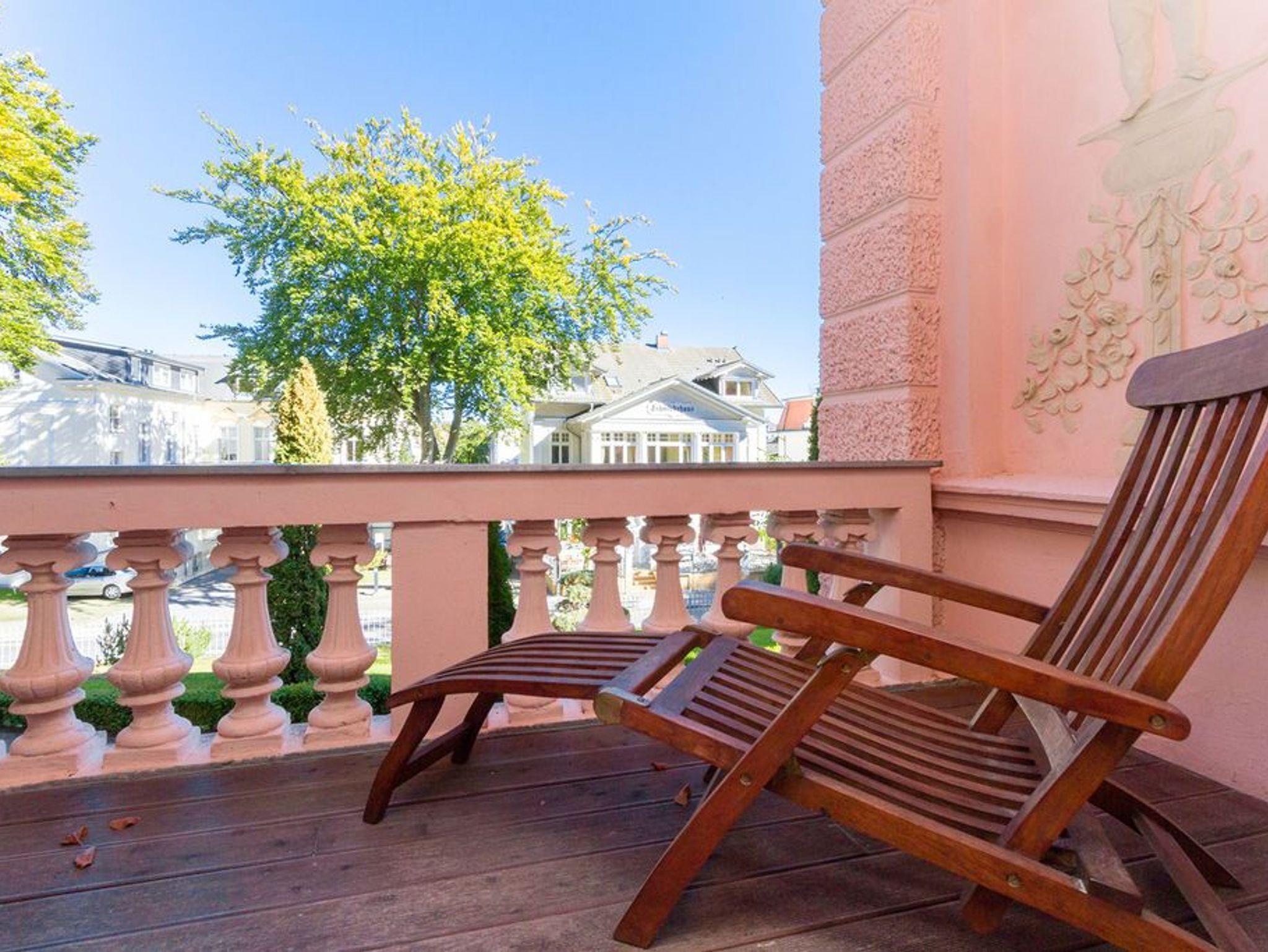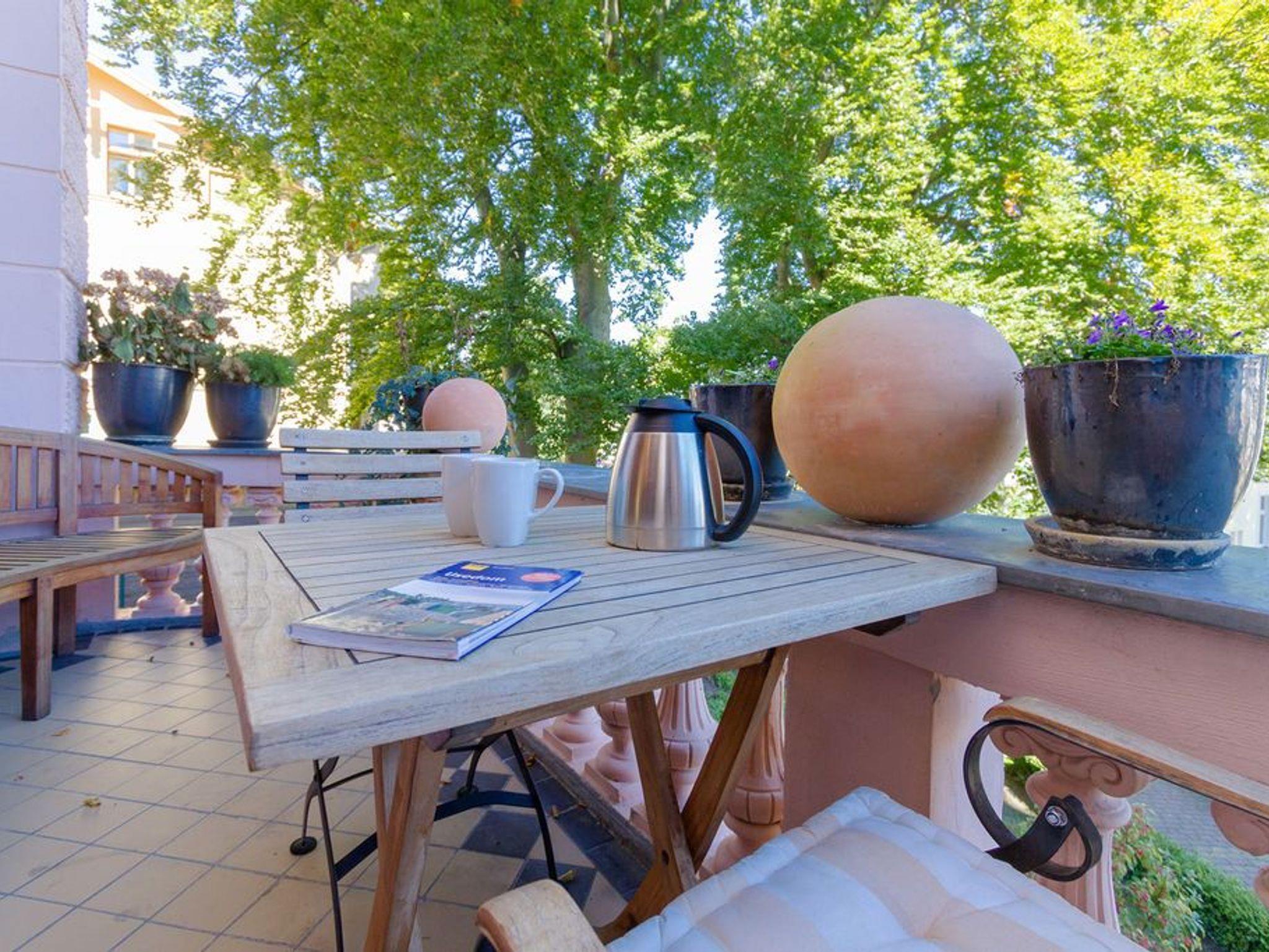 Die Ferienwohnung 6 ist im Hochparterre der Villa Hintze gelegen, verfügt über ein Wohnzimmer, eine verglaste Veranda, eine offene, komplett ausgestattete Küche, ein Schlafzimmer mit Doppelbett, ein Badezimmer offen im Schlafzimmer integriert mit Dusche und Badewanne, WC separat und einen großzügigen Balkon. Für die 3. Person steht eine Aufbettungsmöglichkeit im Wohnraum zur Verfügung. Für ein Kleinkind kann im Vorwege ein Kinderreisebett bestellt werden. Das W-Lan kann kostenfrei genutzt werden.