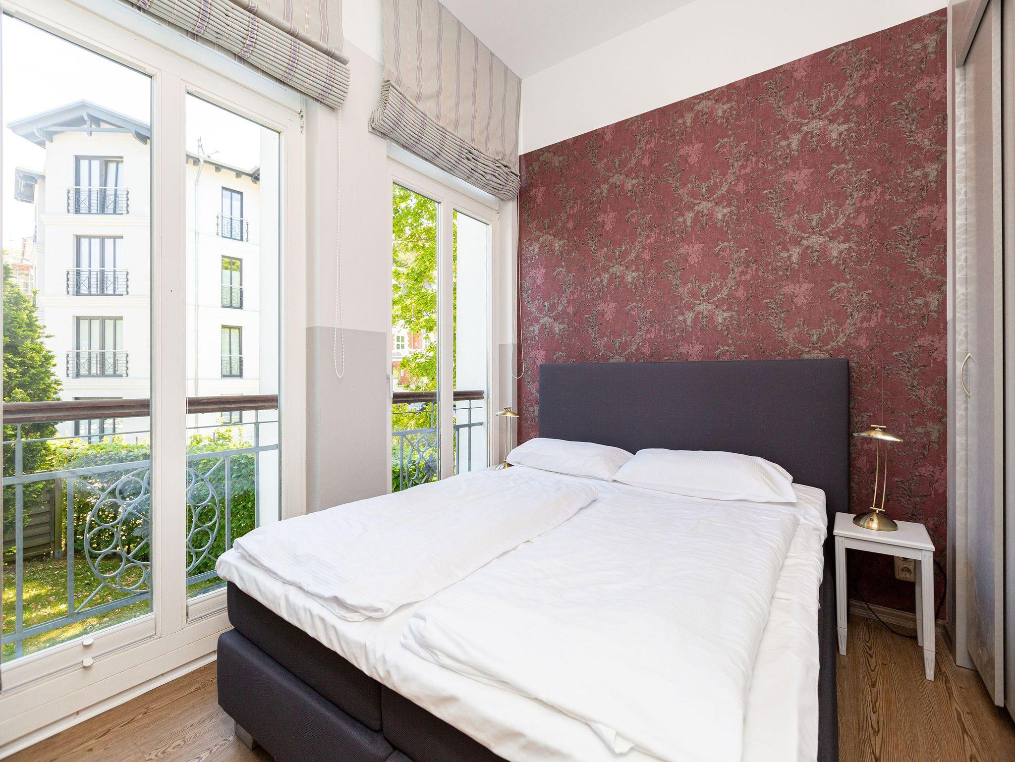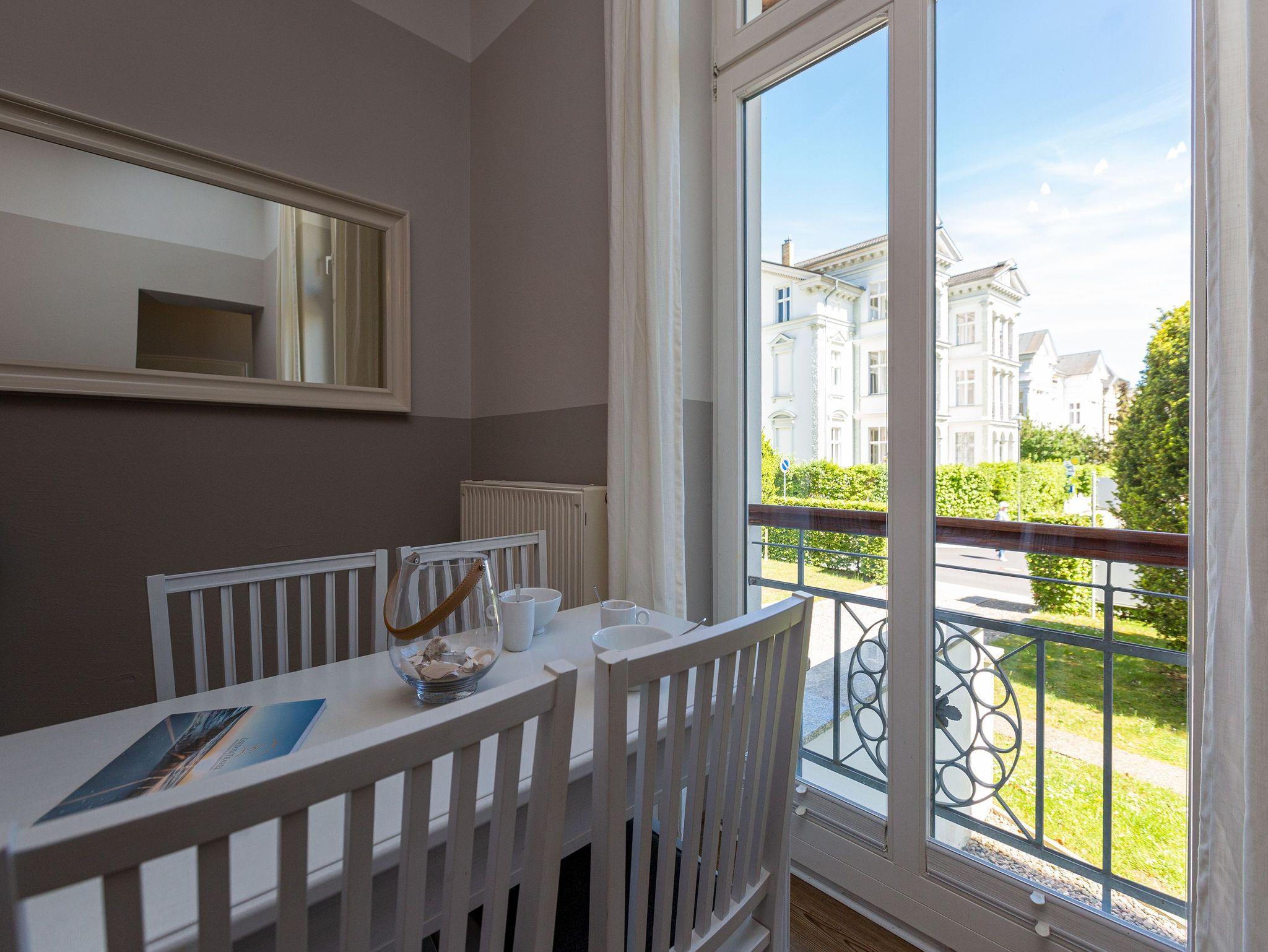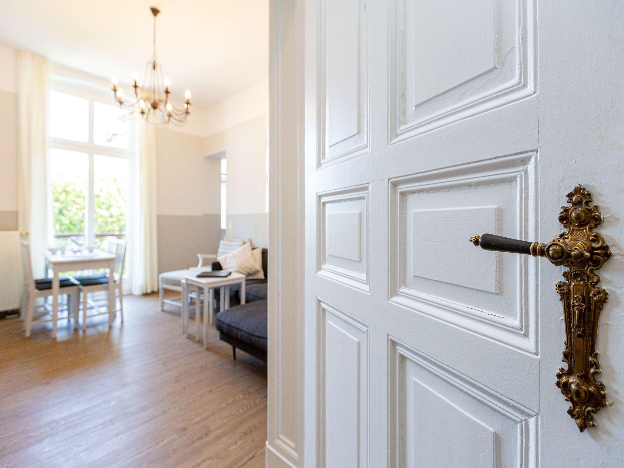 Ob Freunde oder Familie ? in den 50 Quadratmetern dieser exklusiven und eleganten Ferienwohnung im Hochparterre der Villa Amelia werden sich drei Erwachsene oder zwei Erwachsene und zwei Kinder garantiert rundum wohlfühlen. Denn zum Wohlfühlen ist dieses mit viel Liebe zum Detail eingerichtete Feriendomizil die ideale Bleibe. Ihren geliebten Vierbeiner dürfen Sie in dieses kleine Paradies gerne mitnehmen. Ein schönes großes und lichtdurchflutetes Wohnzimmer mit schicker Vintage-Sitzgruppe und einem schönen Essplatz ganz in Weiß wartet nur darauf, dass Sie es sich hier so richtig gemütlich machen und Ihre Zeit an der Ostsee vollauf genießen. Auf einem Sideboard befindet sich ein großer Flat-TV fürs Home-Entertainment. Die kleine, offene Küche ist mit allen notwendigen Geräten ausgestattet. Geschirr finden Sie in den Küchenschränken. Die Wohnung verfügt über zwei Schlafzimmer mit jeweils einem bequemen Boxspringdoppelbett und einem Schrank. Bei Ihrer Anreise haben wir die Betten bereits für Sie bezogen und im Badezimmer liegen Handtücher für Sie bereit. Das zur wunderschön sanierten Villa passende Bad besitzt eine Dusche, einen Waschtisch und ein WC. Das WLAN-Netz im Haus kann kostenfrei genutzt werden. Ihr Auto können Sie auf dem zum Haus gehörenden Parkplatz abstellen.