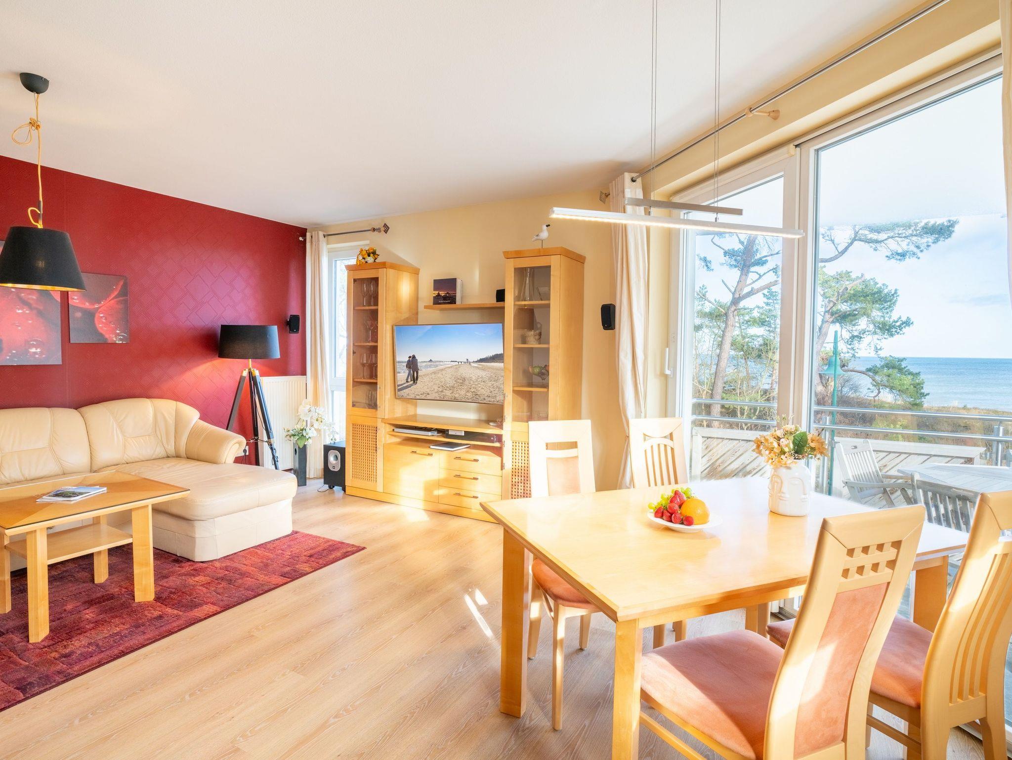 Auf 67 Quadratmetern erstreckt sich die Wohnfläche und lädt Dank dieser Großzügigkeit bis zu vier Personen zu einem erholsamen Urlaub in idealer Strandlage ein. Modern und gemütlich zugleich - auf Ihrem Balkon können Sie bereits beim morgendlichen Kaffee den Wellen der Ostsee lauschen. Der stilvolle Wohnbereich verfügt über ein komfortables, großzügiges Sofa und Flat-TV. Die einladende Küchenzeile rundum mit allem ausgestattet, was für Ihre Lieblingsspeisen nötig ist (inkl. Ceranfeld, Backofen, Mikrowelle, Kühlschrank, Gefrierschrank, Geschirrspüler, Wasserkocher, Toaster und Kaffeemaschine). An dem großzügigem Essplatz kann die ganze Familie in geselliger Runde die zubereiteten Speisen genießen. Vom Wohnzimmer aus erreichen Sie Ihren Balkon mit Meerblick, der zum Sonnenbaden oder zur abendlichen Spielrunde einlädt. Das Schlafzimmer ist mit einem bequemen Doppelbett (200x200cm) ausgestattet. Für zwei weitere Urlaubsgäste kann die Schlafcouch im Wohnbereich für eine erholsame Nachtruhe und einen guten Start in den neuen Urlaubstag ausgezogen und als komfortable Schlafstätte genutzt werden. Damit Sie Ihre wohlverdiente Urlaubszeit bereits am Anreisetag in vollen Zügen genießen können - haben wir das Bett für Sie und das für Ihre lieben Mitreisenden bereits bezogen und ein Duschtuch sowie ein kleines Handtuch bereitgelegt.