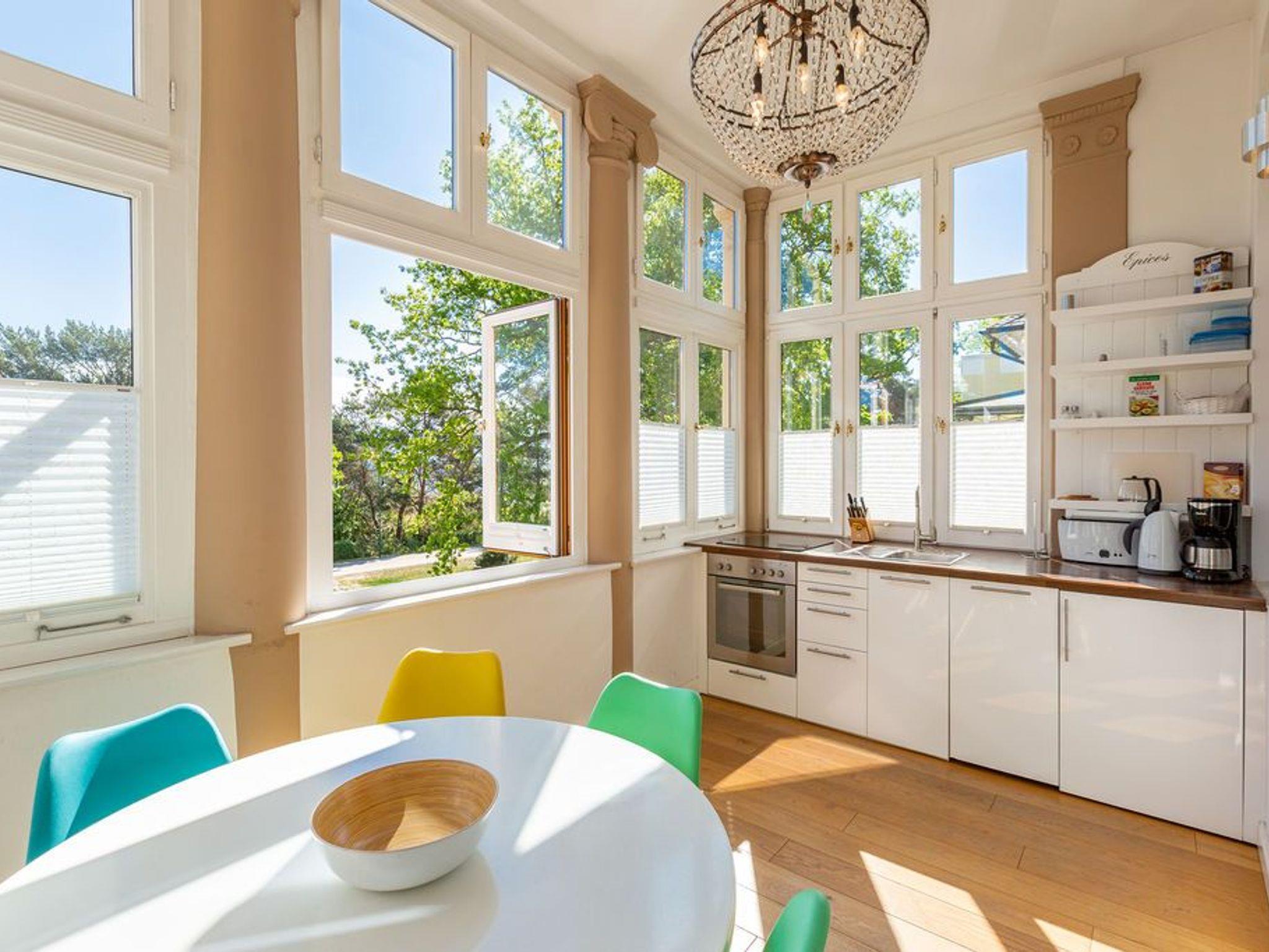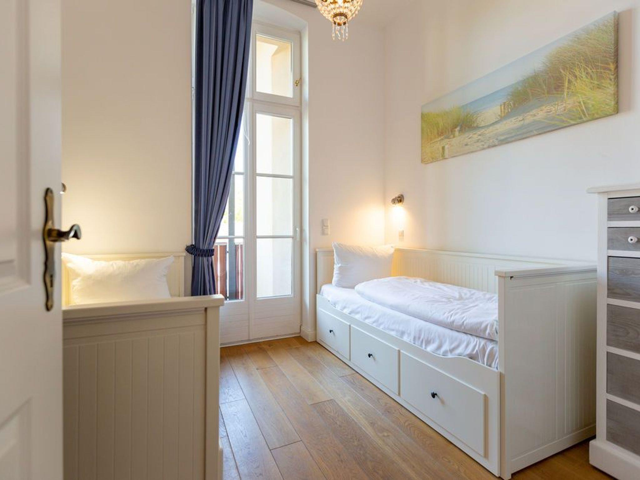 Freuen Sie sich auf eine erholsame Auszeit in der 3-Raum-Ferienwohnung Nr. 09 (79 qm) in der 1. Etage der charmanten Villa Saphira. Die Wohnung bietet Platz für bis zu 4 Personen und 1 Kleinkind (bis 3 Jahre) und überzeugt durch ihre stilvolle Einrichtung, eine Loggia mit Promenadenblick und einen eingeschränkten Meerblick durch die Begrünung. Der helle Wohnbereich ist mit einer gemütlichen Sitzgruppe, einem Kaminofen und einem Flat-TV ausgestattet und lädt zu entspannten Stunden ein. Direkt angrenzend finden Sie die charmante Loggia mit Küchenzeile, Essplatz und einem wunderschönen Blick zur Promenade. Die beiden Schlafzimmer bieten höchsten Schlafkomfort: Ein Schlafzimmer verfügt über zwei Einzelbetten (0,80 m x 2,00 m), Flat-TV und Zugang zum sonnigen Südbalkon (ca. 7 qm). Das zweite Schlafzimmer ist mit einem großzügigen Doppelbett (1,80 m x 2,00 m) und ebenfalls einem Flat-TV ausgestattet. Das moderne Badezimmer mit Dusche und WC rundet das Komfortangebot ab. Kostenloses WLAN und ein eigener PKW-Stellplatz am Haus stehen Ihnen ebenfalls zur Verfügung. Für Familien stellen wir auf Wunsch ein Kinderreisebett (ohne zusätzliche Matratze und Bettzeug) und einen Hochstuhl gegen einen kleinen Aufpreis bereit. Damit Sie sich von Anfang an wohlfühlen, sind die Betten bei Ihrer Ankunft bereits bezogen, und eine Erstausstattung mit Handtüchern liegt für Sie bereit. Genießen Sie die perfekte Kombination aus Komfort, Eleganz und einer hervorragenden Lage in der Villa Saphira. Wir freuen uns darauf, Sie willkommen zu heißen!