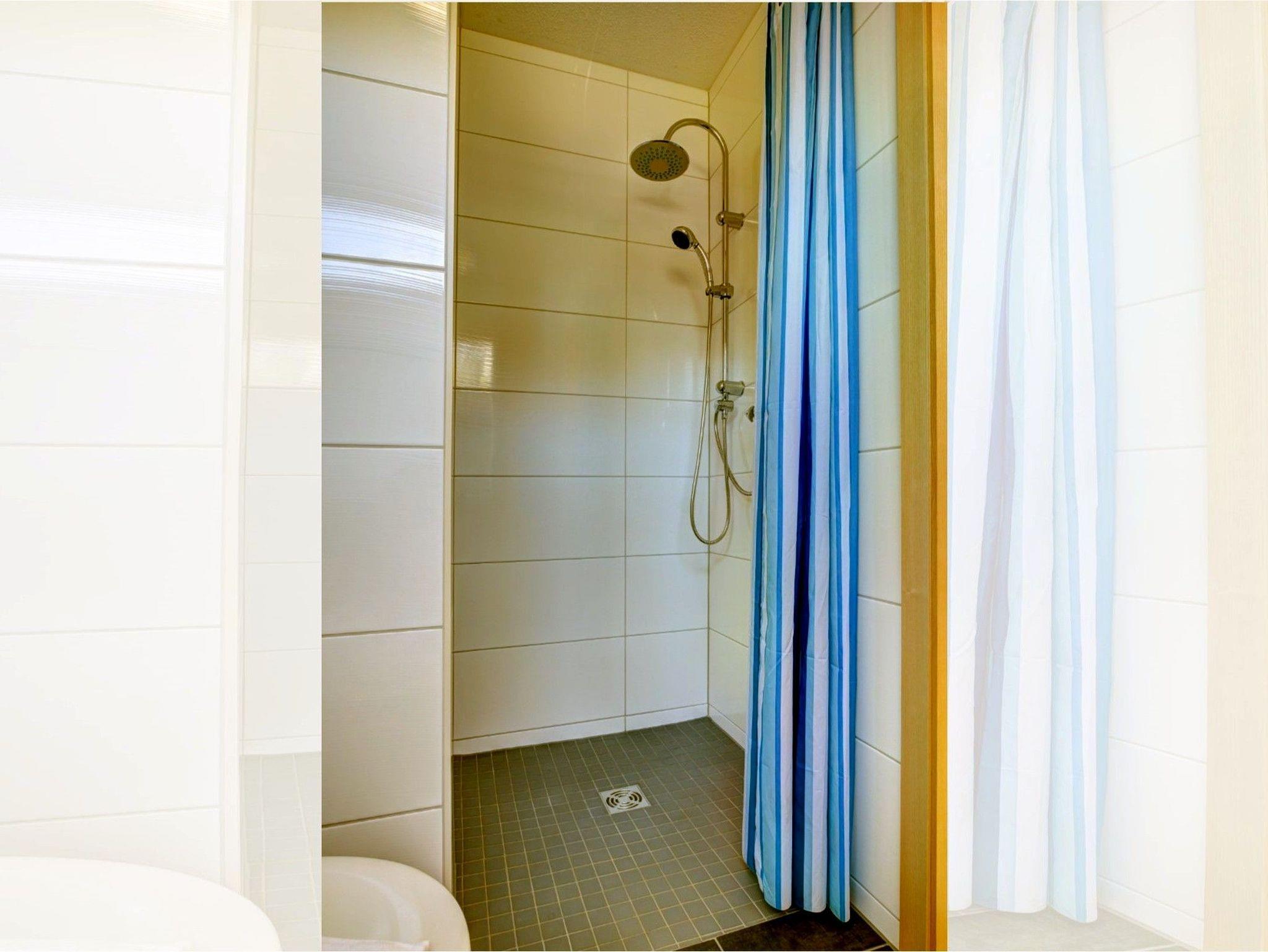 Das separate Badezimmer verfügt über eine ebenerdige Dusche, ein Waschbecken, ein WC, ein Fenster und ein kleiner Schrank unter dem Waschbecken, indem Sie Ihre Habseligkeiten verstauen können. Seife und ein Erstvorrat an Toilettenpapier ist natürlich vorhanden.