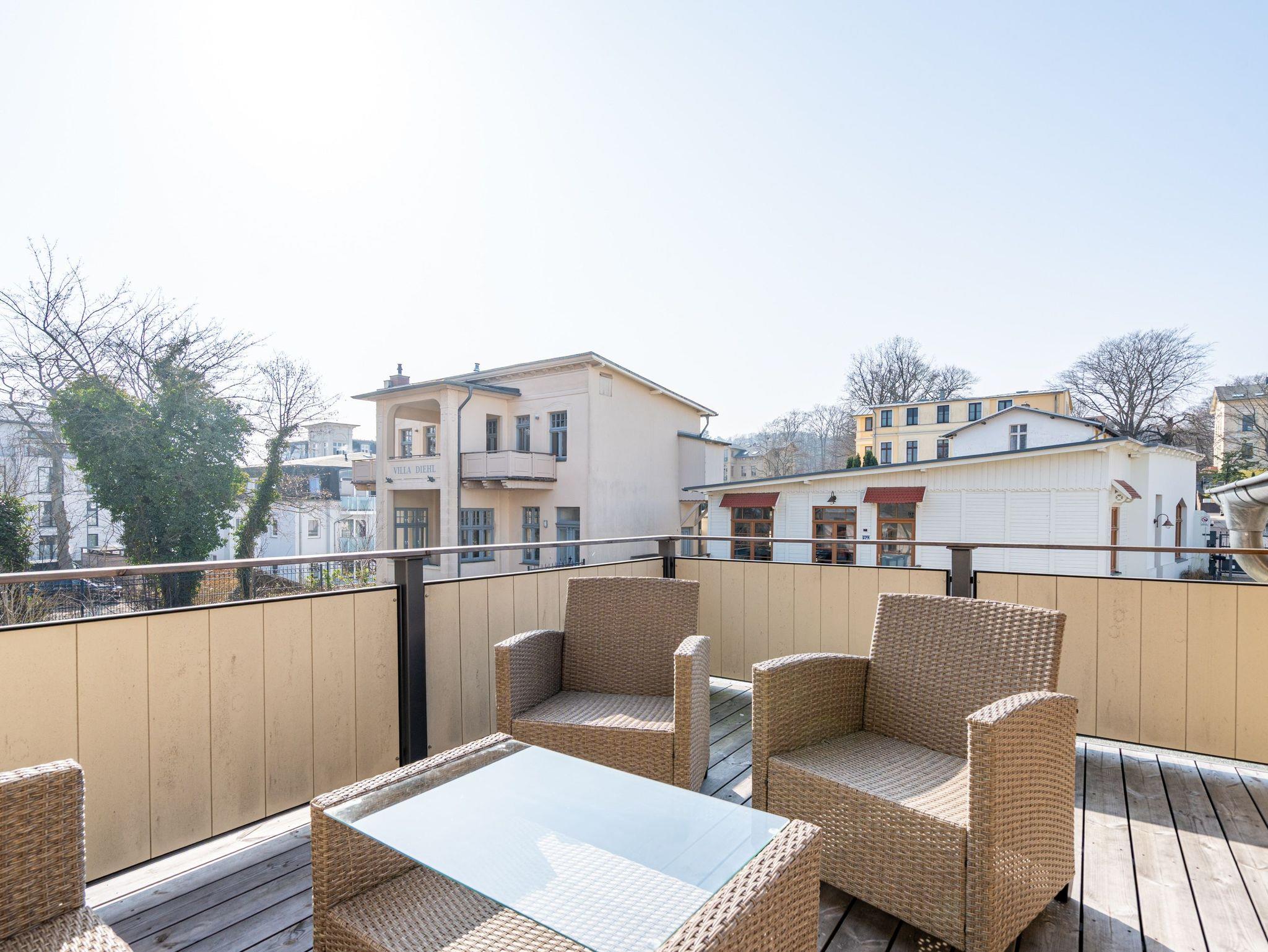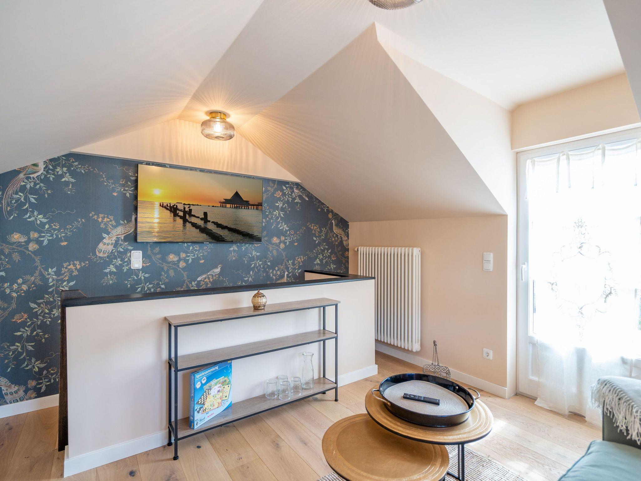 Die obere Etage lädt zum Entspannen im offenen Wohnzimmer ein, das mit einer komfortablen Sitzgruppe (Schlafcouch als Aufbettung für 3. Person möglich) und einem großzügigen Smart-TV (55 Zoll) ausgestattet ist. Von hier aus haben Sie Zugang zur 14 Quadratmeter großen Dachterrasse mit einer gemütlichen Loungeecke, perfekt für laue Sommerabende. Während der Sommermonate steht Ihnen die Nutzung eines Strandkorbs am Strand zur Verfügung. Für Ihren PKW gibt es einen Außenstellplatz Nr. 6 direkt am Haus, und ein überdachter Fahrradständer ist ebenfalls vorhanden. Erleben Sie entspannte Tage in der Villa Saphira und genießen Sie Ihren Urlaub in diesem stilvollen Ferienappartement an der Küste.
