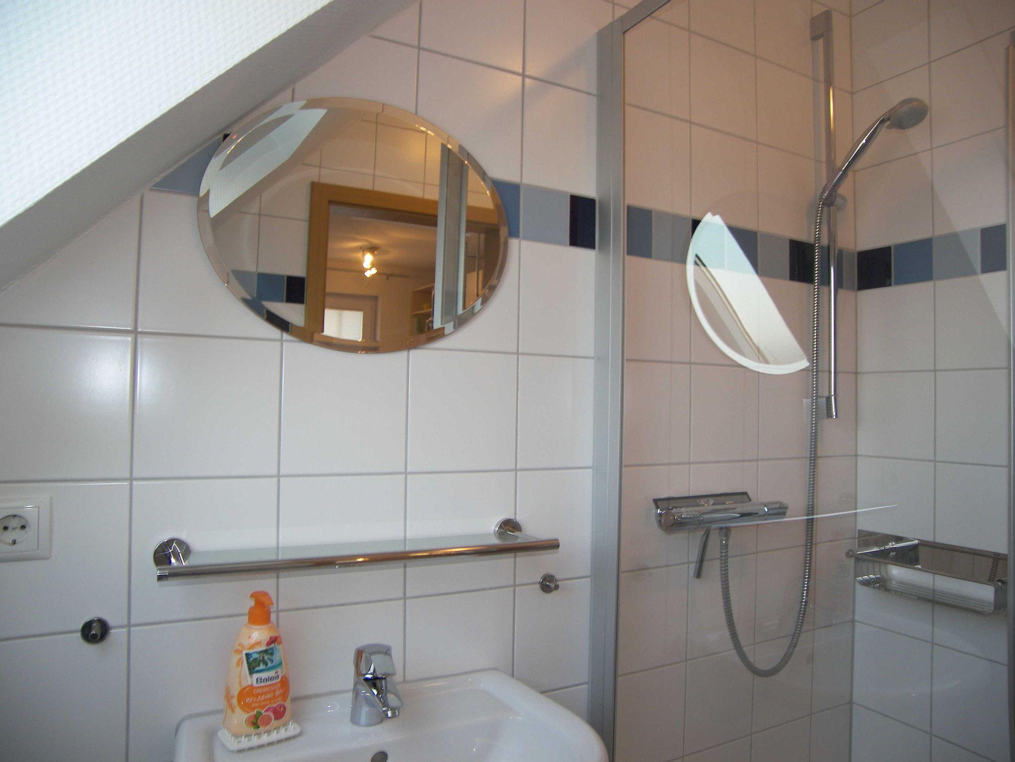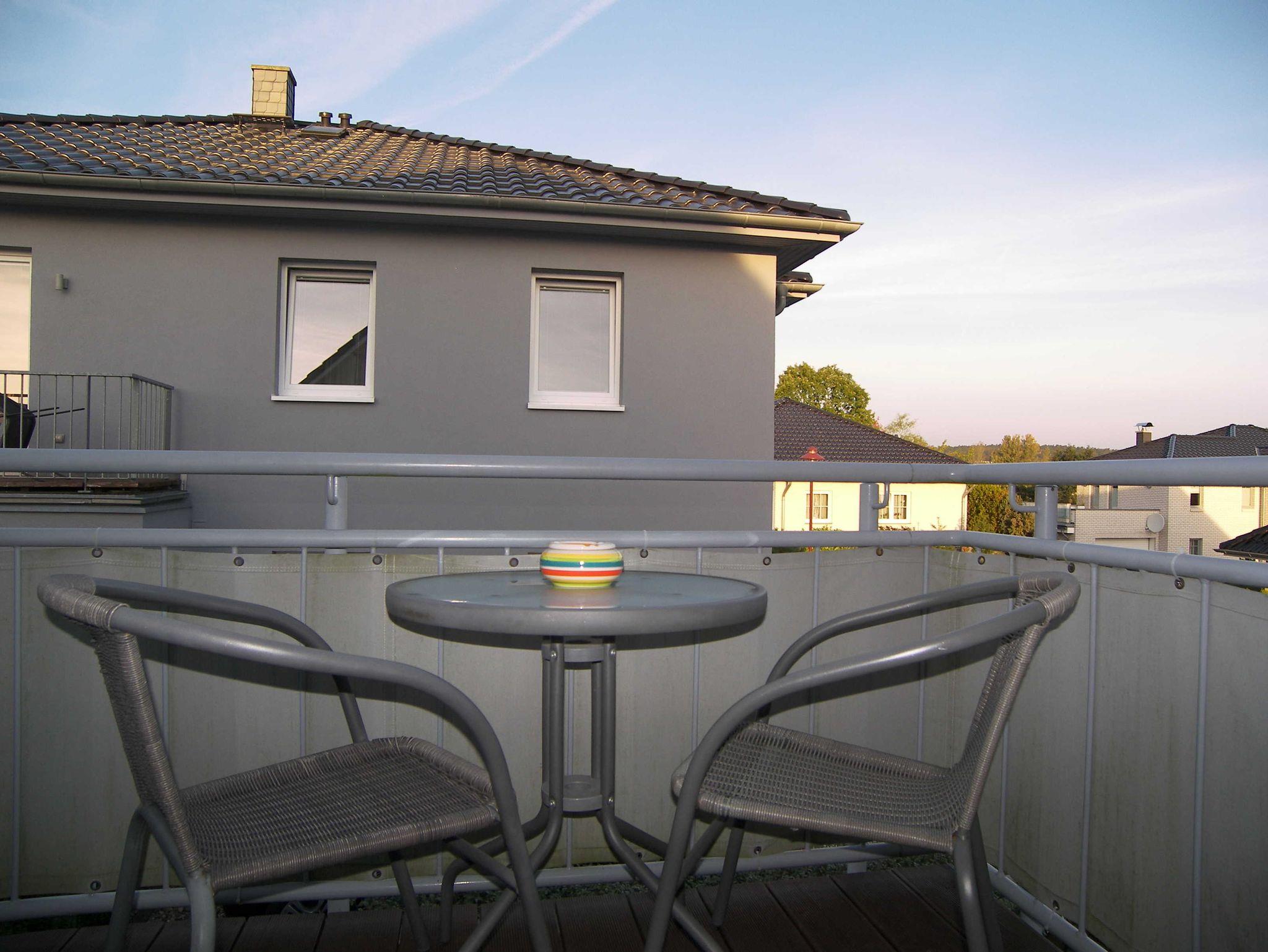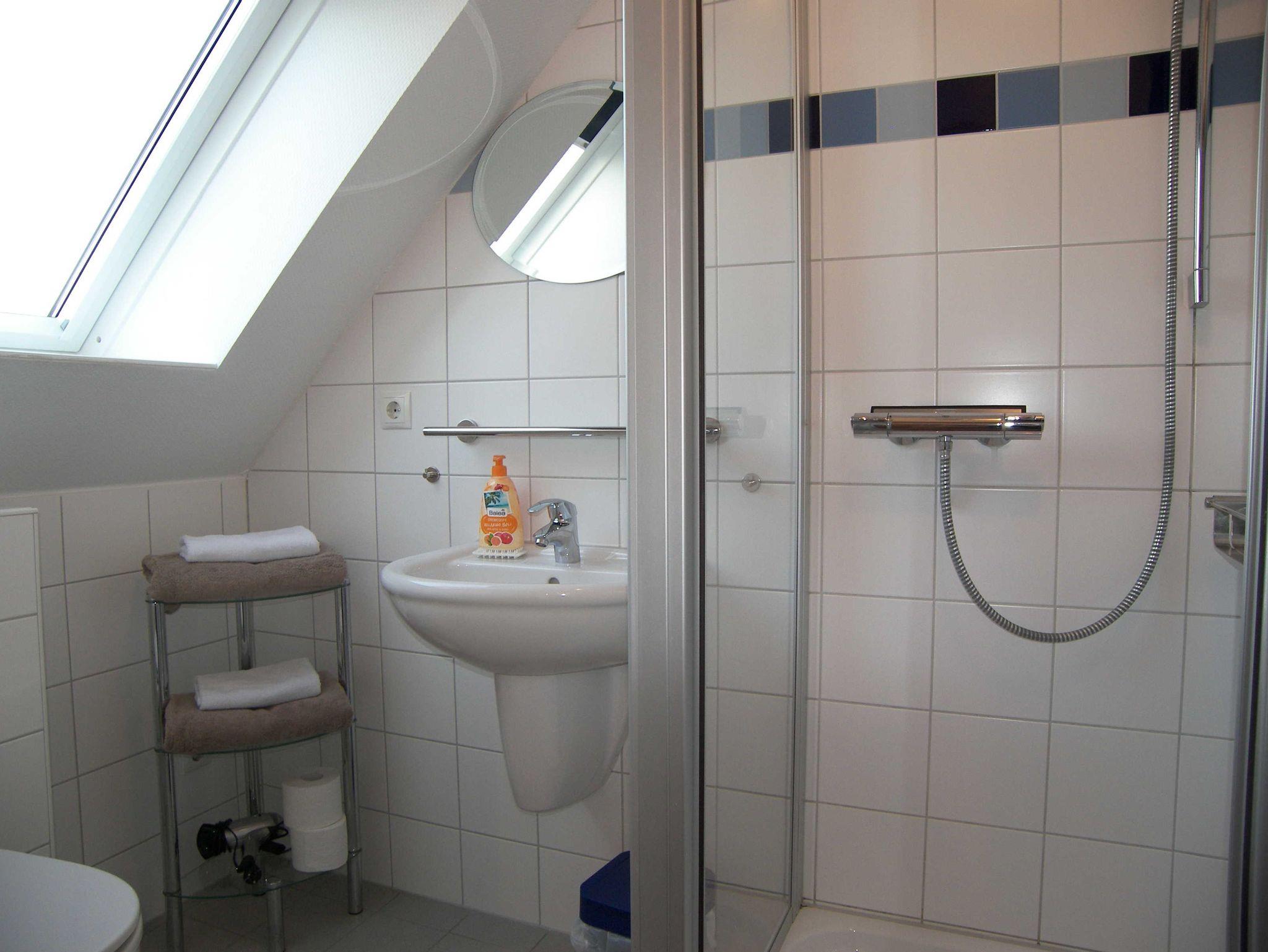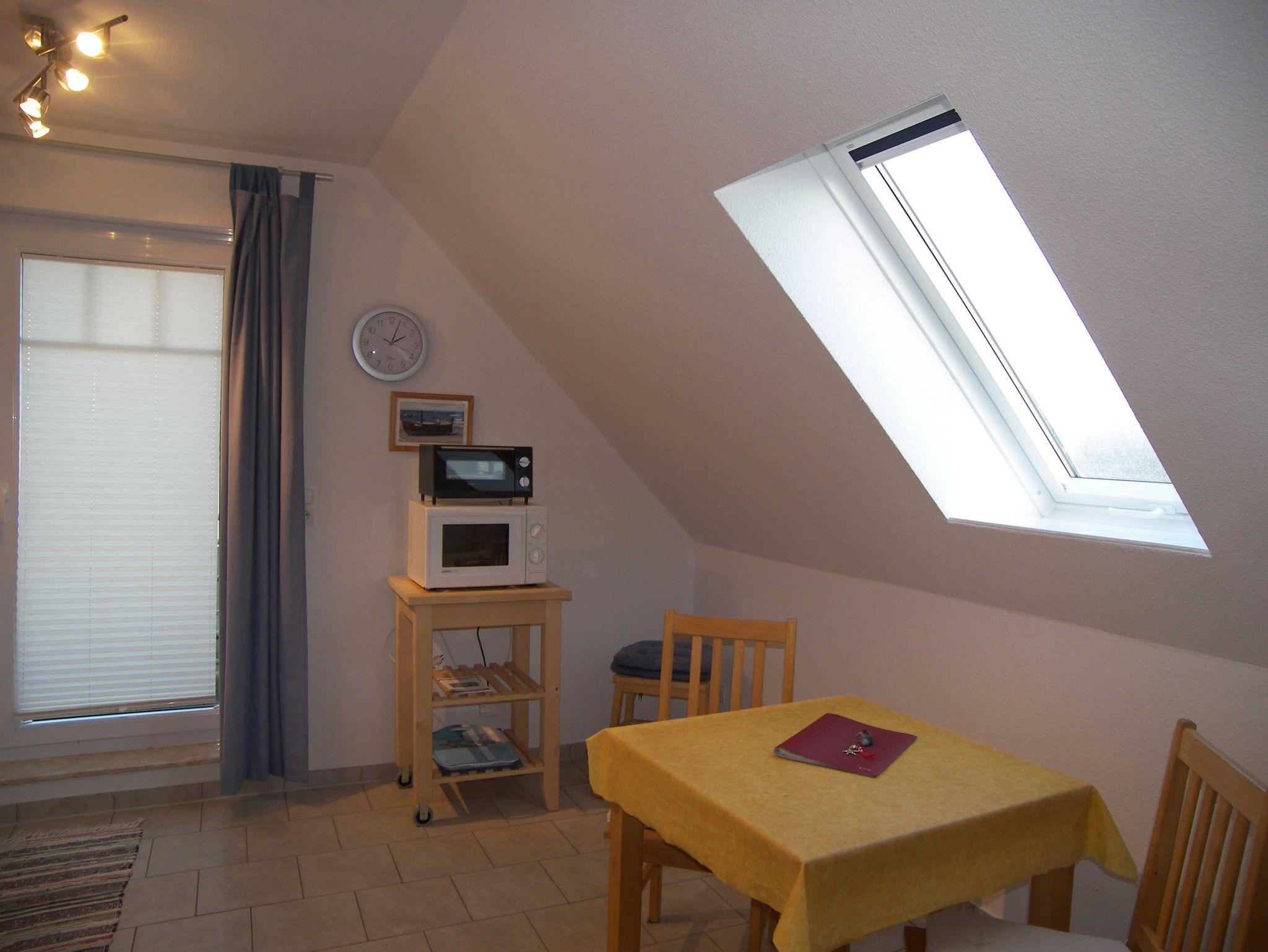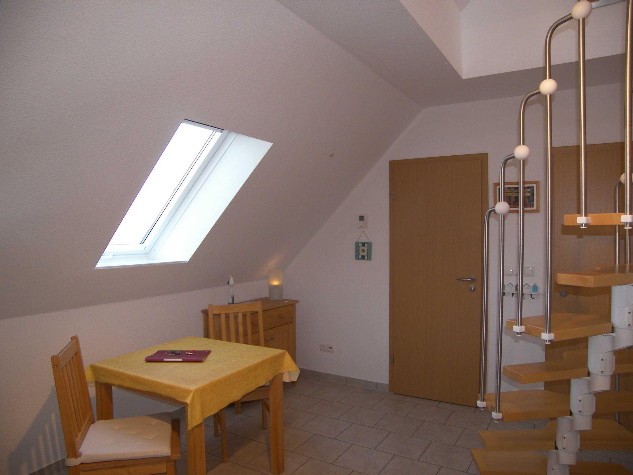 Die ca. 58qm große, modern eingerichtete Maisonette-Ferienwohnung befindet sich im 1. OG und Dachgeschoss. Auf der unteren Ebene befindet sich der Essbereich und die Küchenzeile mit Cerankochfeld, Mikrowelle, Geschirrspüler, Kühlschrank, Kaffeemaschine, Toaster und Wasserkocher. Vom Essbereich aus, gelangen Sie auf den sonnigen Balkon. Ebenfalls befindet sich das Badezimmer mit Dusche/WC und Haartrockner auf der unteren Ebene. Über eine Raumspartreppe erreichen Sie den Wohn- und Schlafbereich mit Sitzecke und TV sowie einem Doppelbett ausgestattet. Bitte beachten Sie, dass eine Raumspartreppe sehr steil ist und für ältere Gäste nicht geeignet ist.